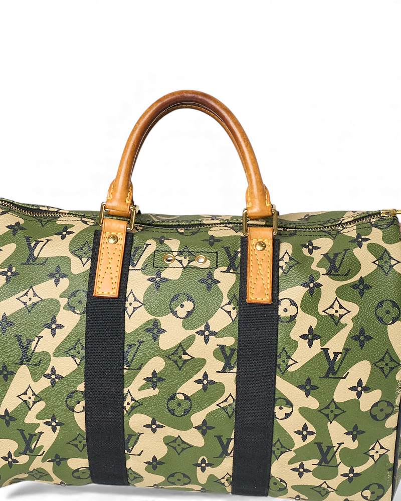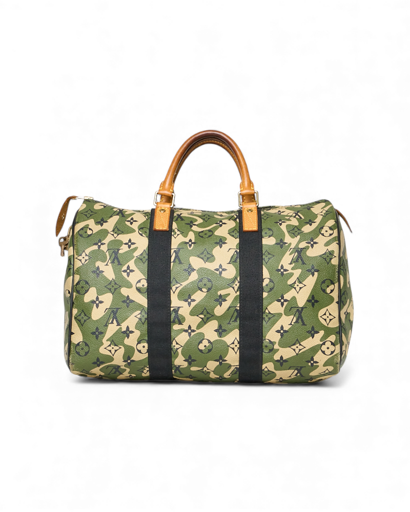 Borsa Louis Vuitton modello Speedy 35, edizione limitata realizzata in collaborazione con l’artista Takashi Murakami. Realizzato in tela monogramouflage nella sofisticata colorazione verde, arricchito da inserti in vacchetta e hardware dorati. Dotato di una chiusura superiore a zip e un interno rivestito in tela verde, con comoda tasca che offrono ampio spazio per i tuoi oggetti. I doppi manici in vacchetta consentono di portarla a mano, completo di lucchetto senza chiavi. Prodotta nel 2008, si presenta in buone condizioni.  Un pezzo da collezione che unisce arte e funzionalità, perfetto per gli appassionati del brand e della moda.
