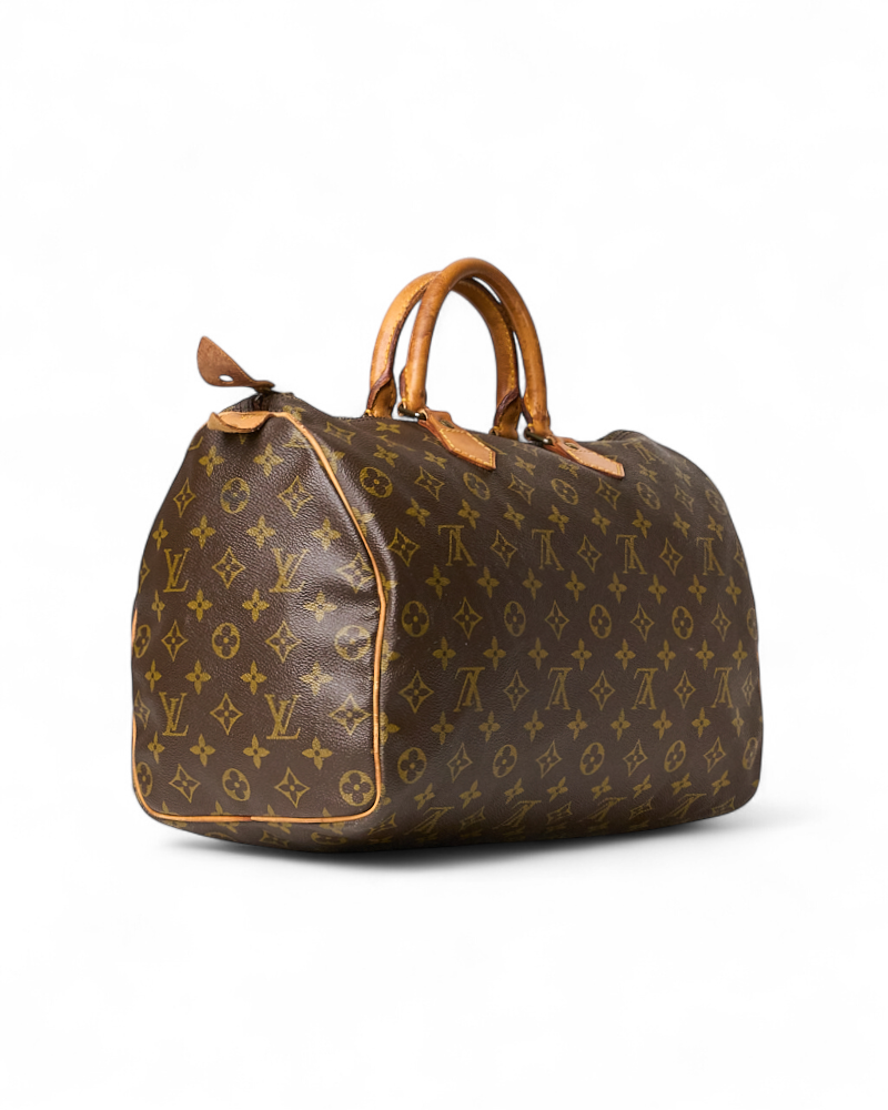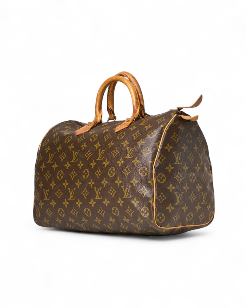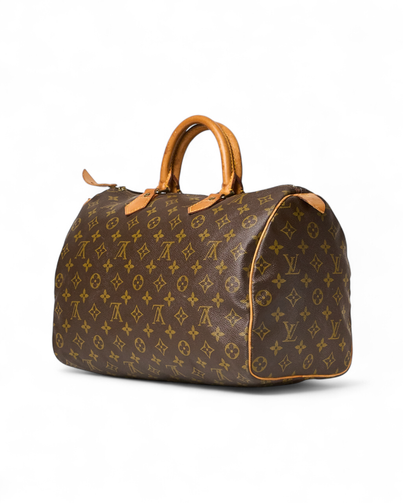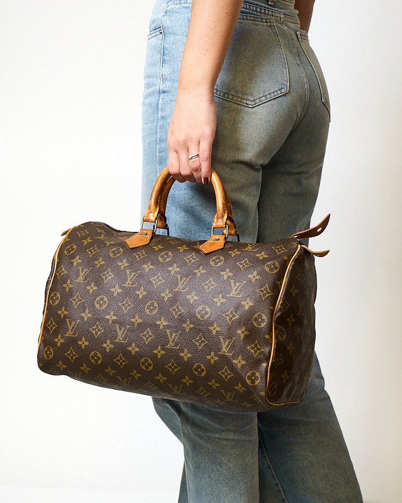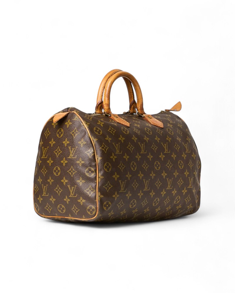 Borsa firmata Louis Vuitton, modello Speedy 35, realizzato in tela nella classica fantasia monogram con inserti in vacchetta e hardware dorato. Dotato di una chiusura superiore a zip, internamente rivestito in tela marrone con comoda tasca, la borsa è abbastanza capiente. Munito di doppio manico in vacchetta, per una comoda portata a mano. L’articolo si presenta in buone condizioni.