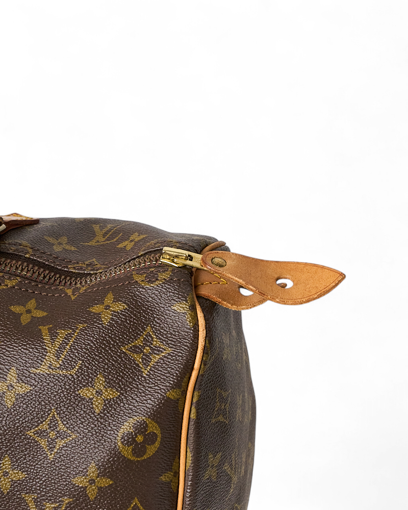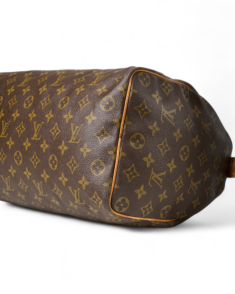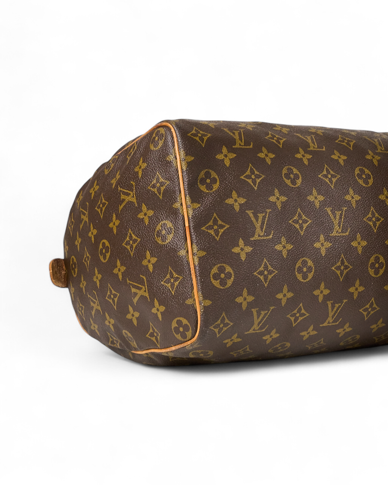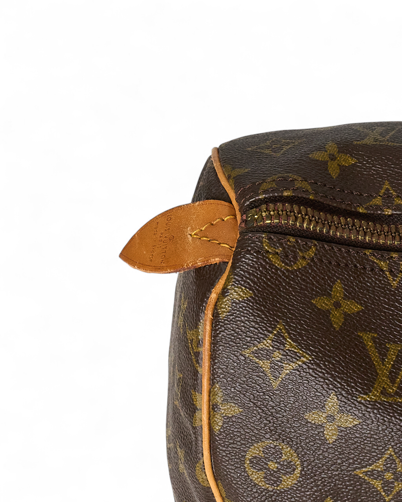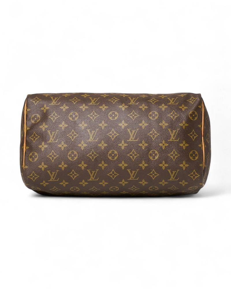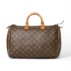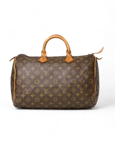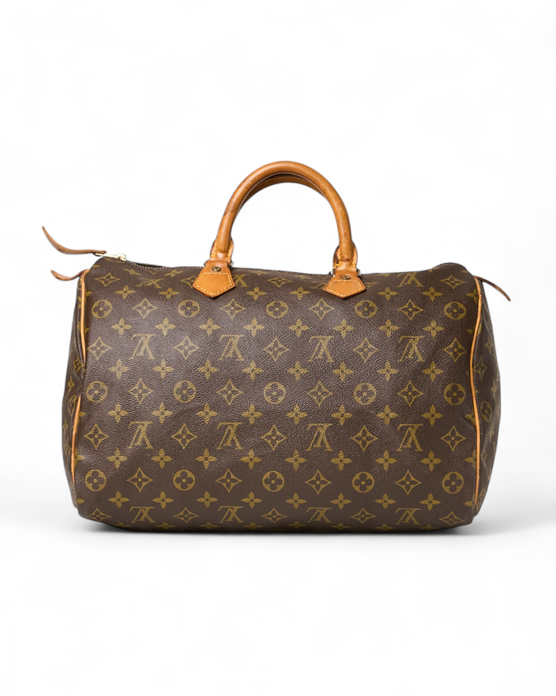 Borsa firmata Louis Vuitton, modello Speedy 35, realizzato in tela nella classica fantasia monogram con inserti in vacchetta e hardware dorato. Dotato di una chiusura superiore a zip, internamente rivestito in tela marrone con comoda tasca, la borsa è abbastanza capiente. Munito di doppio manico in vacchetta, per una comoda portata a mano. L’articolo si presenta in buone condizioni.