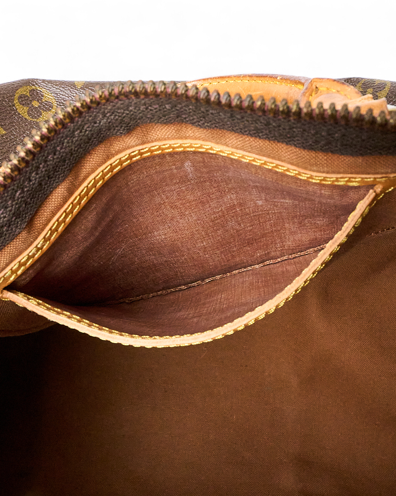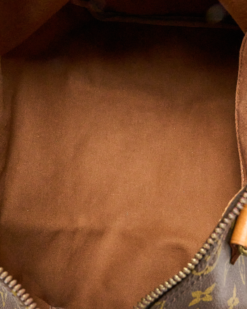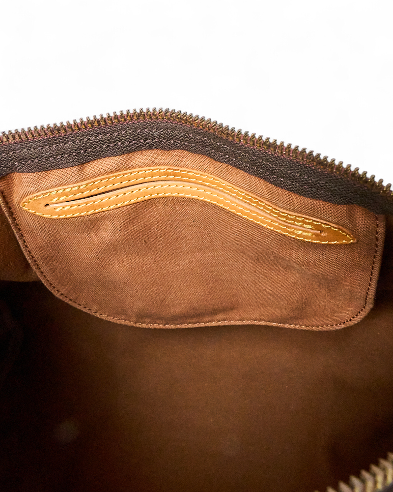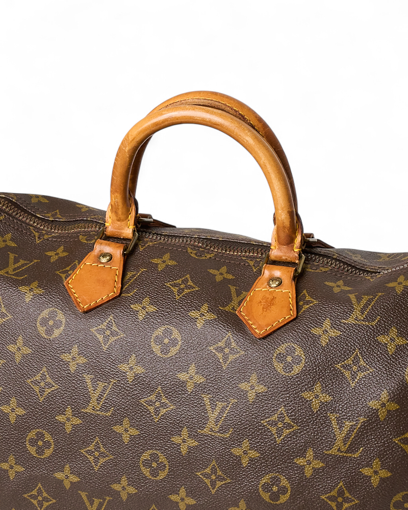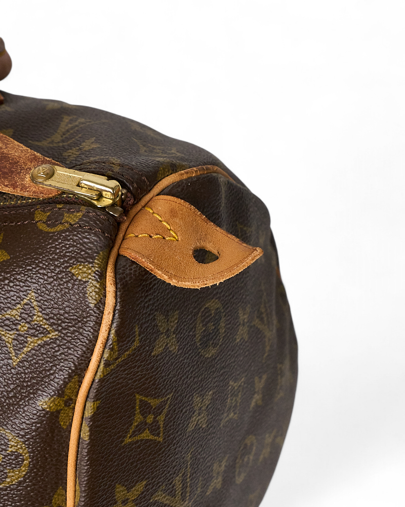 Borsa firmata Louis Vuitton, modello Speedy 35, realizzato in tela nella classica fantasia monogram con inserti in vacchetta e hardware dorato. Dotato di una chiusura superiore a zip, internamente rivestito in tela marrone con comoda tasca, la borsa è abbastanza capiente. Munito di doppio manico in vacchetta, per una comoda portata a mano. L’articolo si presenta in buone condizioni.