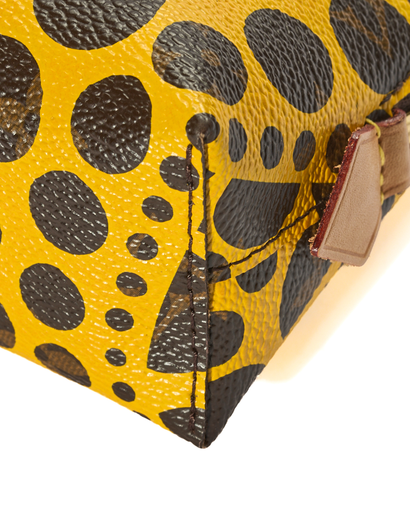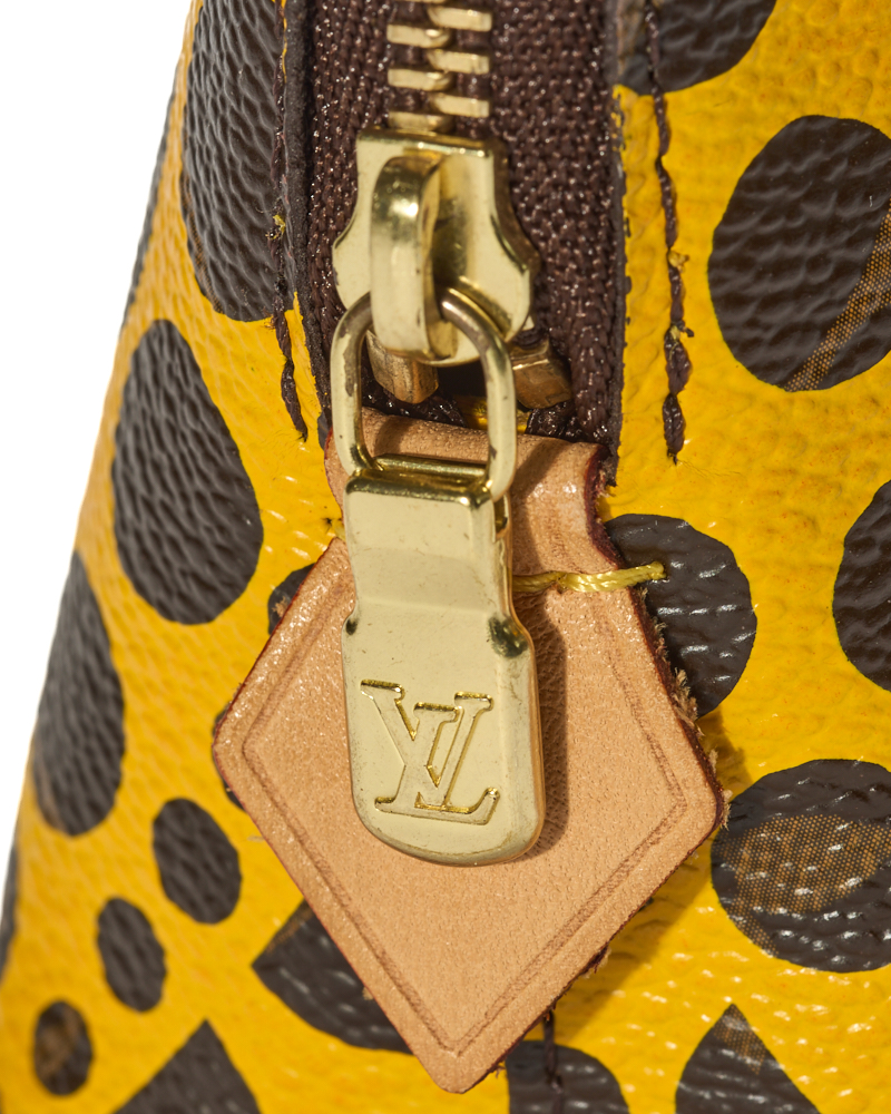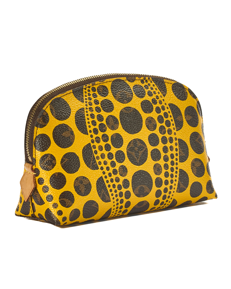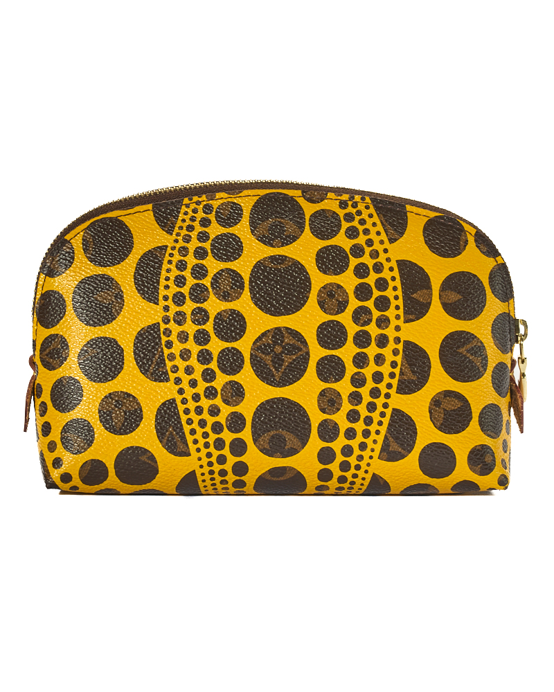 Pochette firmata Louis Vuitton, in collaborazione per Yayoi Kusama, modello Cosmetique nella misura PM, realizzato in tela arricchita da pois gialli e hardware dorato. Dotato di una chiusura semicircolare a zip, internamente rivestito in pelle giallo con comoda tasca, la pochette è capiente per l’essenziale. L’articolo si presenta in ottime condizioni.