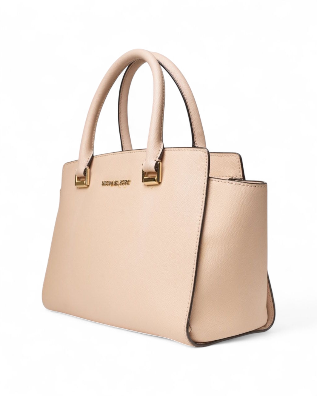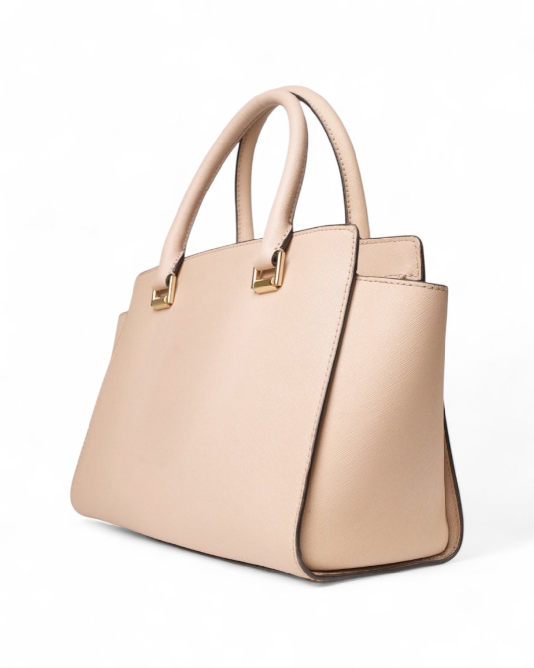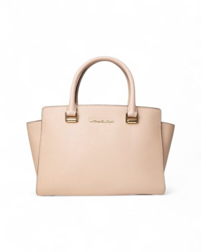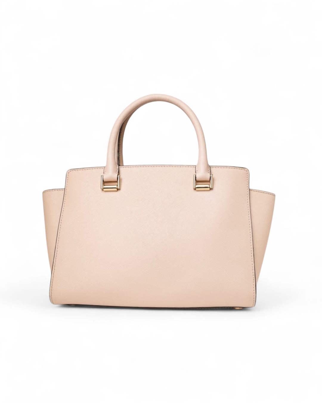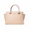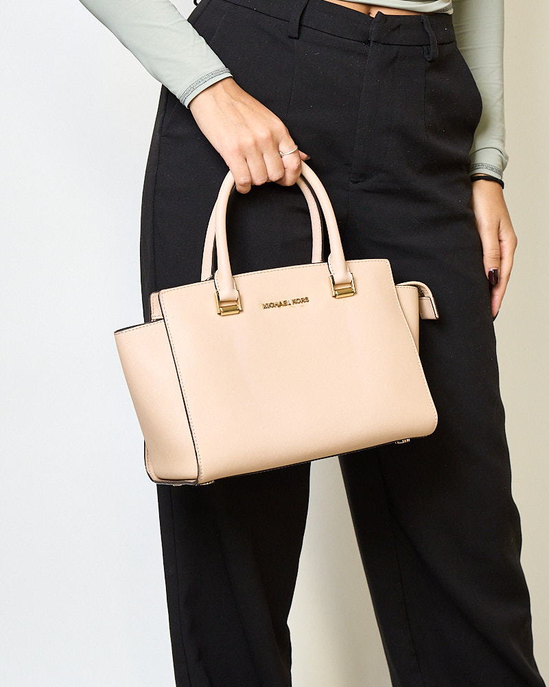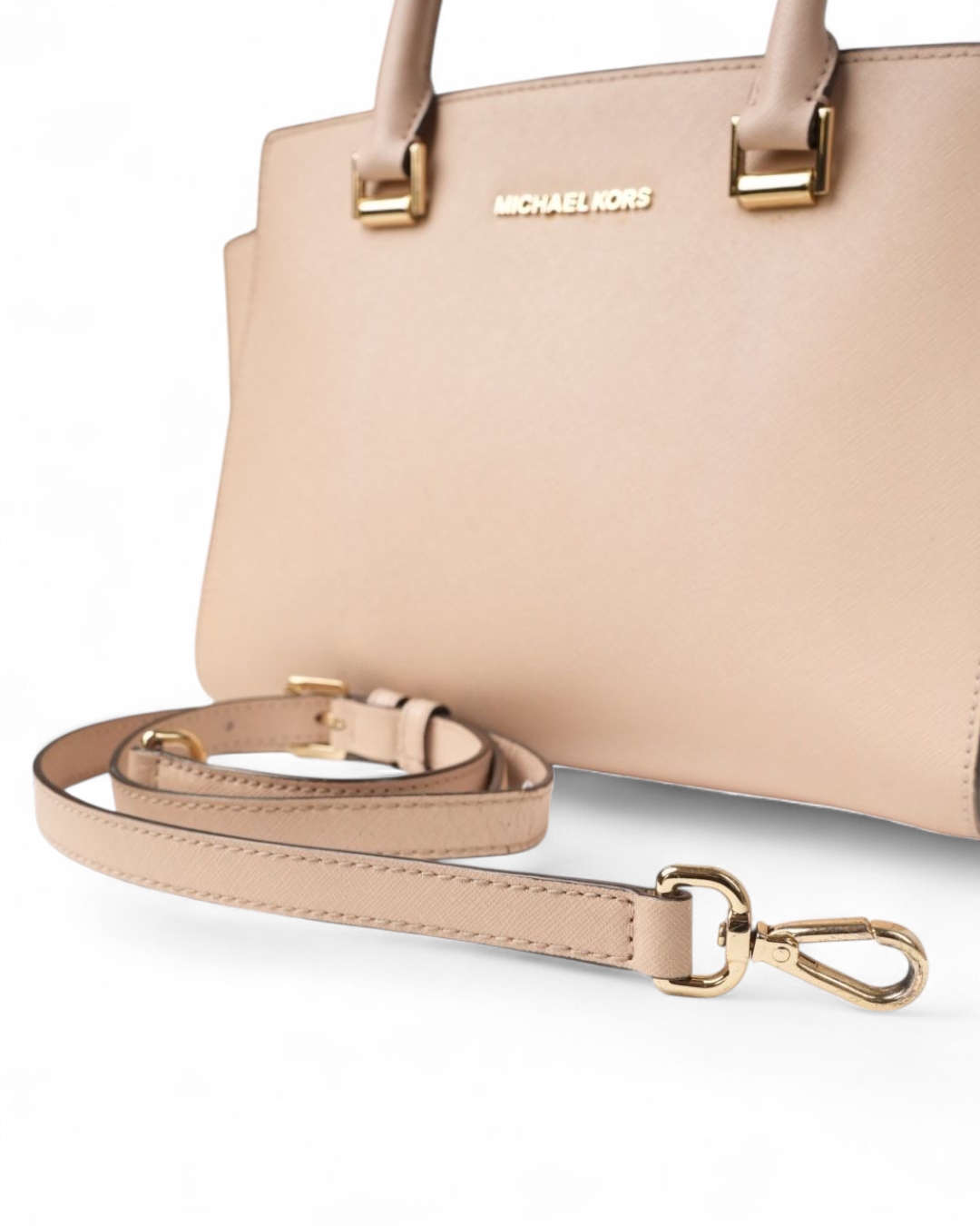 Borsa firmata Michael Kors, modelo Selma nella misura medium, realizzata in pelle saffiano nella colorazione rosa con hardware dorato. Dotata di una chiusura superiore a zip, internamente rivestita in raso logato beige con due comode tasche, la borsa è abbastanza capiente. Munita di doppio manico e di una tracolla rimovibile e regolabile, per una comoda portata a spalla o a tracolla. L’articolo si presenta in buone condizioni.