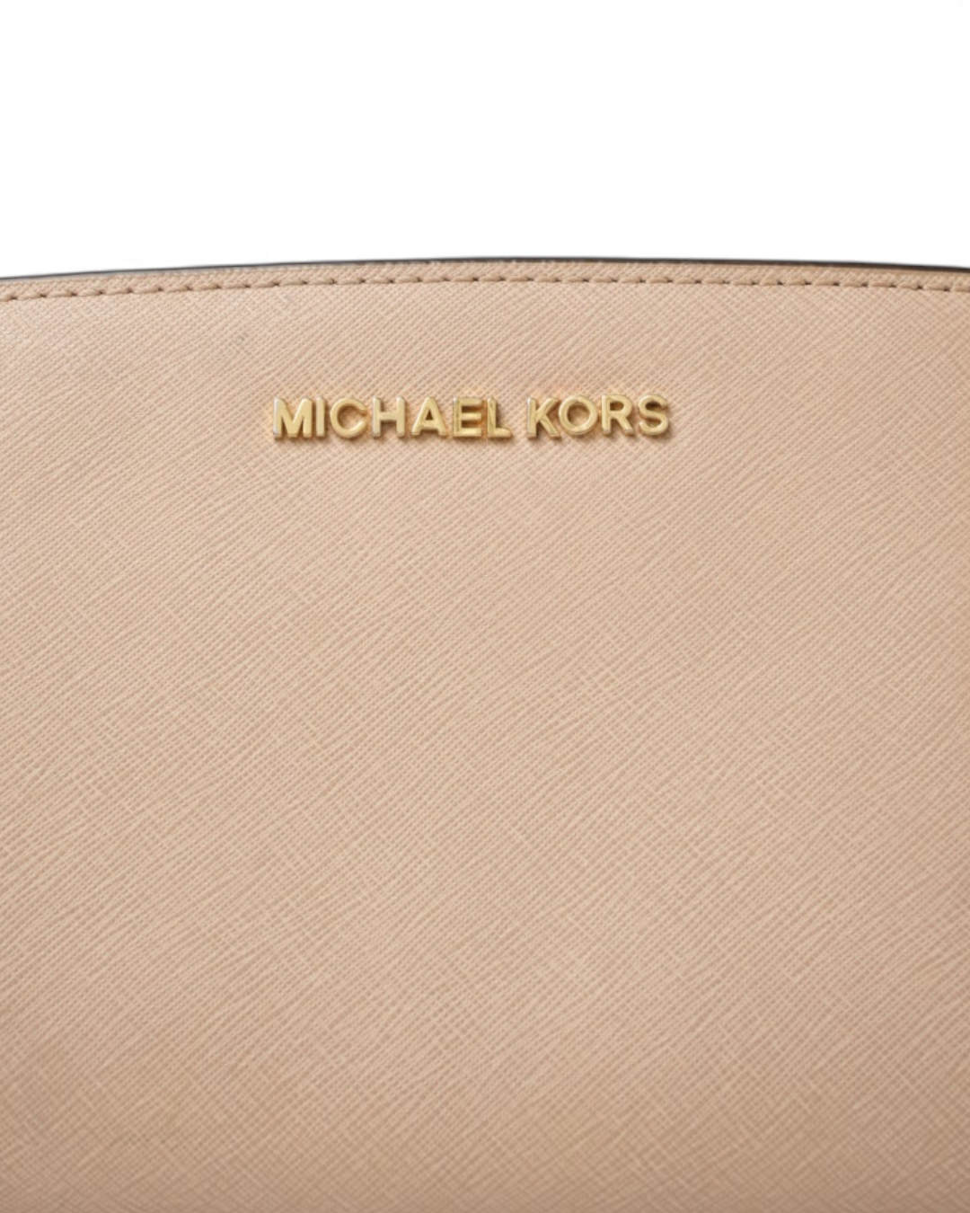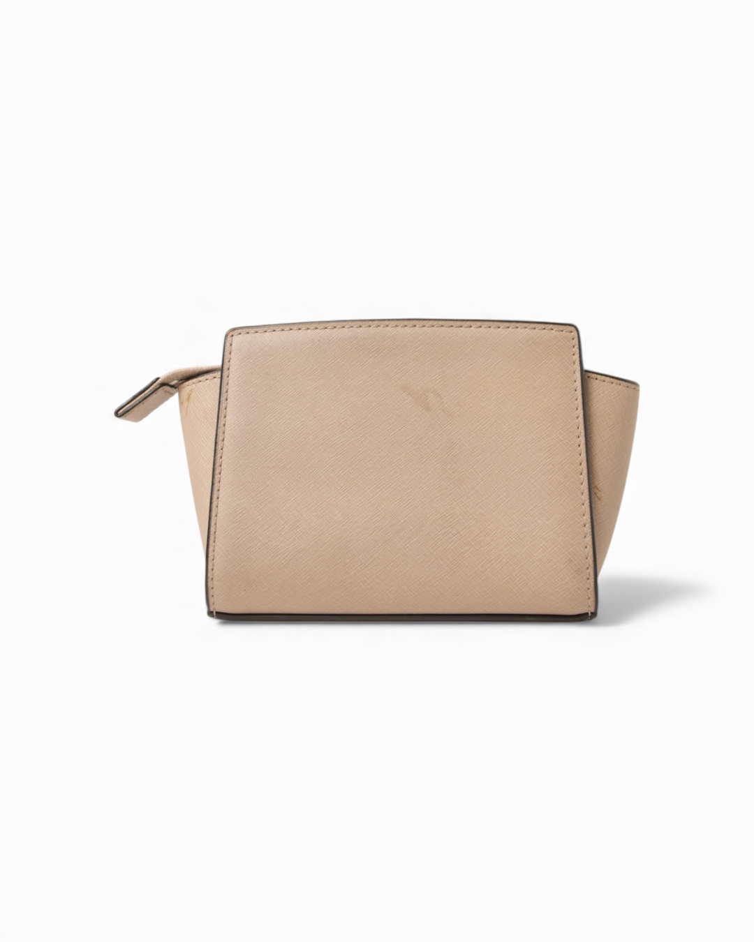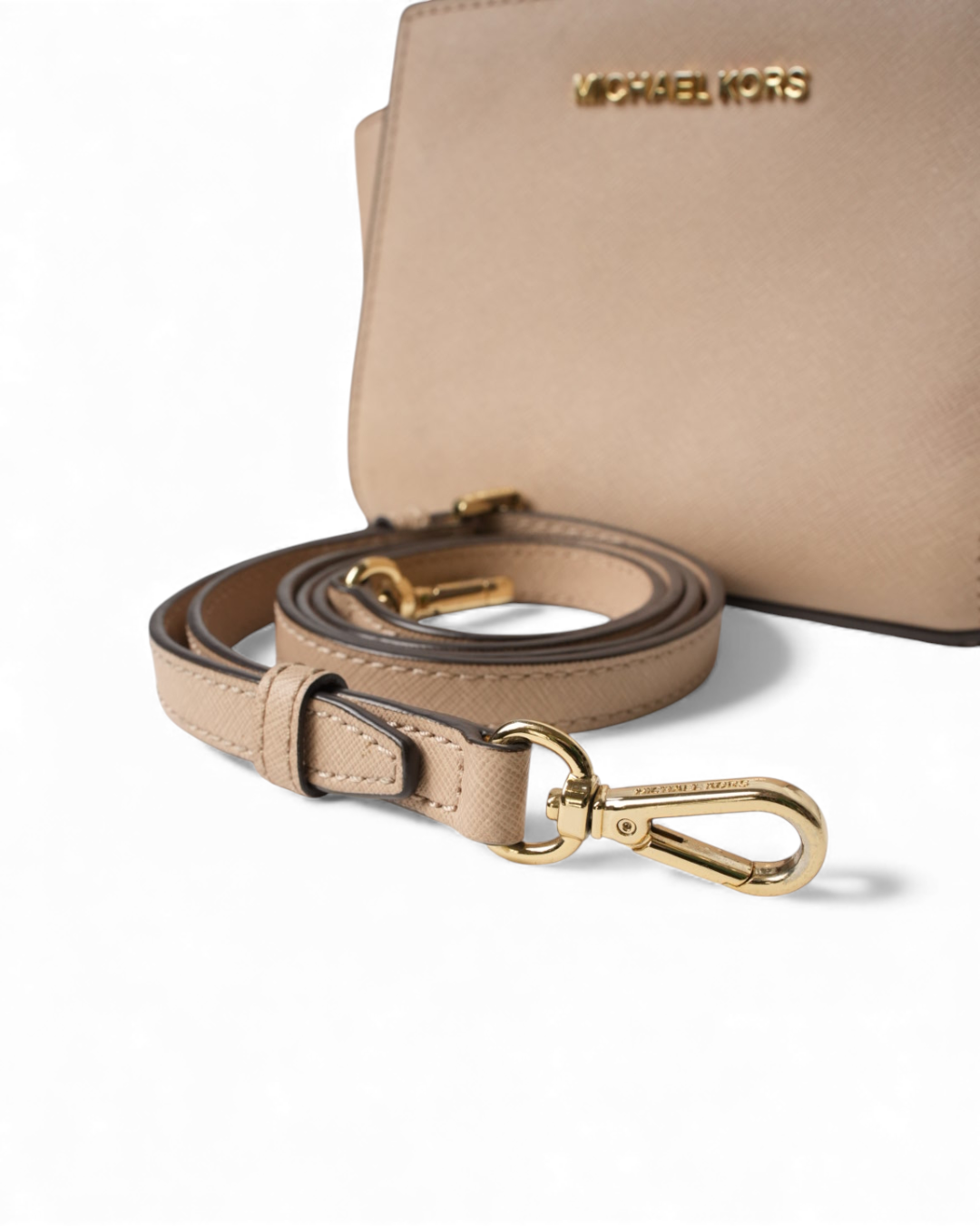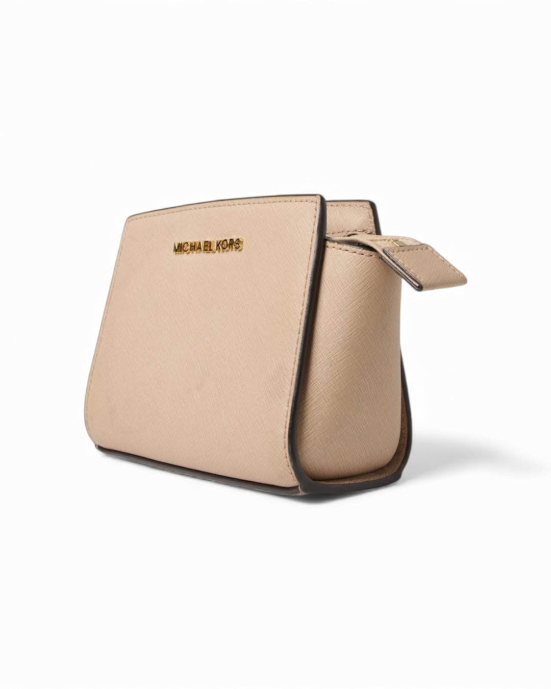 Borsa firmata Michael Kors, modello Selma nella misura mini, realizzata in pelle saffiano nella colorazione cipria con hardware dorato. Dotata di una chiusura superiore a zip, internamente rivestita in tessuto logato beige con comode fessure per documenti, la borsa è capiente per l’essenziale. Munita di una tracolla regolabile e rimovibile, per una comoda portata a spalla o a tracolla. L’articolo si presenta in buone condizioni.