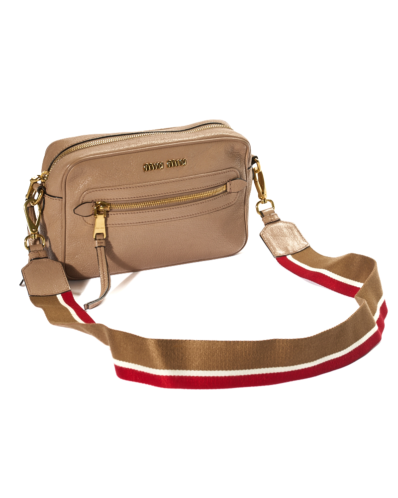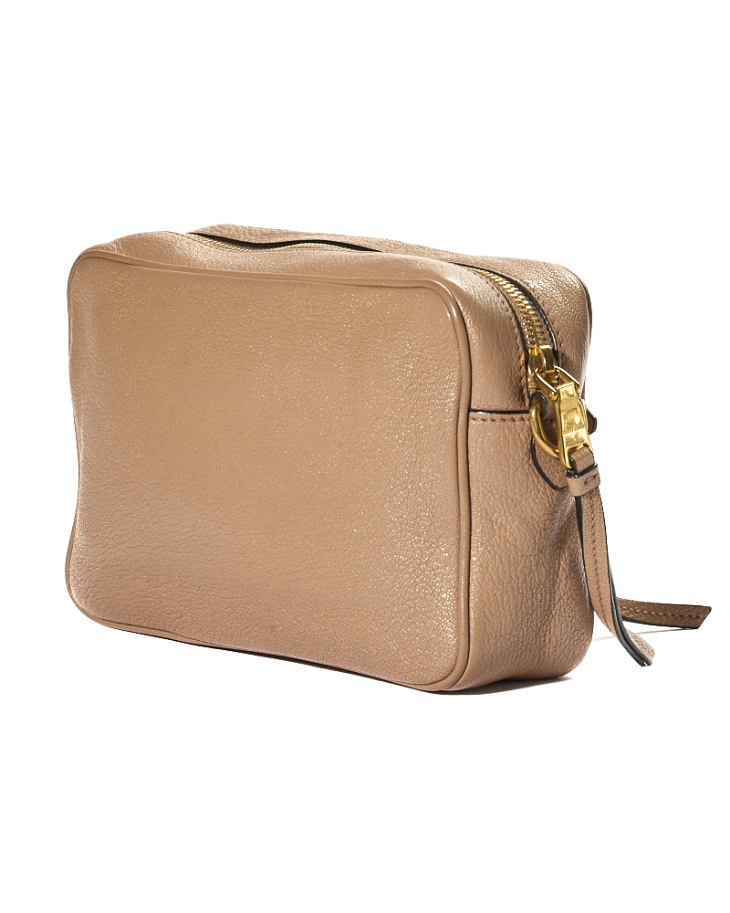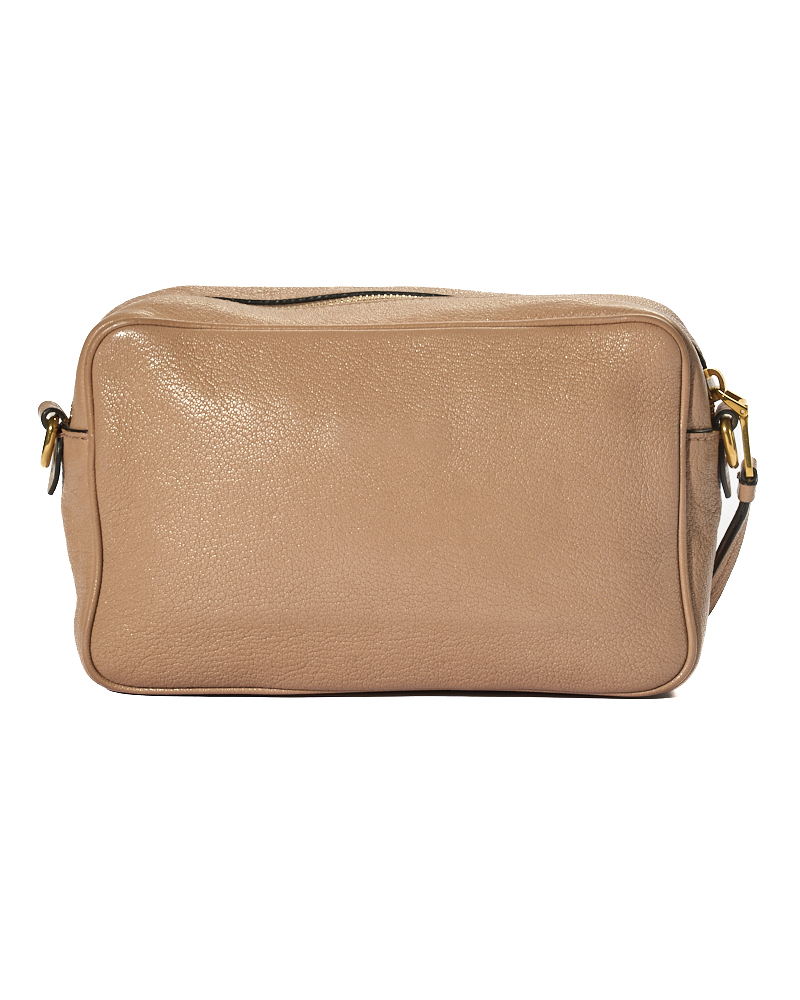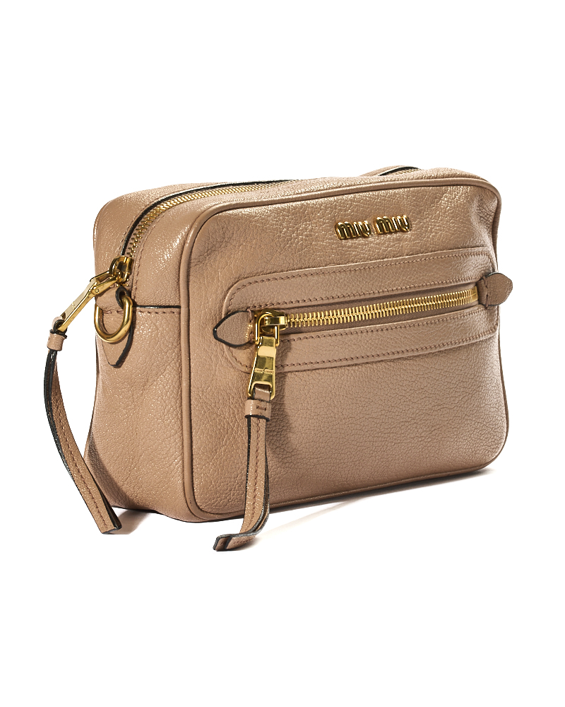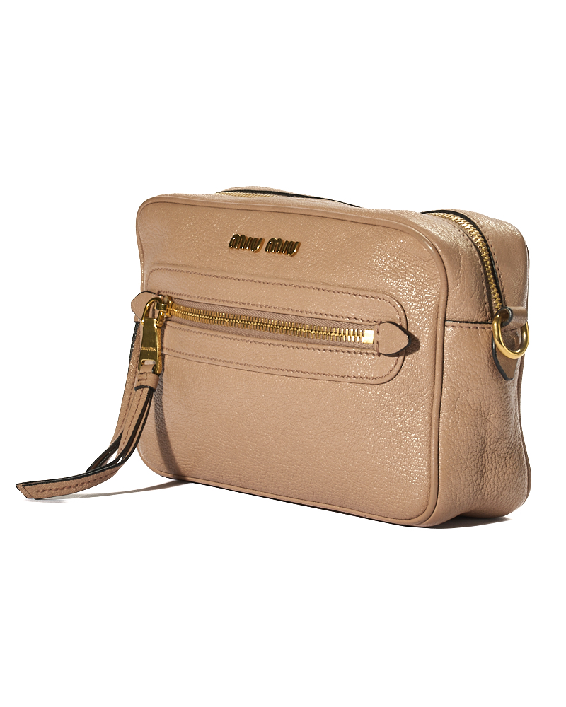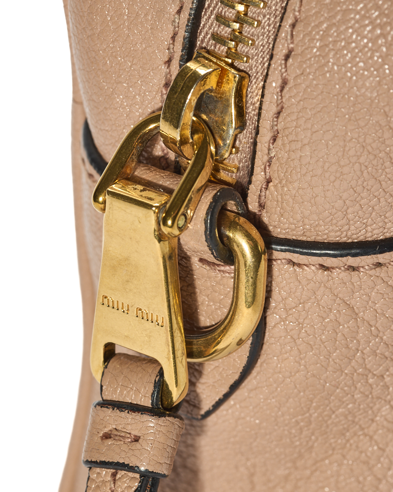 Borsa firmata Miu Miu, modello camera bag nella misura small, realizzata in pelle granulata cipria con hardware dorato. Dotata di una chiusura superiore a zip, internamente rivestita in raso rosa con comoda tasca, la borsa è abbastanza capiente. Munita di una tracolla rimovibile in tessuto, per una comoda portata a spalla o a tracolla. Arricchita da una comoda tasca sulla parte frontale. L’articolo si presenta in buone condizioni.