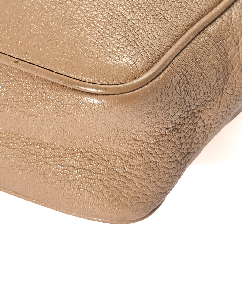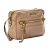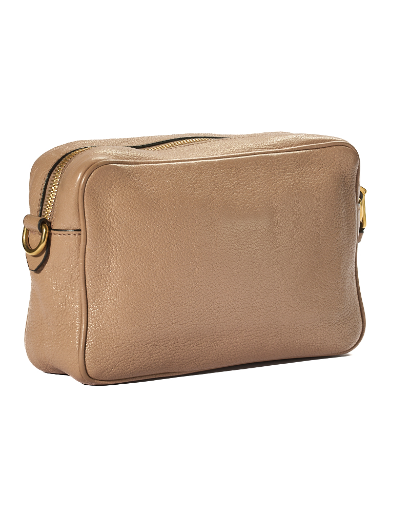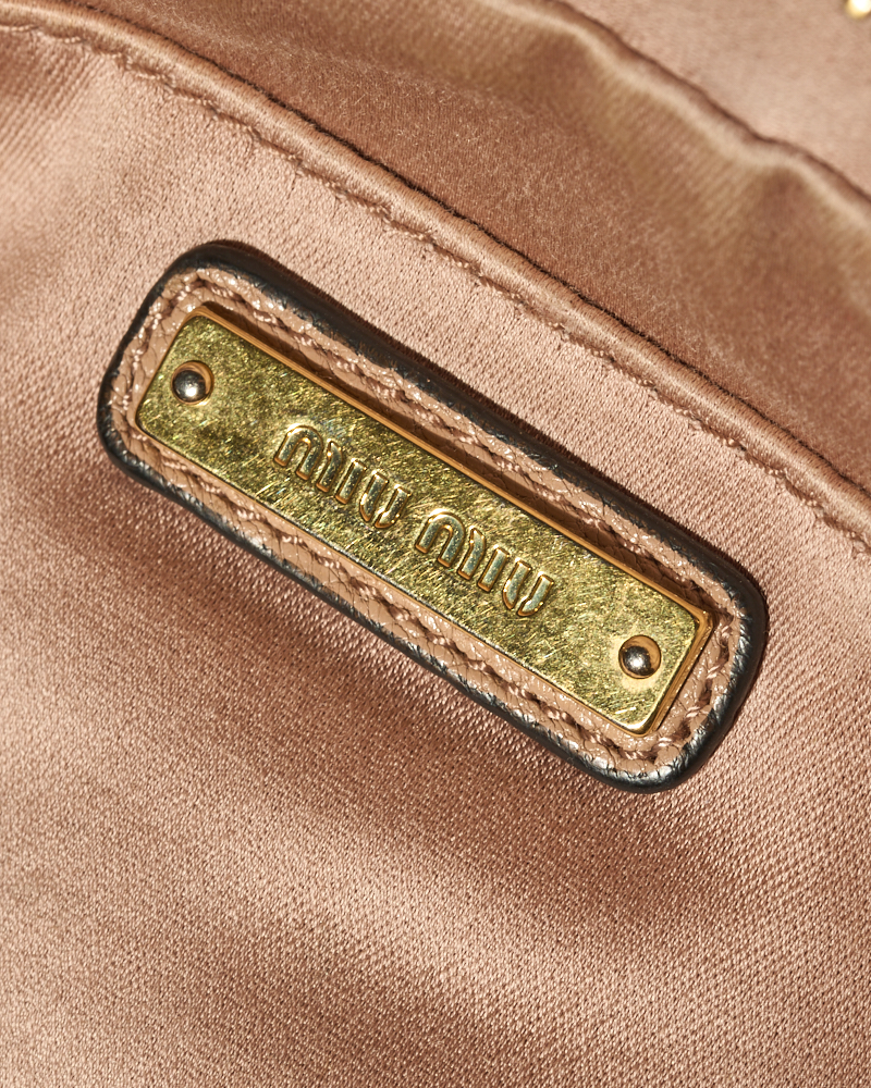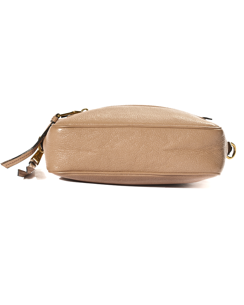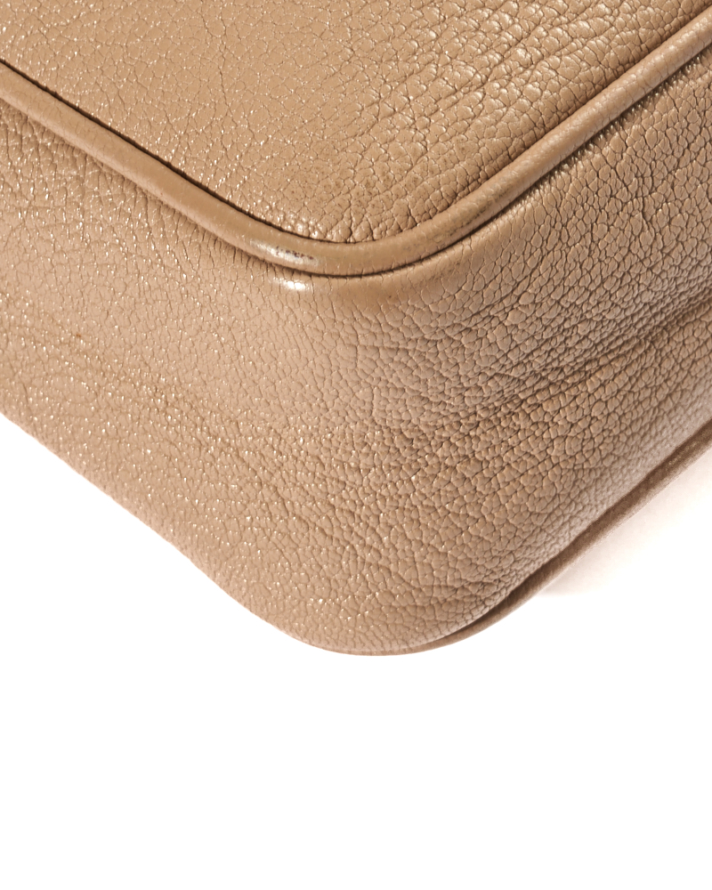 Borsa firmata Miu Miu, modello camera bag nella misura small, realizzata in pelle granulata cipria con hardware dorato. Dotata di una chiusura superiore a zip, internamente rivestita in raso rosa con comoda tasca, la borsa è abbastanza capiente. Munita di una tracolla rimovibile in tessuto, per una comoda portata a spalla o a tracolla. Arricchita da una comoda tasca sulla parte frontale. L’articolo si presenta in buone condizioni.