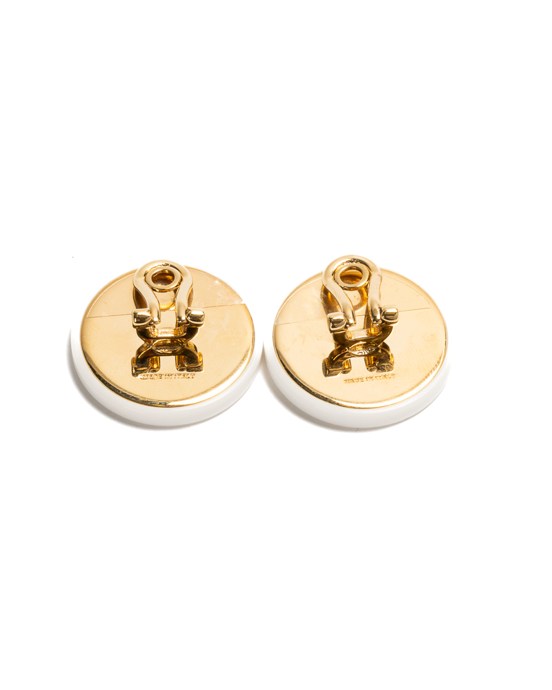 Orecchini firmati Miu Miu, realizzato in metallo bianco con logo goffrato nella parte anteriore e chiusura a pressione. L’articolo si presenta in condizioni pari al nuovo.
