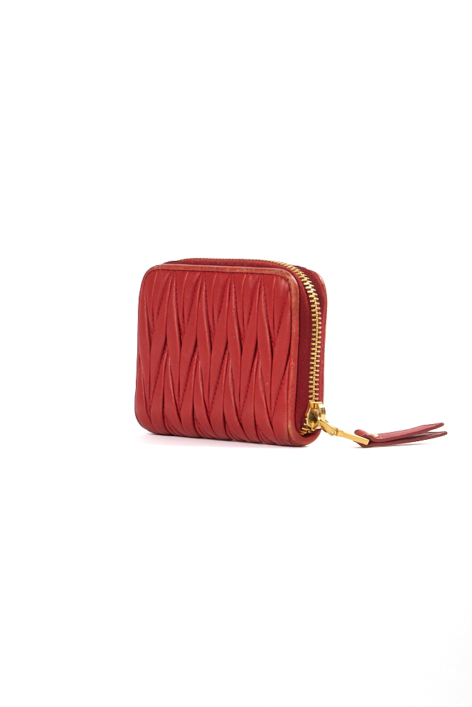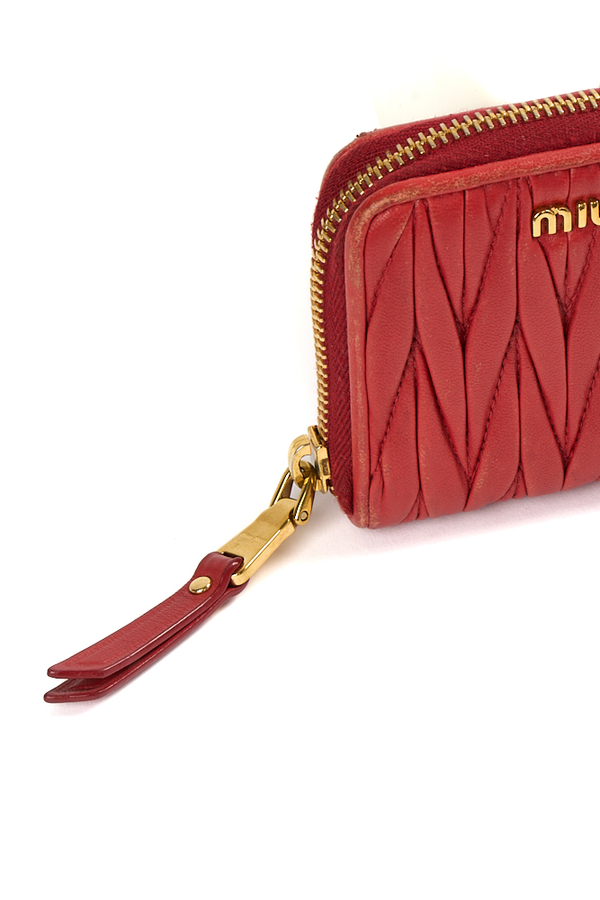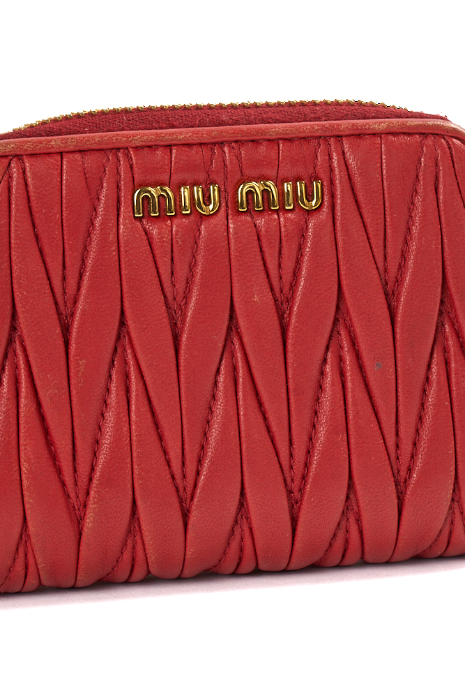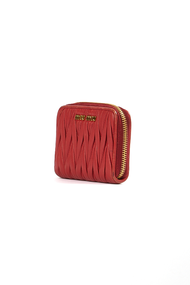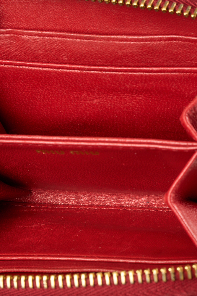 Portafoglio firmato Miu Miu, realizzato in pelle groffata rosso con hardware dorato. Dotato di una chiusura semicircolare a zip, internamente rivestito in pelle liscia tono su tono con comode tasche comodo per documenti e banconote, il portafoglio è capiente per l’essenziale. L’articolo si presenta in buone condizioni, con segni di usura visibili in foto.