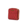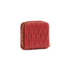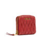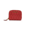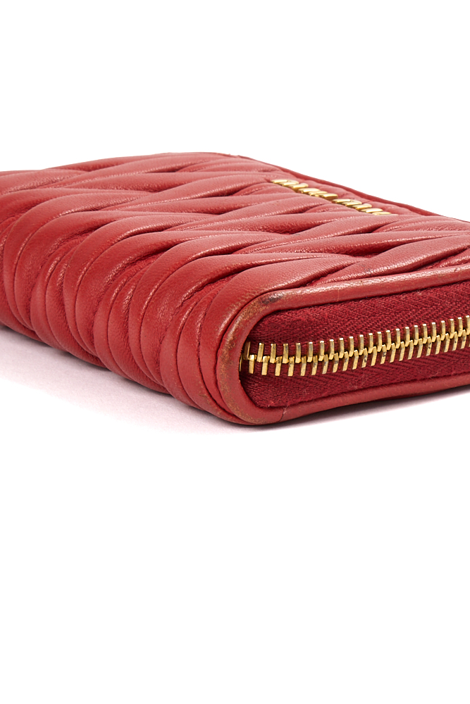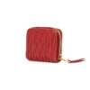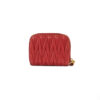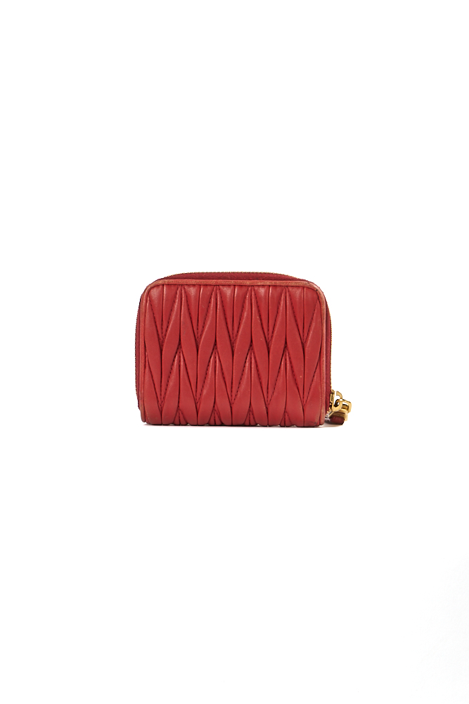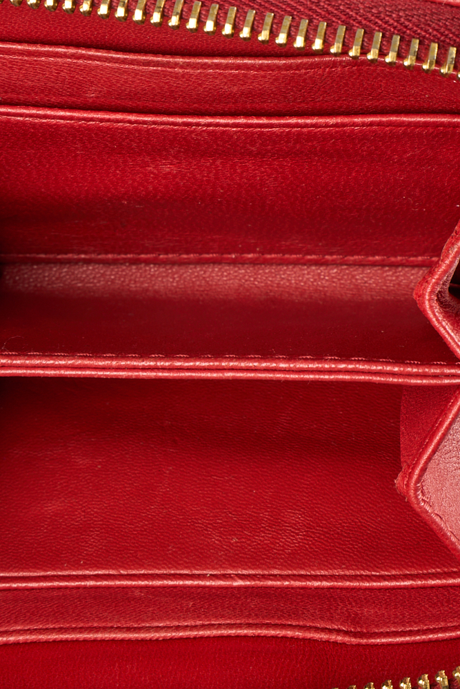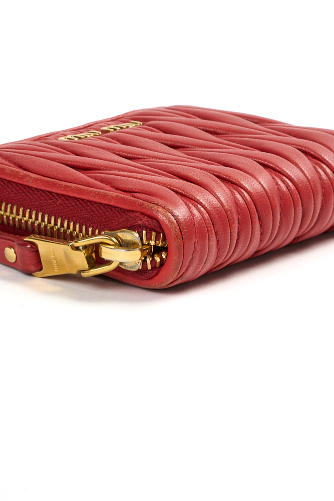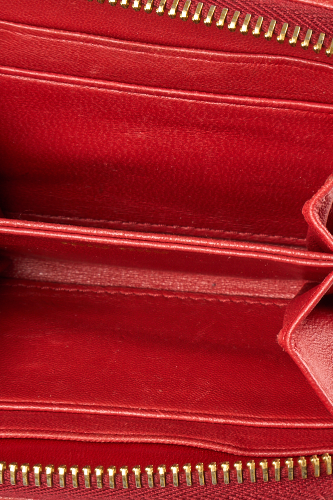 Portafoglio firmato Miu Miu, realizzato in pelle groffata rosso con hardware dorato. Dotato di una chiusura semicircolare a zip, internamente rivestito in pelle liscia tono su tono con comode tasche comodo per documenti e banconote, il portafoglio è capiente per l’essenziale. L’articolo si presenta in buone condizioni, con segni di usura visibili in foto.