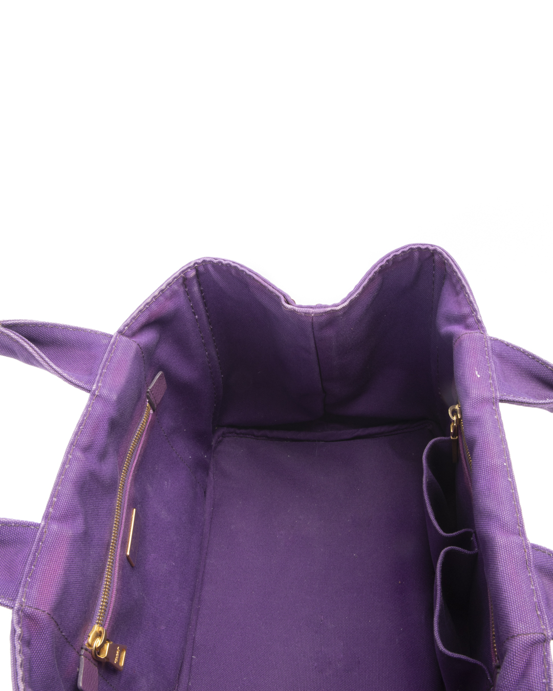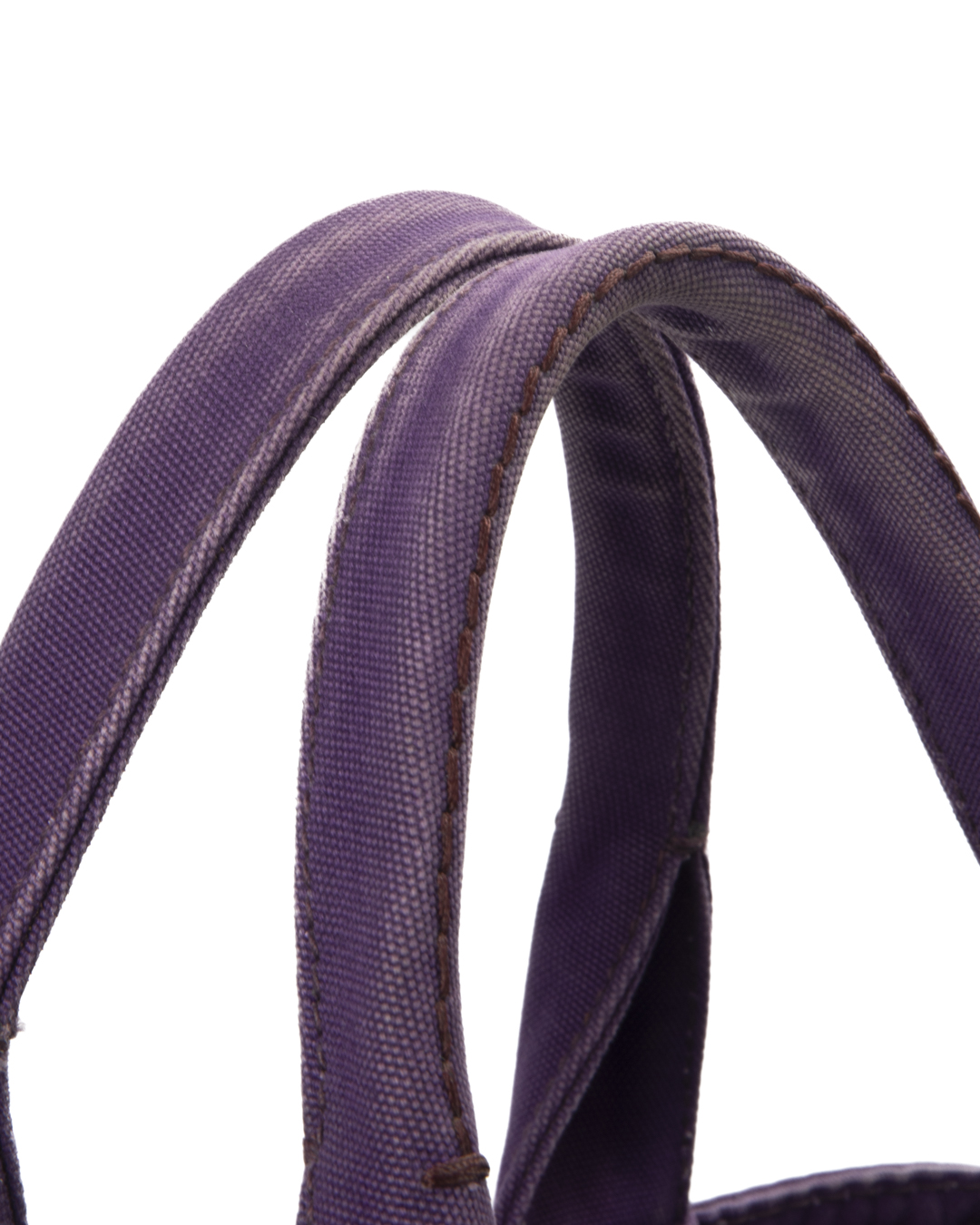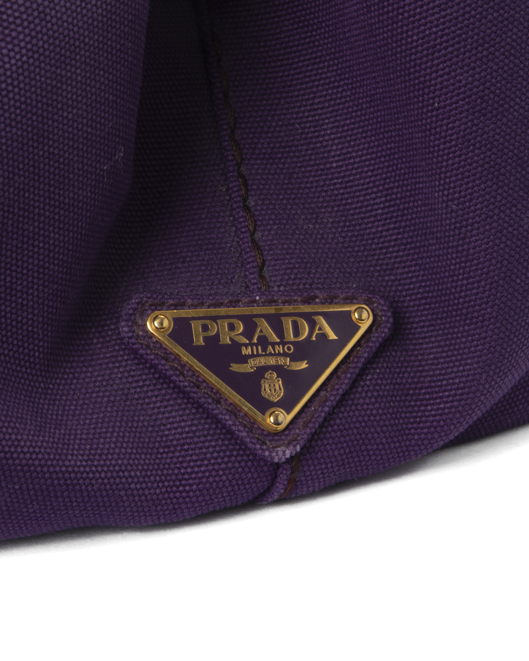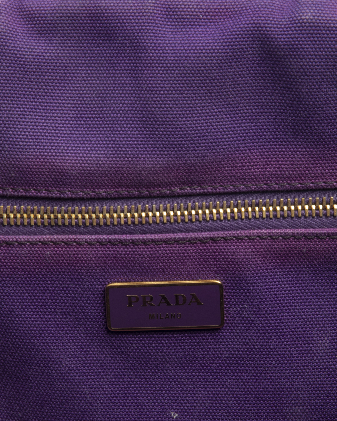 Borsa firmata Prada, modello Canapa nella misura large, realizzata in denim viola con hardware dorata. Non è dotata di nessuna chiusura, internamente rivestita in tela tono su tono con comode tasche, la borsa è abbastanza capiente. Munita di doppio manico e di una tracolla rimovibile e regolabile, per una comoda portata a spalla o a mano. L’articolo si presenta in buone condizioni, con segni di usura visibili in foto.