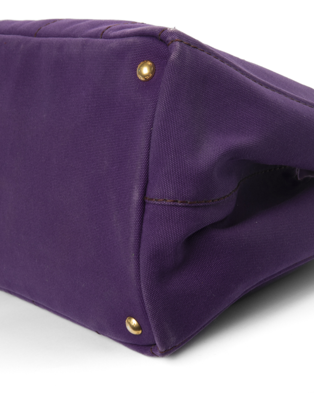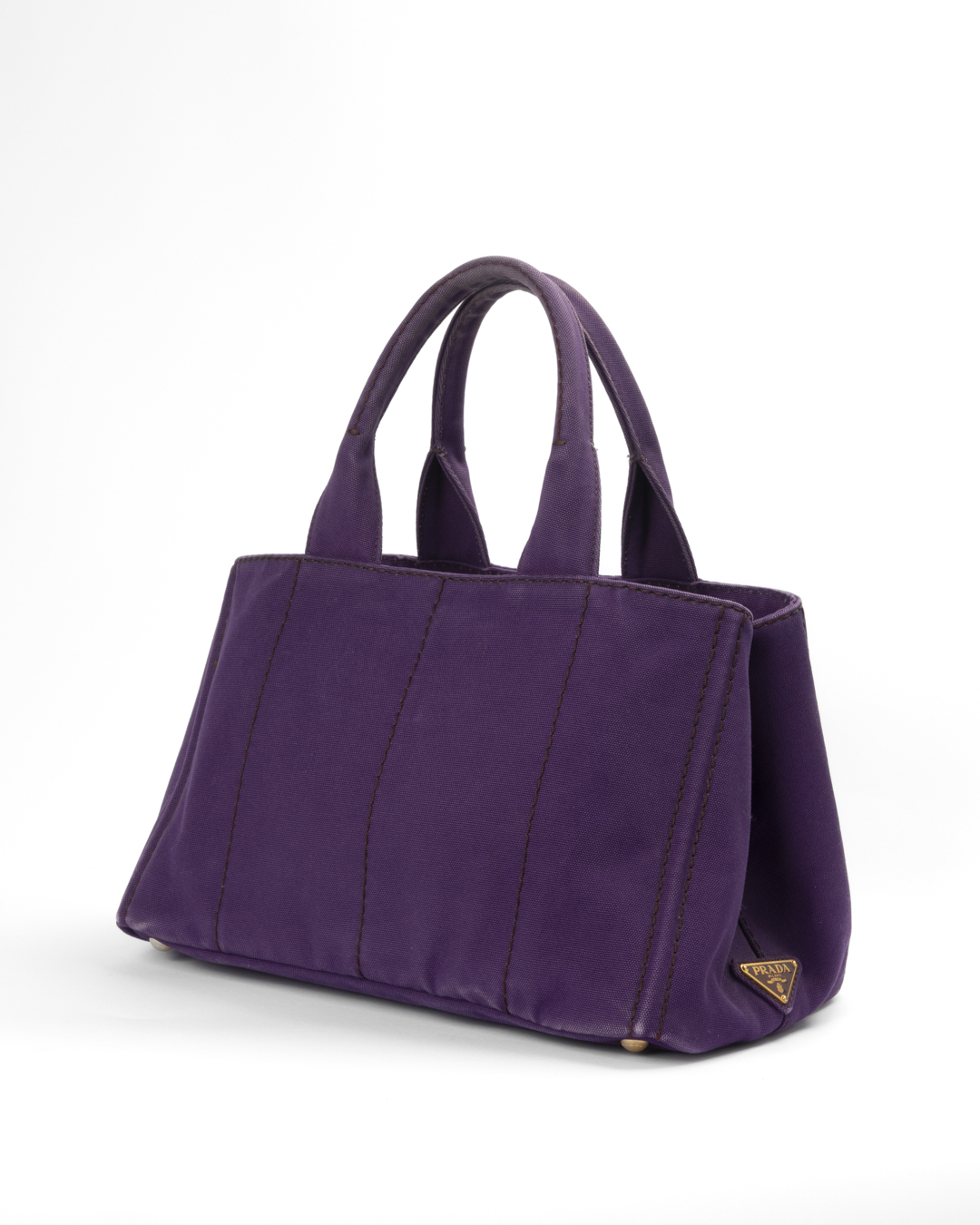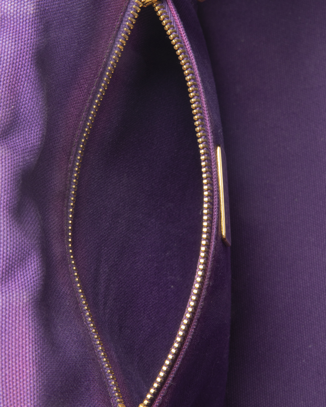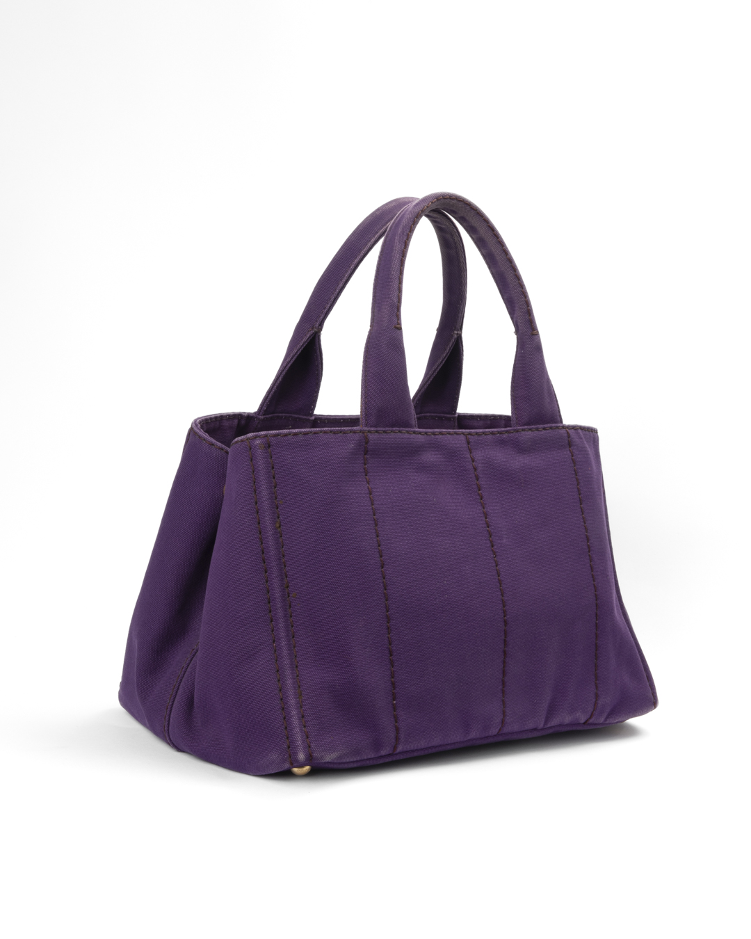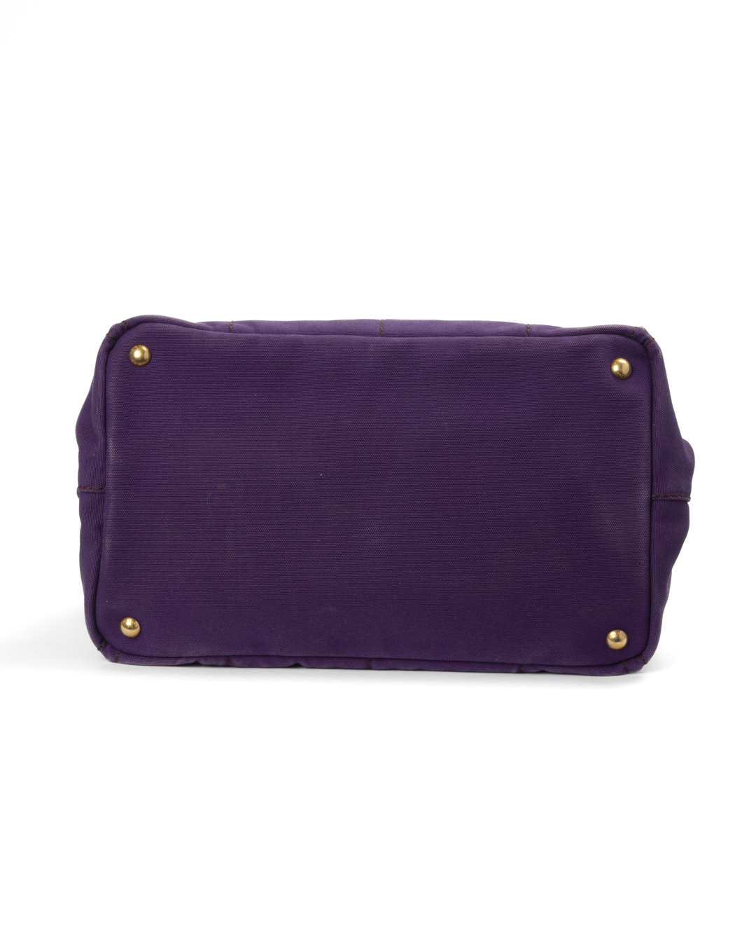 Borsa firmata Prada, modello Canapa nella misura large, realizzata in denim viola con hardware dorata. Non è dotata di nessuna chiusura, internamente rivestita in tela tono su tono con comode tasche, la borsa è abbastanza capiente. Munita di doppio manico e di una tracolla rimovibile e regolabile, per una comoda portata a spalla o a mano. L’articolo si presenta in buone condizioni, con segni di usura visibili in foto.