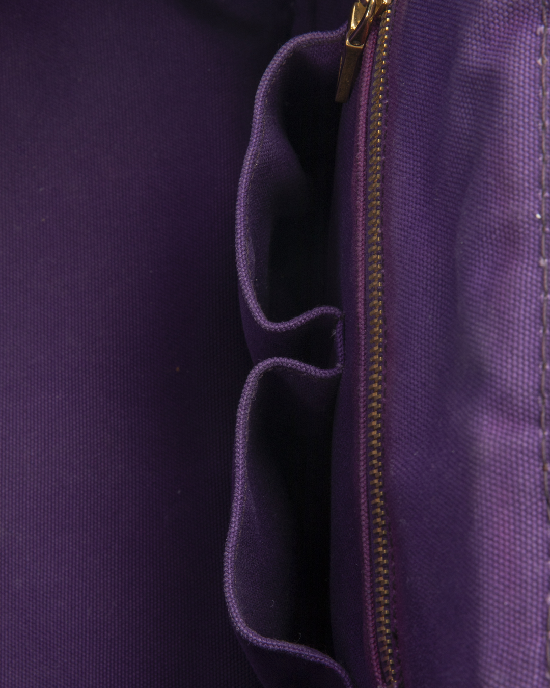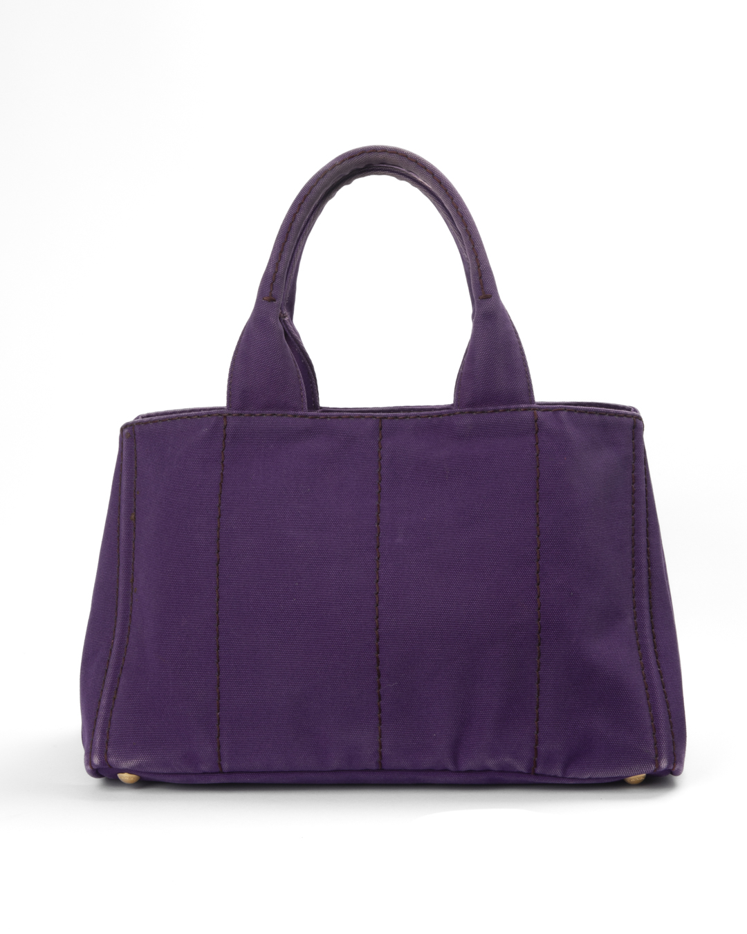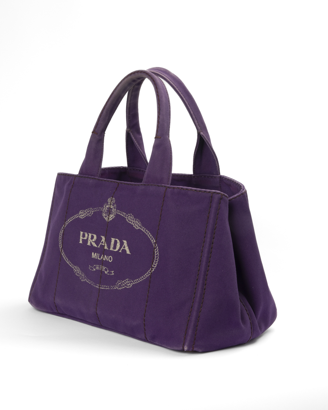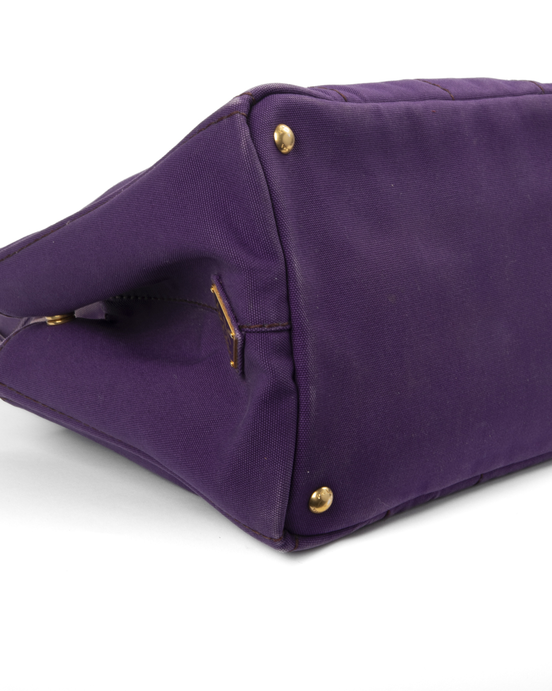 Borsa firmata Prada, modello Canapa nella misura large, realizzata in denim viola con hardware dorata. Non è dotata di nessuna chiusura, internamente rivestita in tela tono su tono con comode tasche, la borsa è abbastanza capiente. Munita di doppio manico e di una tracolla rimovibile e regolabile, per una comoda portata a spalla o a mano. L’articolo si presenta in buone condizioni, con segni di usura visibili in foto.