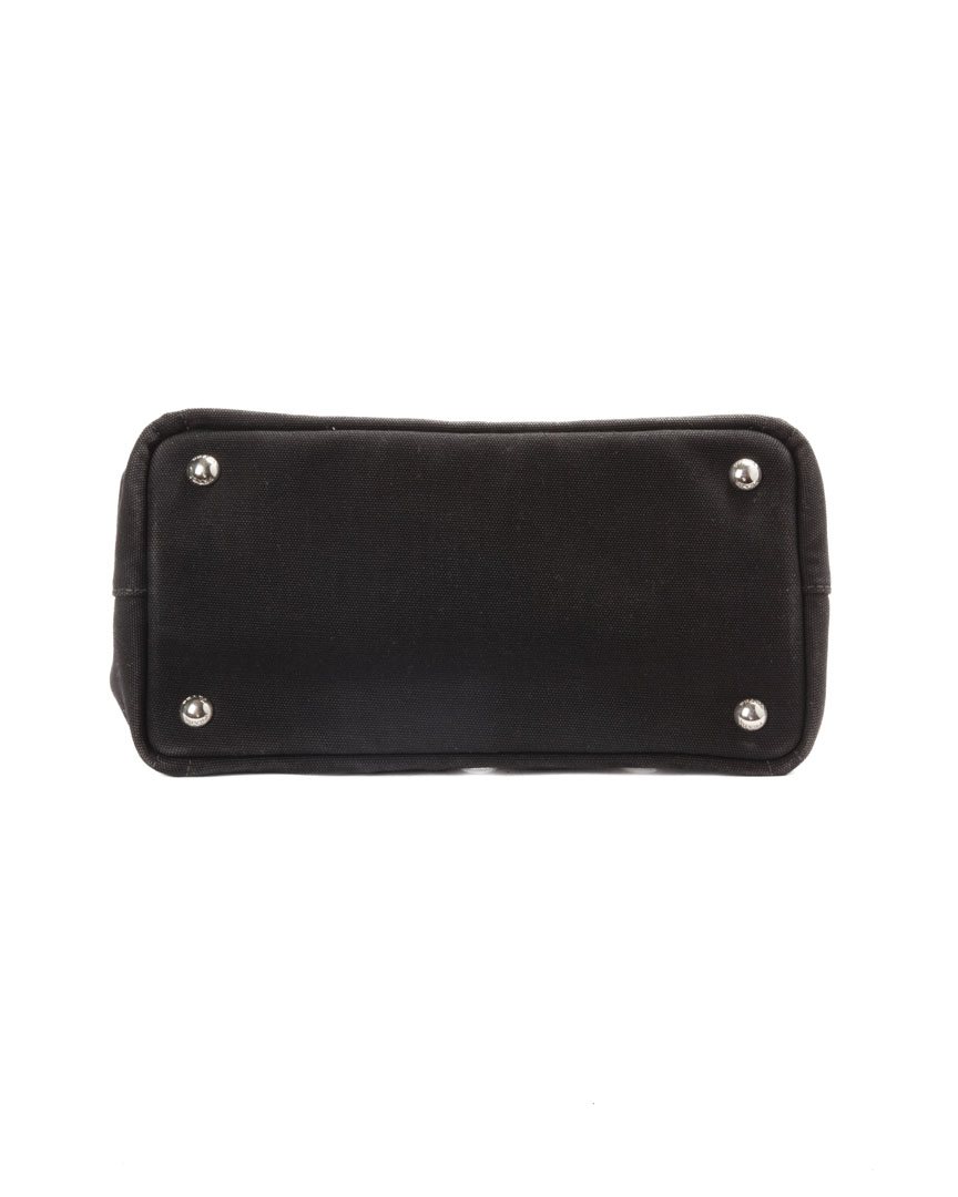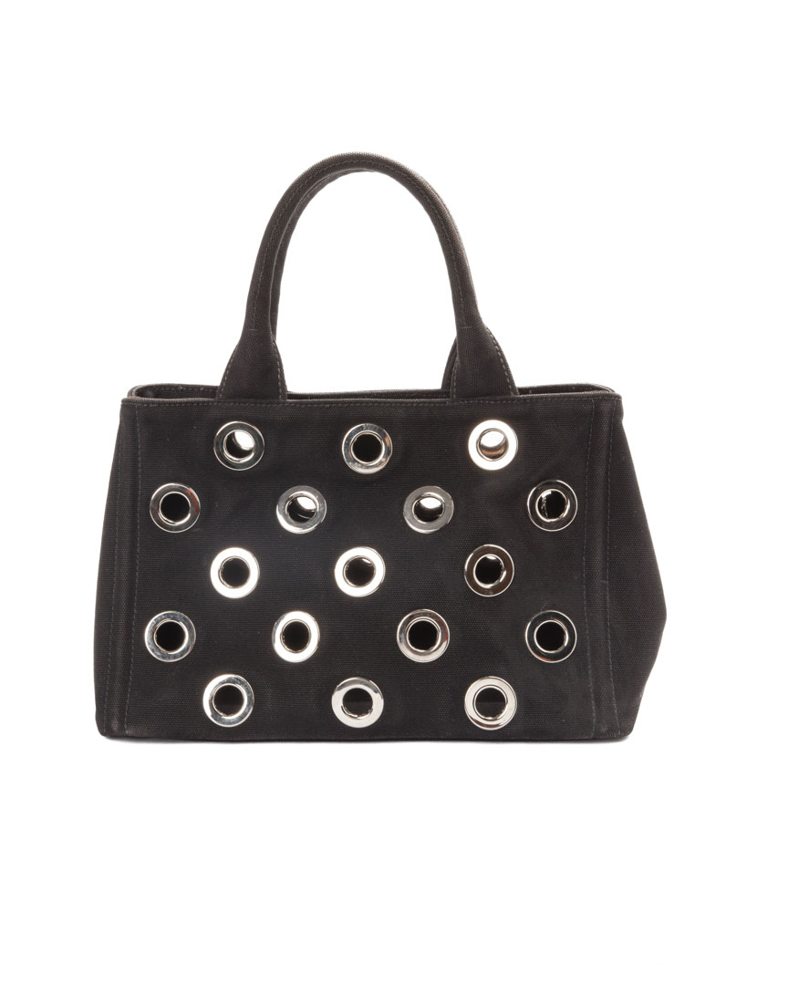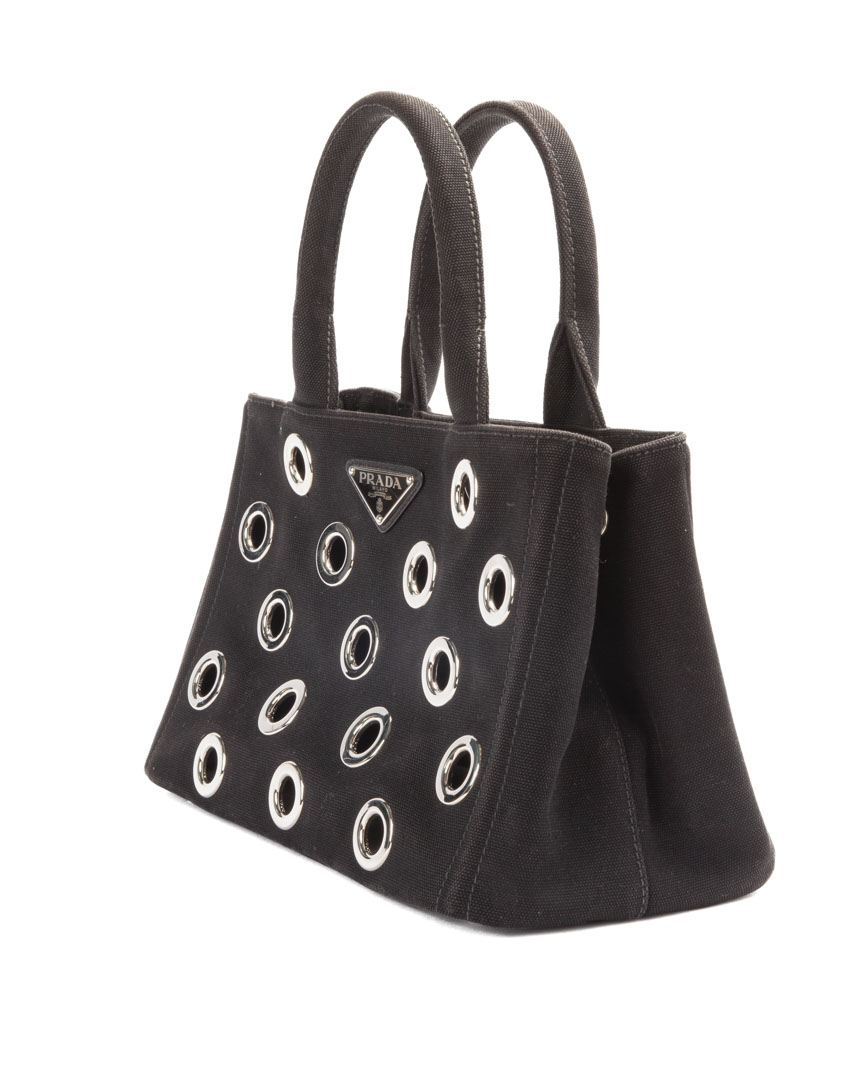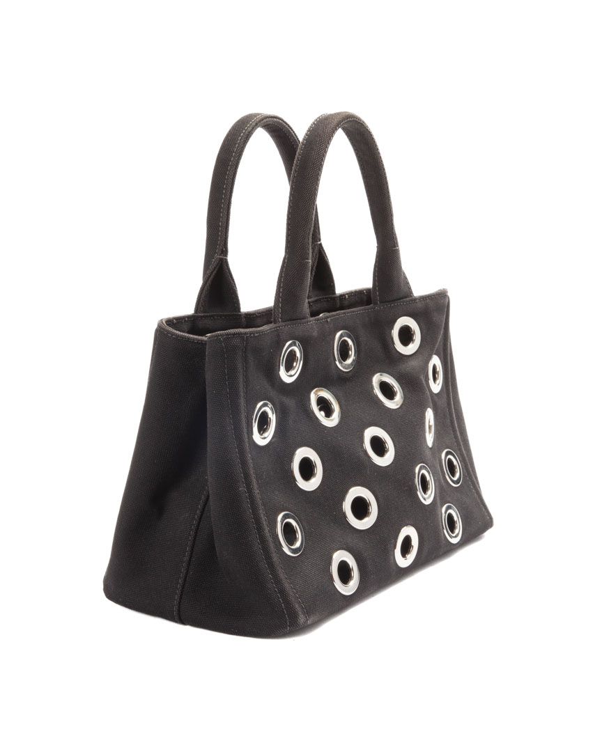 Borsa firmata Prada, modello Canapa nella misura small, realizzata in denim nero arricchita da fori e hardware argento. Non è dotata di nessuna chiusura, internamente rivestita in denim tono su tono, la borsa è abbastanza capiente. Munita di doppio manico e di una tracolla rimovibile e regolabile in tessuto, per una comoda portata a mano o a spalla. L’articolo si presenta in buone condizioni, con segni di usura visibili in foto.
