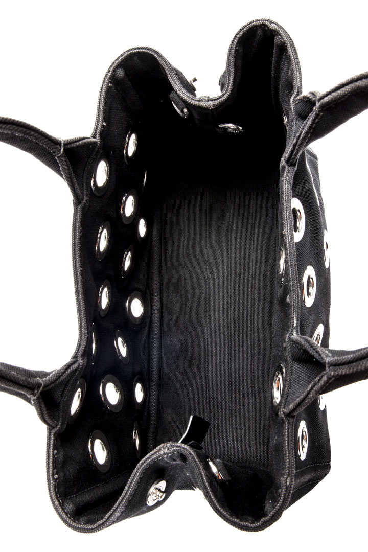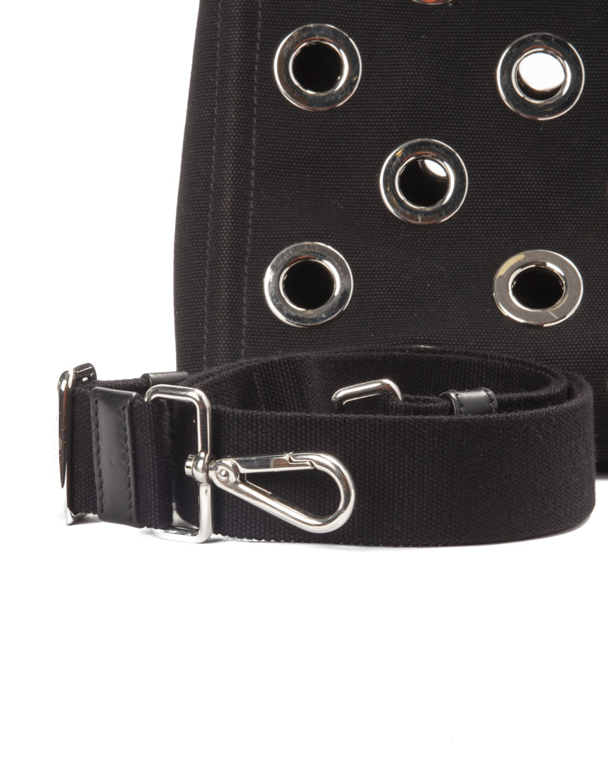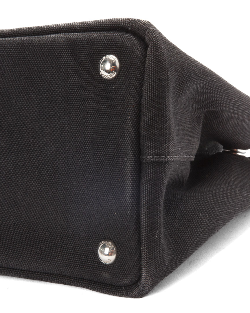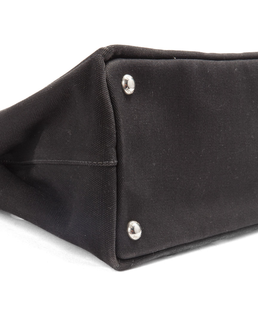 Borsa firmata Prada, modello Canapa nella misura small, realizzata in denim nero arricchita da fori e hardware argento. Non è dotata di nessuna chiusura, internamente rivestita in denim tono su tono, la borsa è abbastanza capiente. Munita di doppio manico e di una tracolla rimovibile e regolabile in tessuto, per una comoda portata a mano o a spalla. L’articolo si presenta in buone condizioni, con segni di usura visibili in foto.