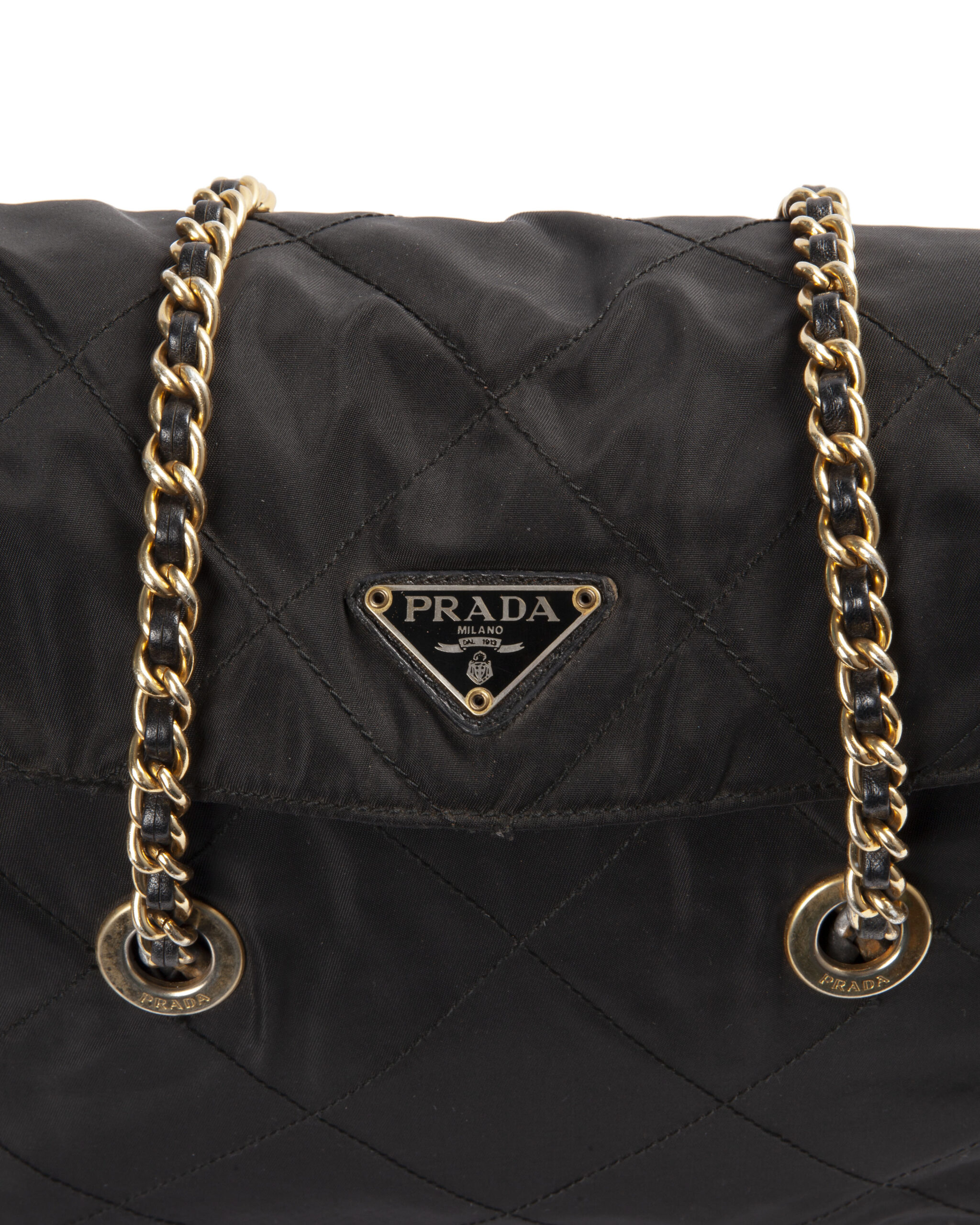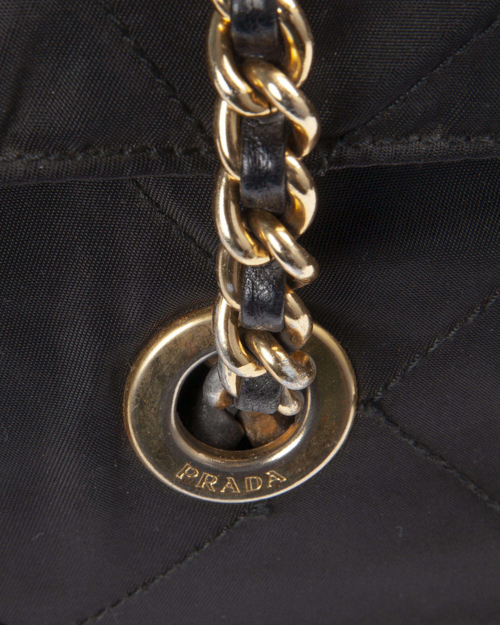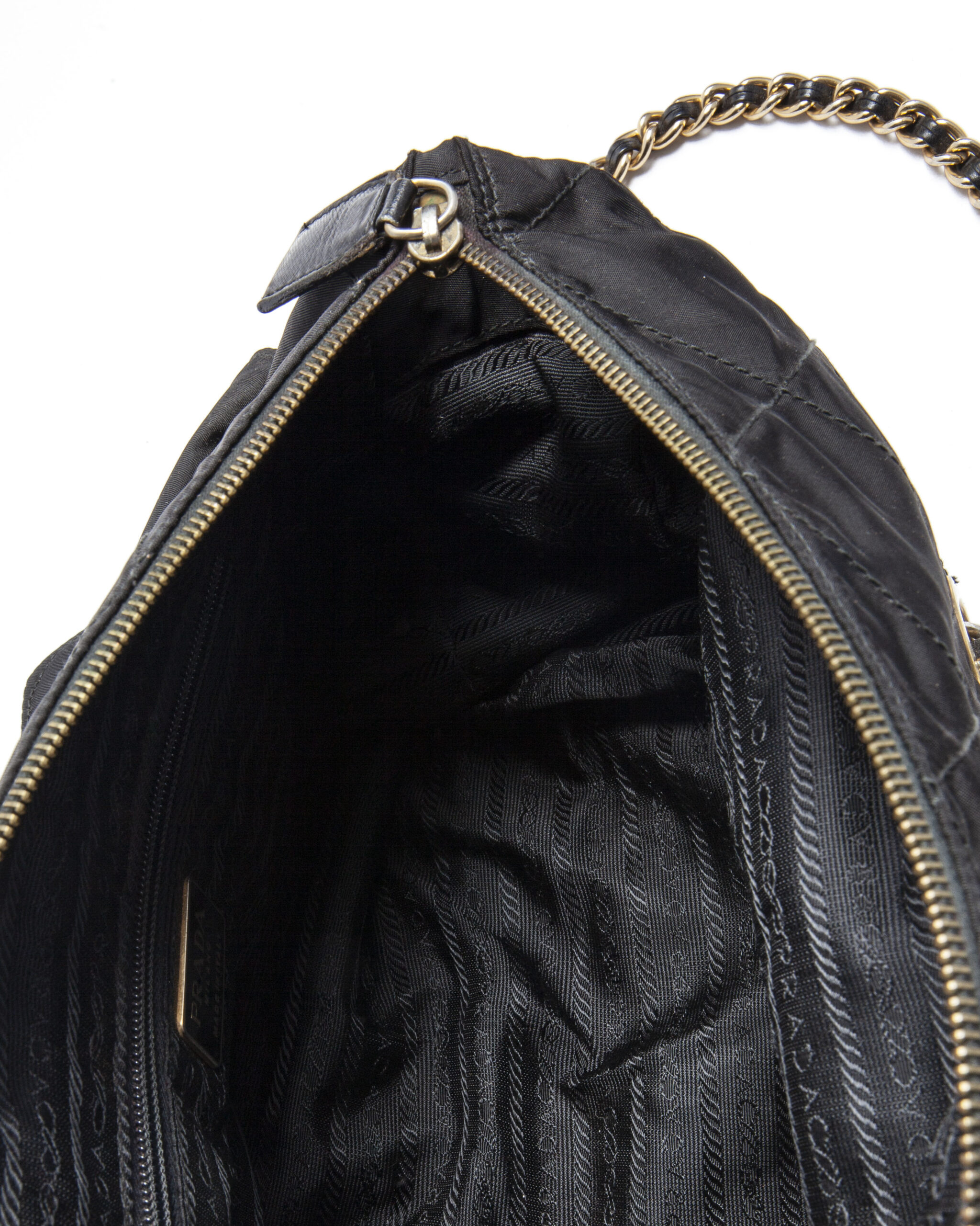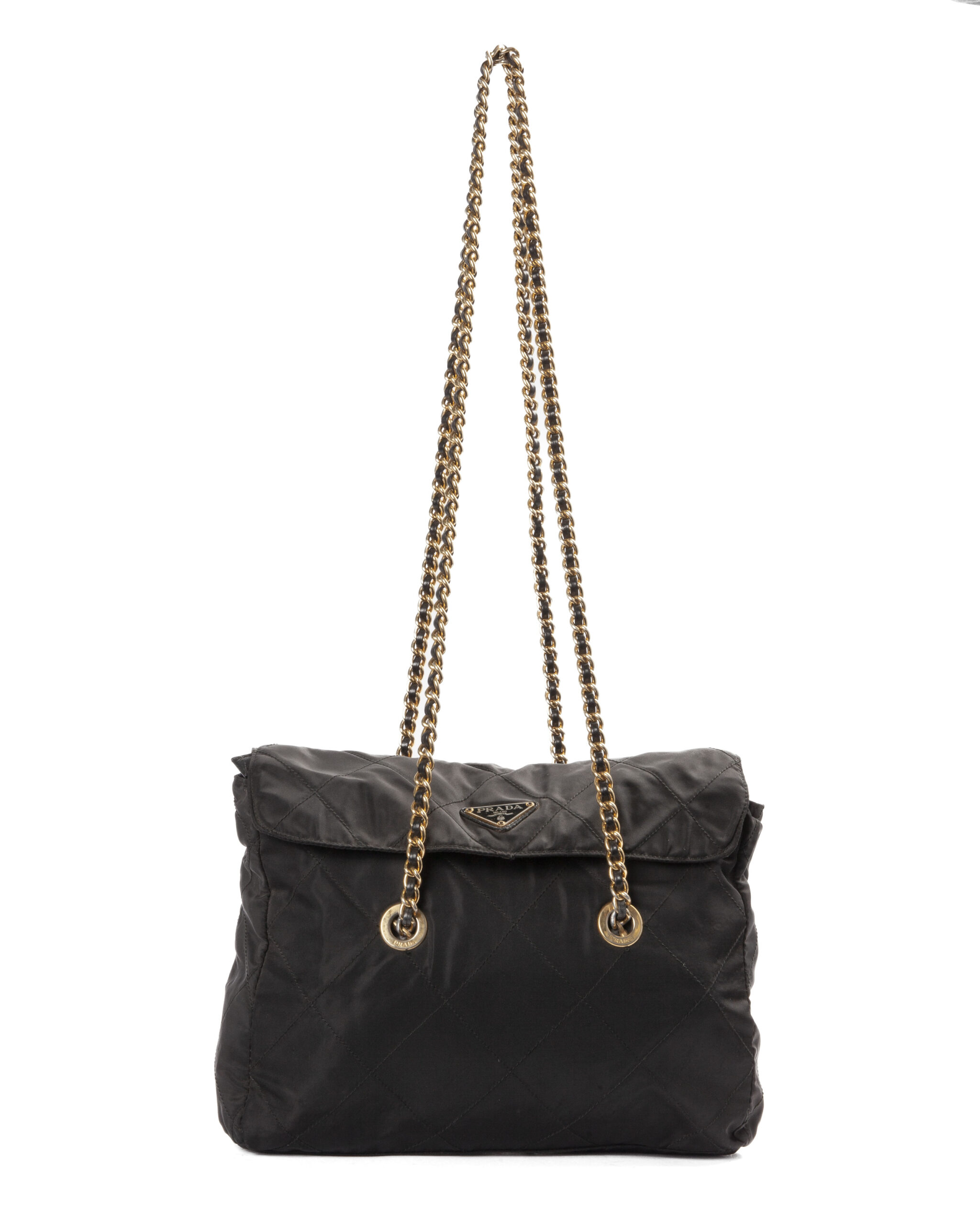 Borsa firmata Prada, misura medium, realizzata in nylon nero con inserti in pelle e hardware dorato. Dotata di doppia chiusura calamitata e a zip, internamente rivestita in tessuto logato con comoda tasca, la borsa è abbastanza capiente. Munita di doppio manico in pelle e catena, per una comoda portata a spalla o a mano. L’articolo si presenta in buone condizioni, con segni di usura visibili in foto.