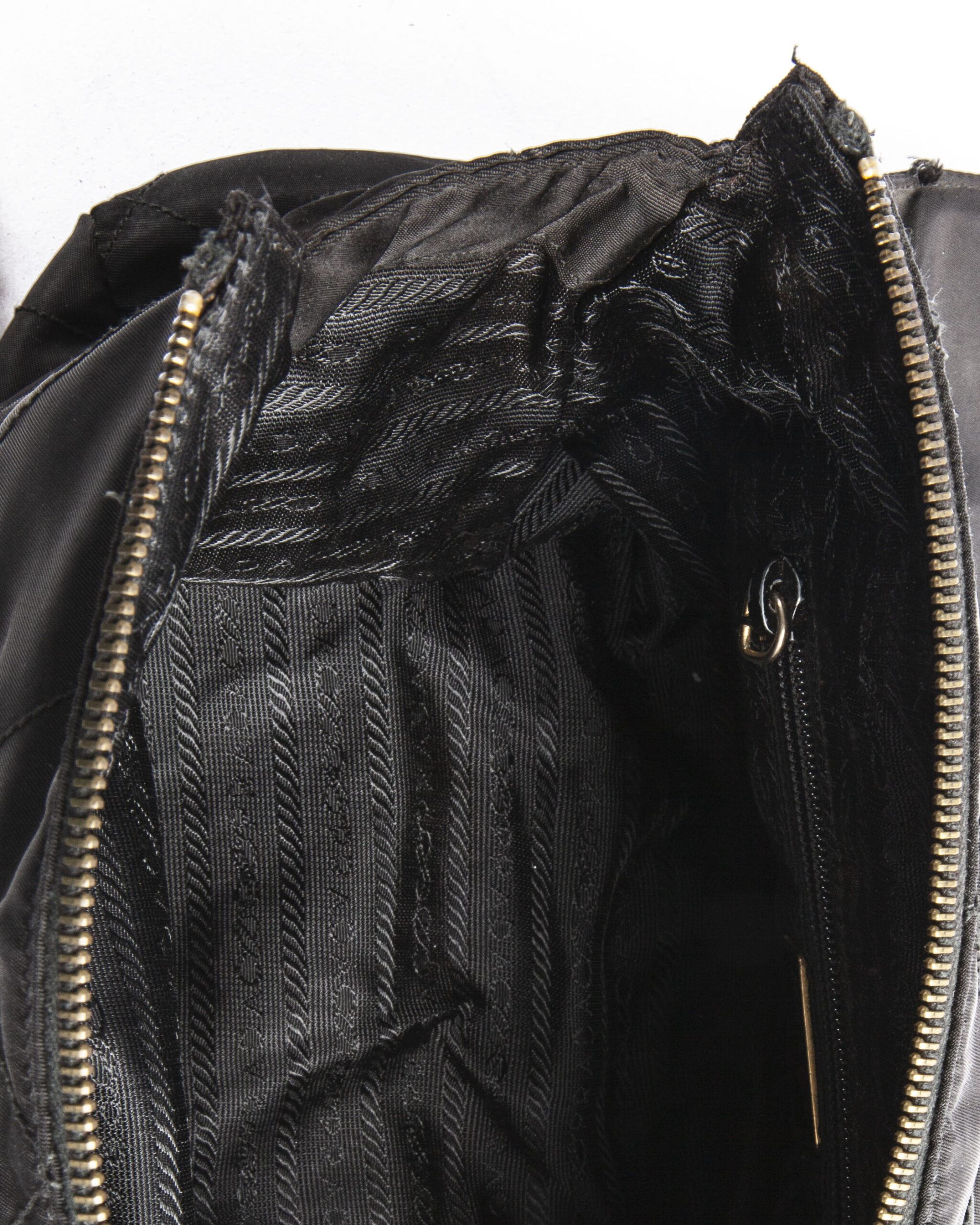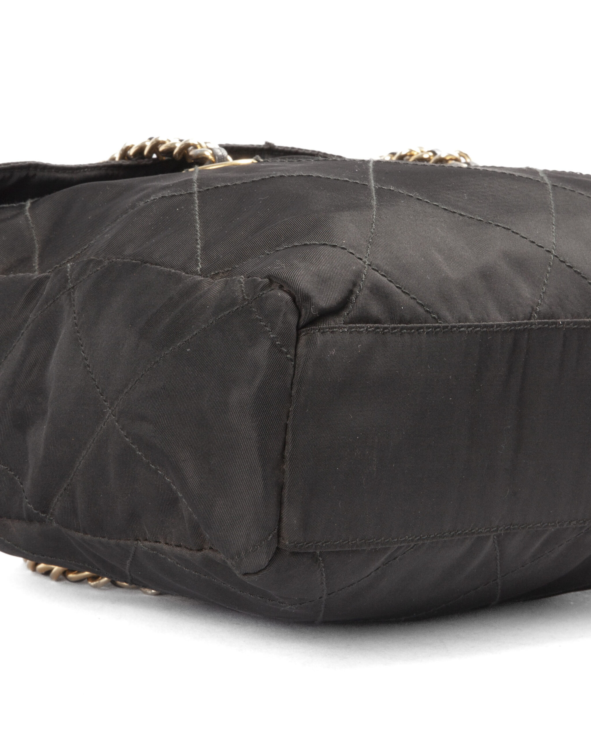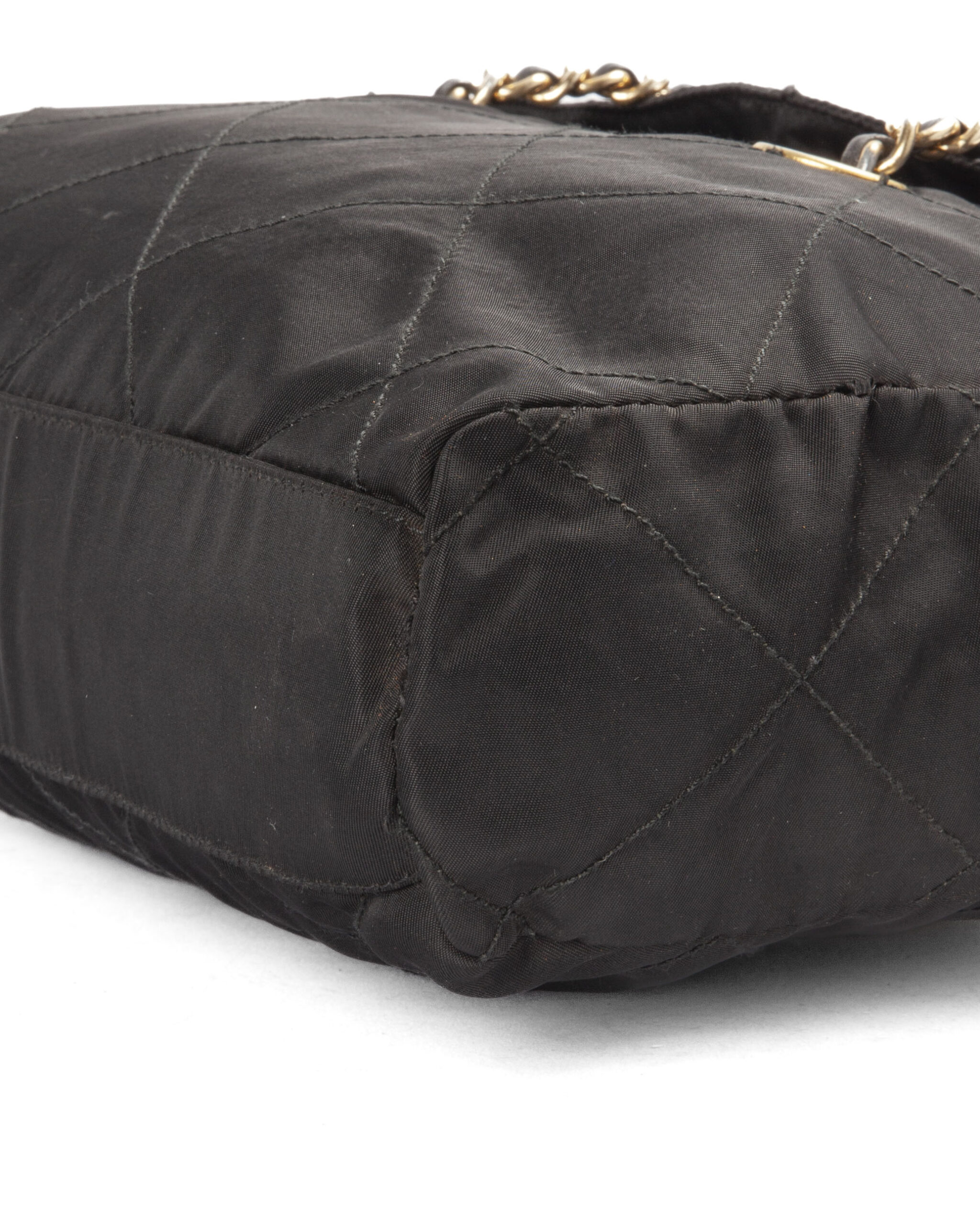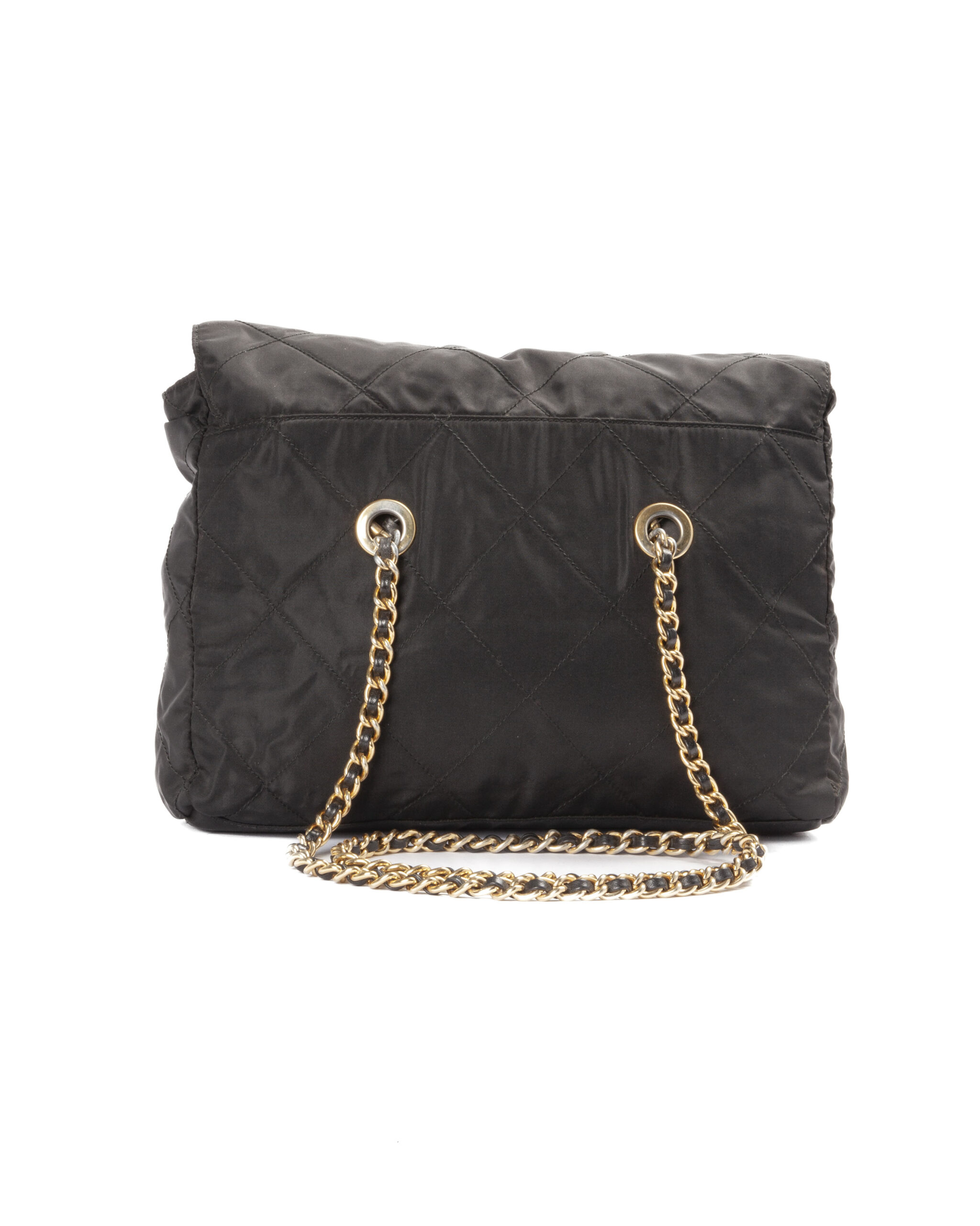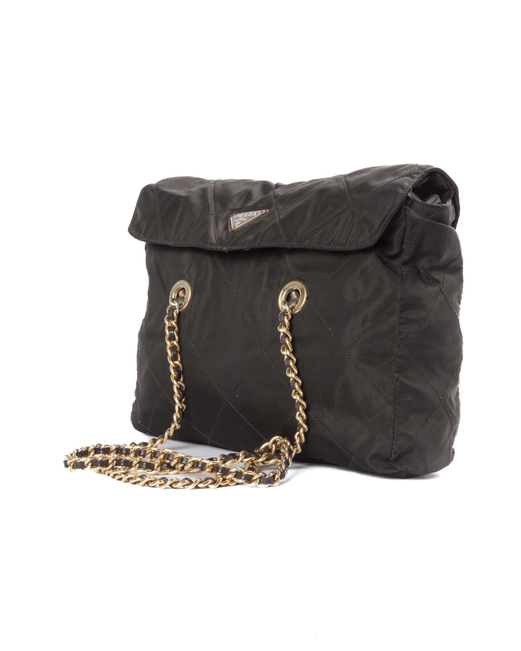 Borsa firmata Prada, misura medium, realizzata in nylon nero con inserti in pelle e hardware dorato. Dotata di doppia chiusura calamitata e a zip, internamente rivestita in tessuto logato con comoda tasca, la borsa è abbastanza capiente. Munita di doppio manico in pelle e catena, per una comoda portata a spalla o a mano. L’articolo si presenta in buone condizioni, con segni di usura visibili in foto.
