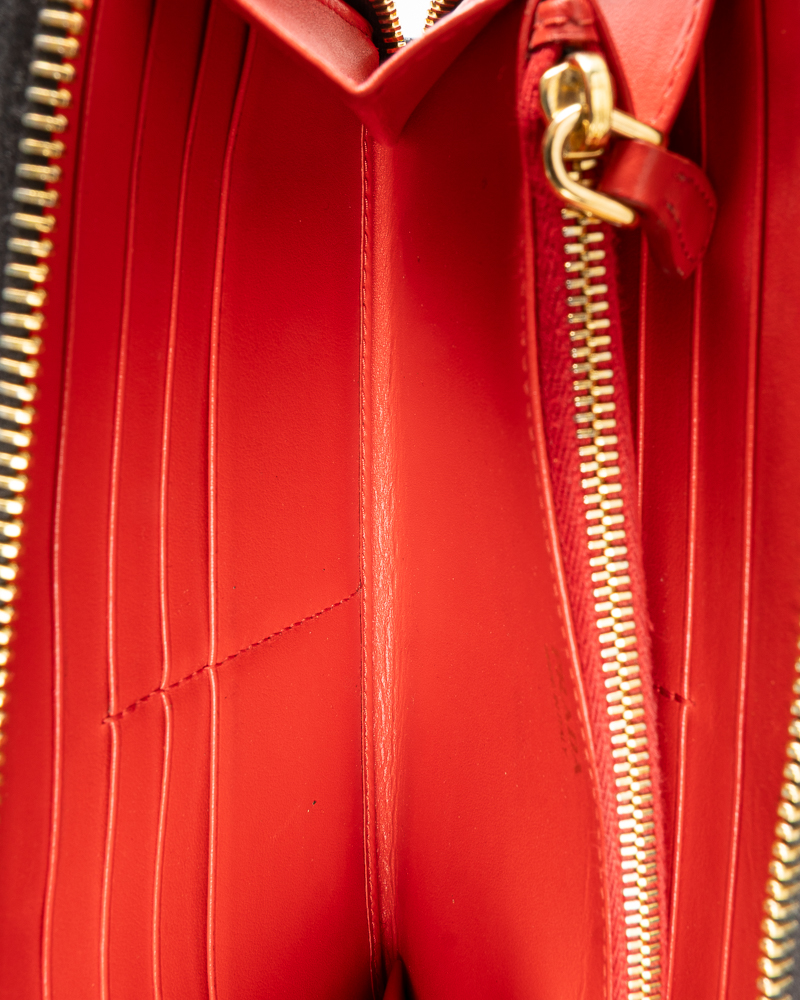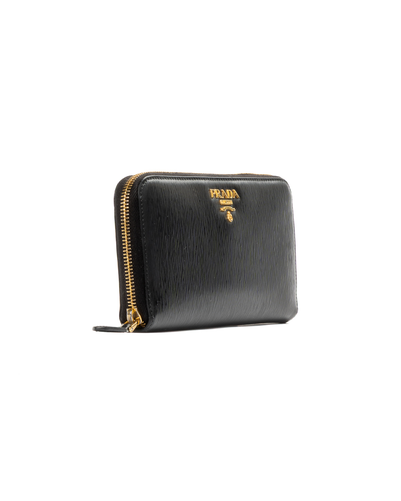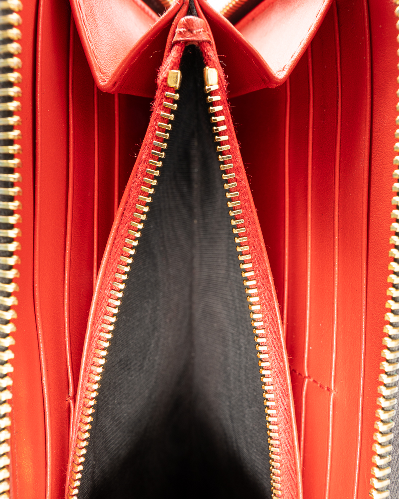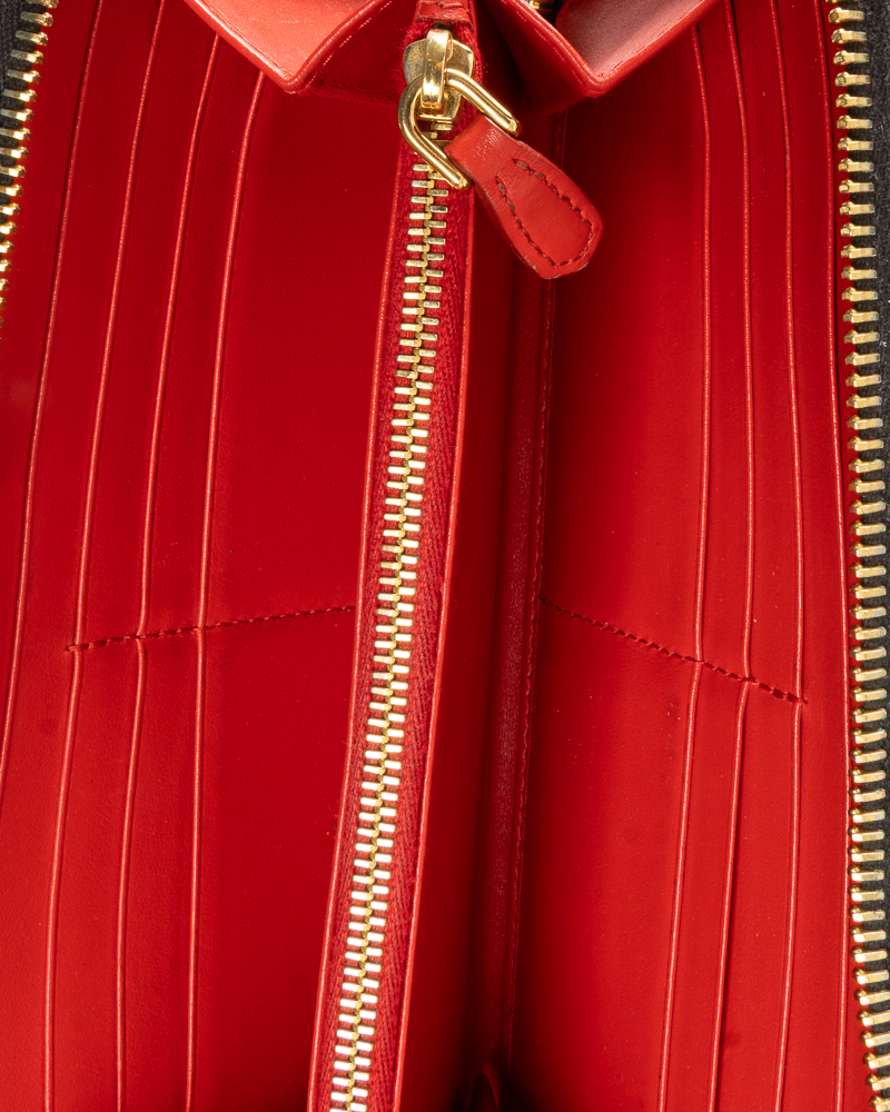 Portafoglio firmato Prada, realizzato in pelle epi nero con hardware dorato. Dotato di una chiusura semicircolare a zip, internamente rivestito in pelle liscia rossa con molteplici tasche comodo per documenti e banconote. L’articolo si presenta in buone condizioni.