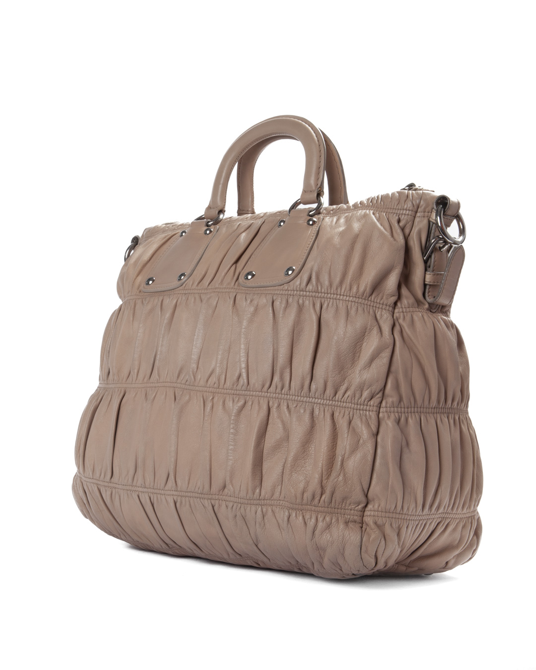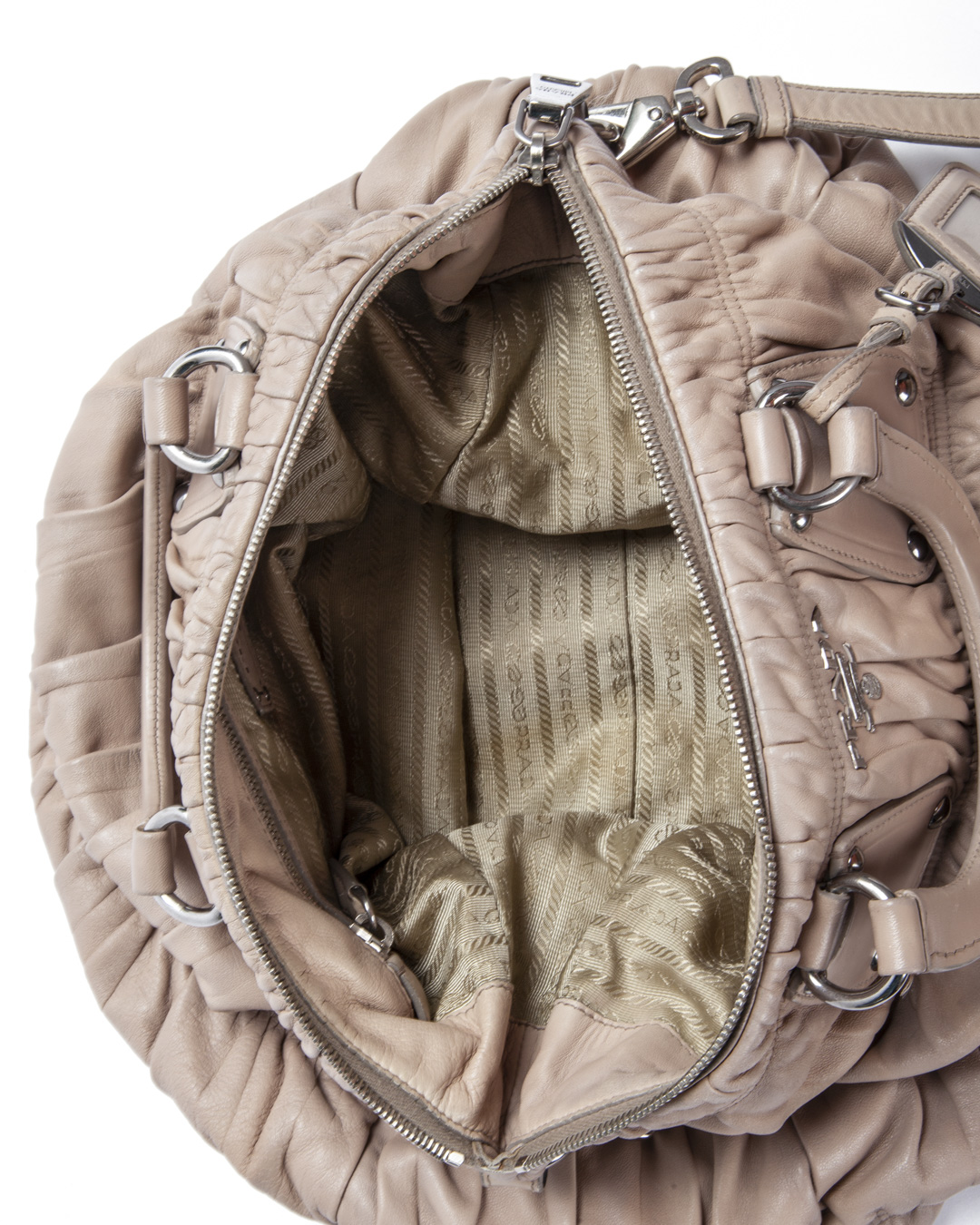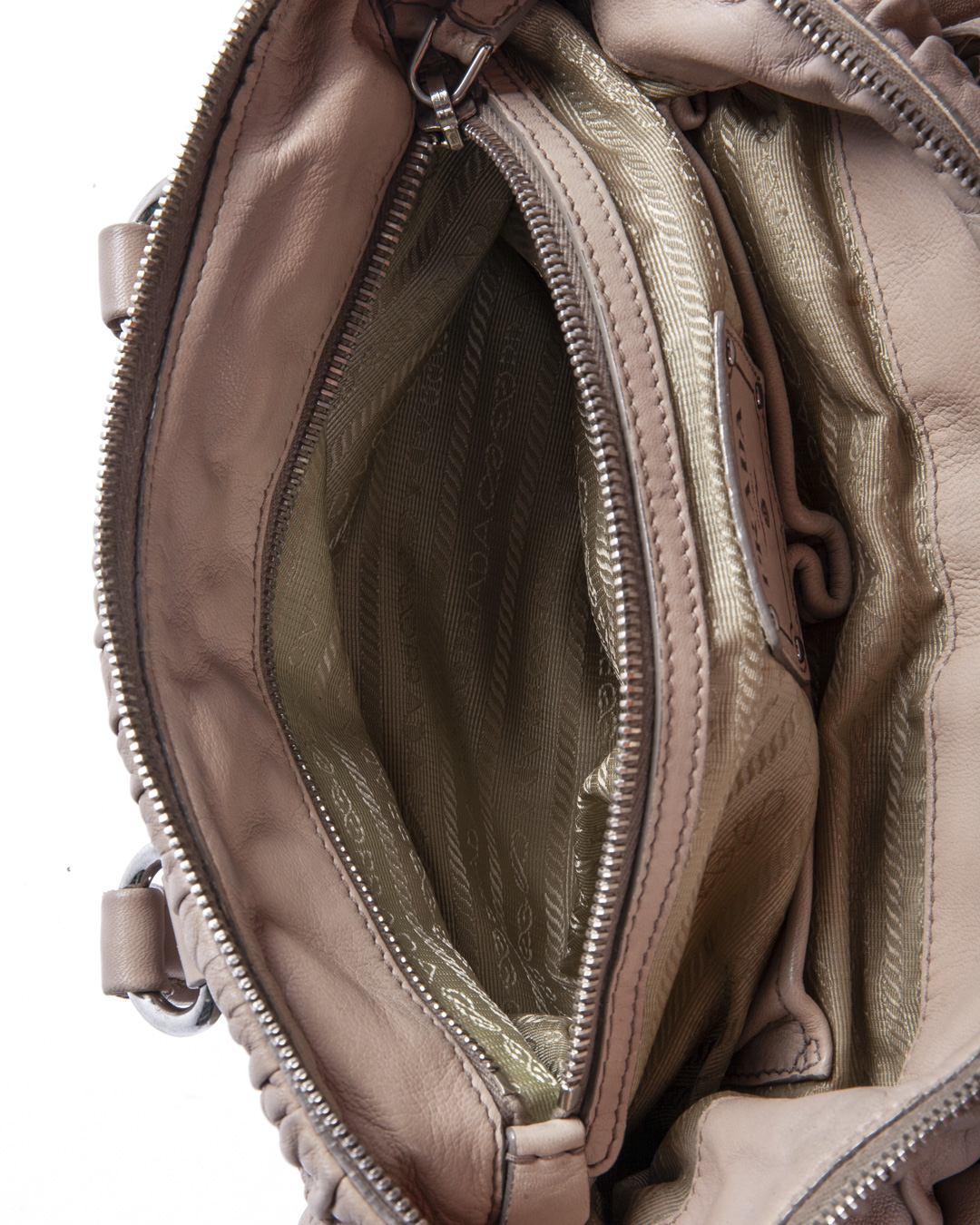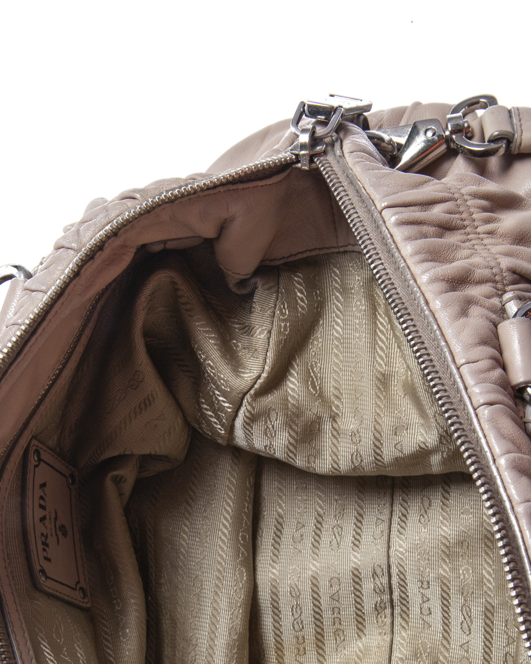 Borsa firmata Prada, modello shopper nella misura medium, realizzata in pelle rosa antico con effetto groffato e hardware argento. Dotata di una chiusura superiore a zip, internamente rivestita in tessuto logato beige con comode tasche, la borsa è abbastanza capiente. Munita di doppio manico e di una tracolla rimovibile e regolabile, per una comoda portata a spalla o a mano. L’articolo si presenta in buone condizioni con segni di usura visibili in foto.