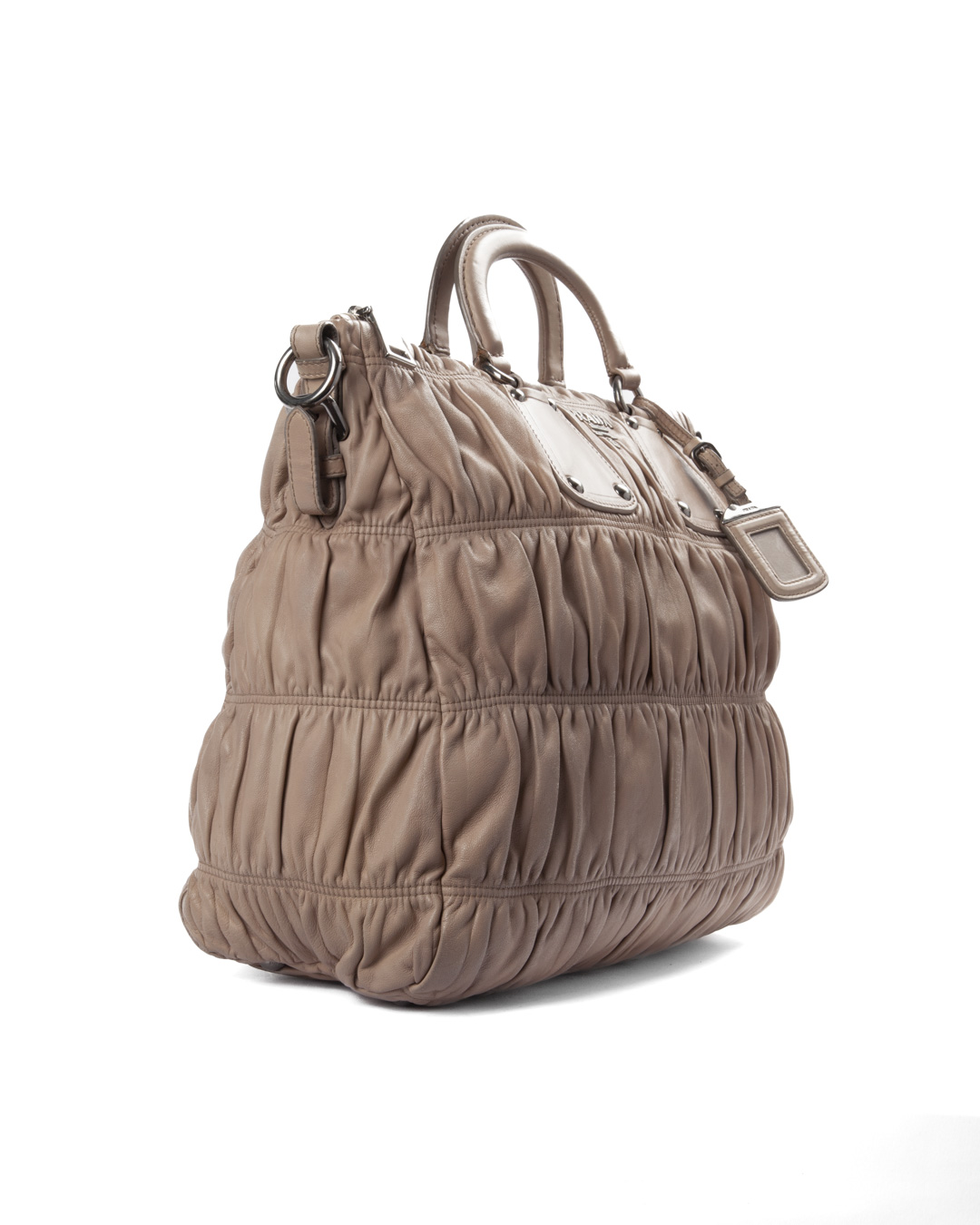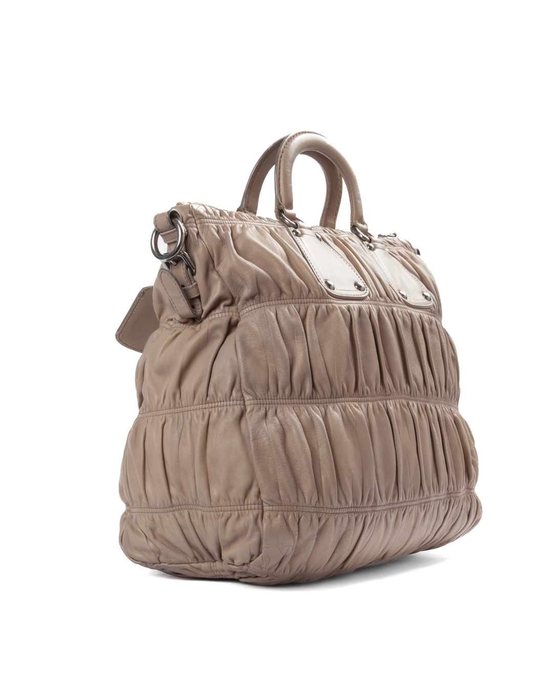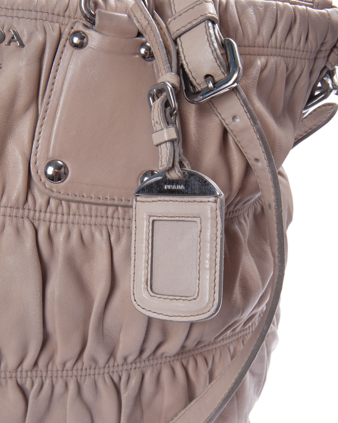Borsa firmata Prada, modello shopper nella misura medium, realizzata in pelle rosa antico con effetto groffato e hardware argento. Dotata di una chiusura superiore a zip, internamente rivestita in tessuto logato beige con comode tasche, la borsa è abbastanza capiente. Munita di doppio manico e di una tracolla rimovibile e regolabile, per una comoda portata a spalla o a mano. L’articolo si presenta in buone condizioni con segni di usura visibili in foto.