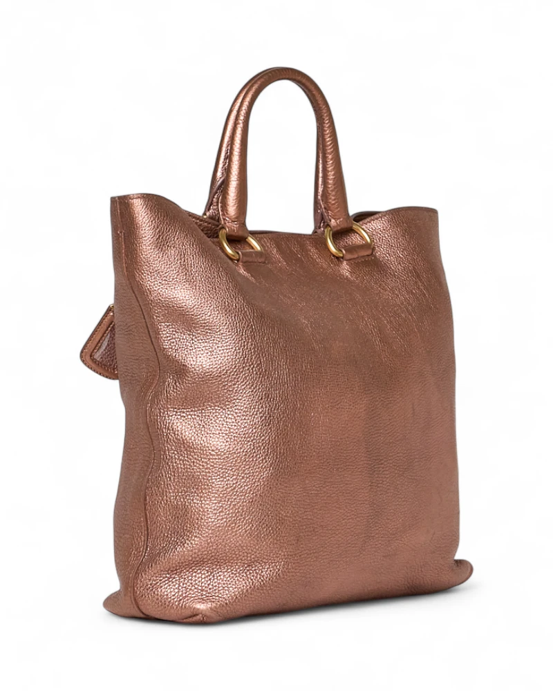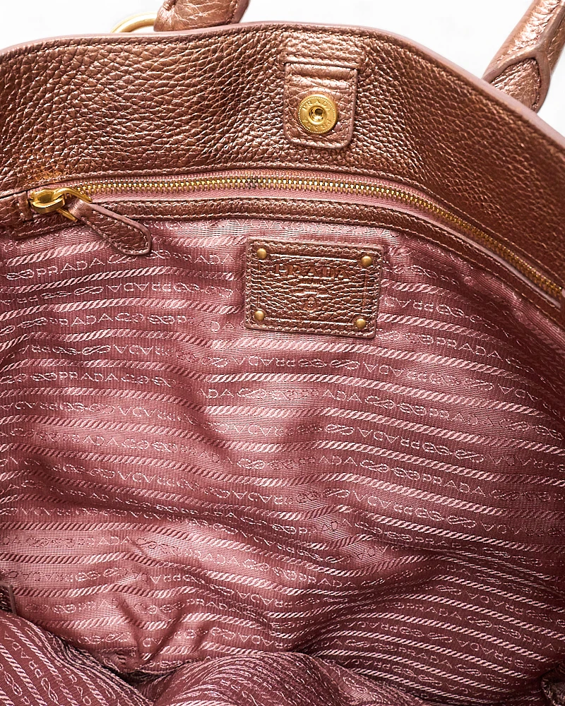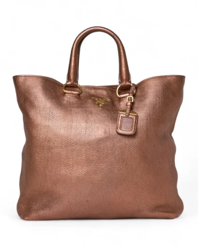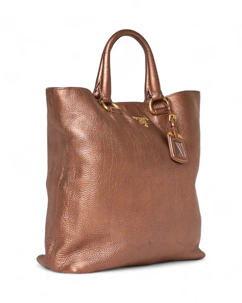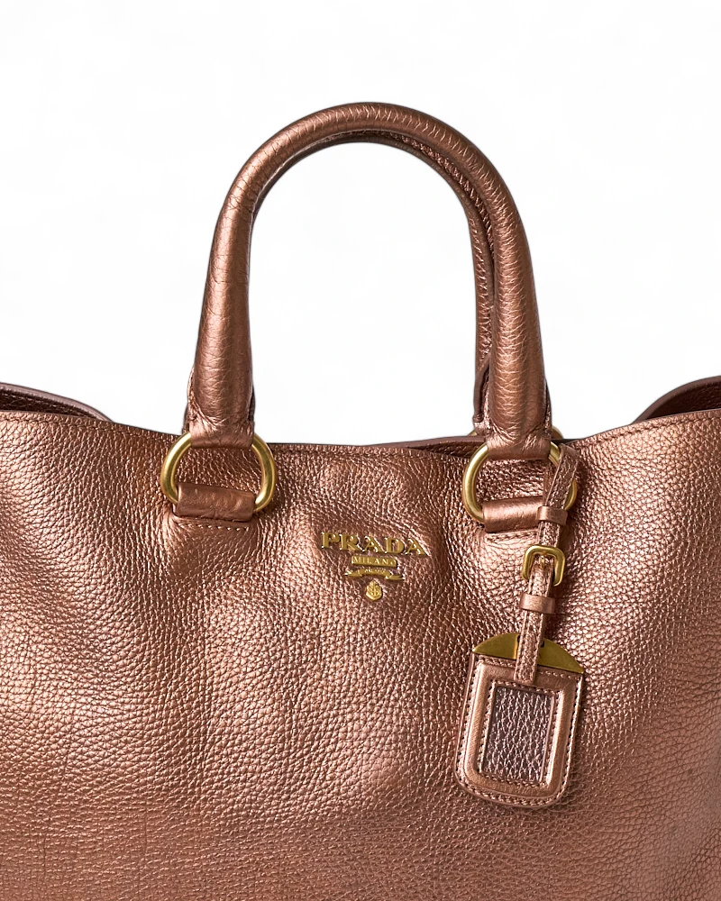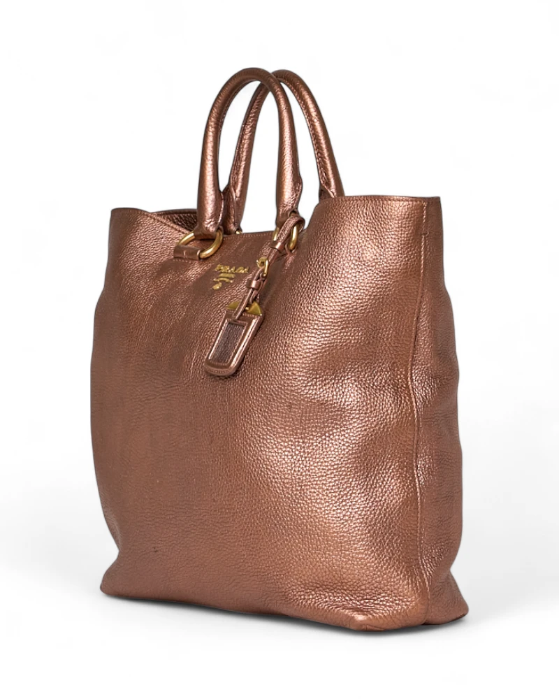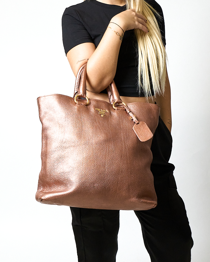 Borsa firmata Prada, modello Shopper Vertical nella misura large, realizzata in pelle rosa con effetto metal e hardware dorato. Dotata di una chiusura a clip, internamente rivestita in tessuto logato tono su tono con comode tasche, la borsa è abbastanza capiente. Munita di doppio manico e di una tracolla rimovibile e regolabile, per una comoda portata a mano o a spalla. L’articolo si presenta in buone condizioni, con macchie visibili in foto.