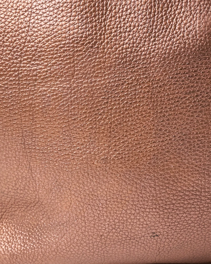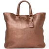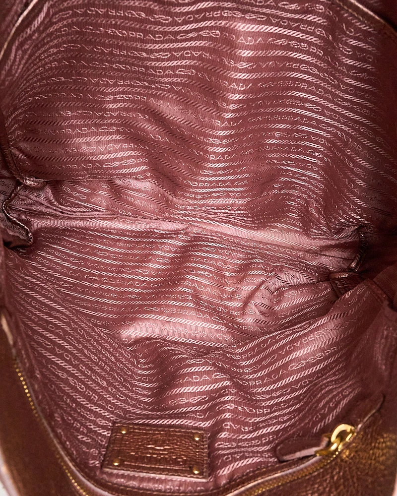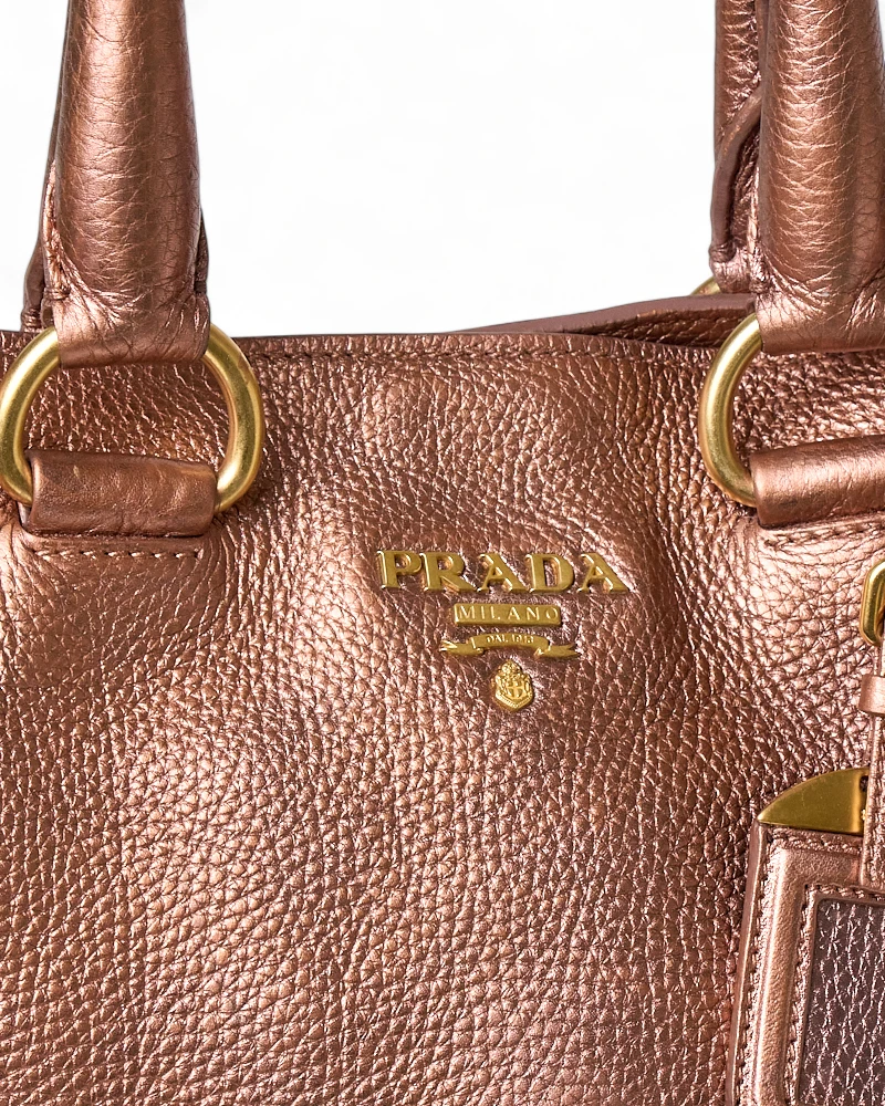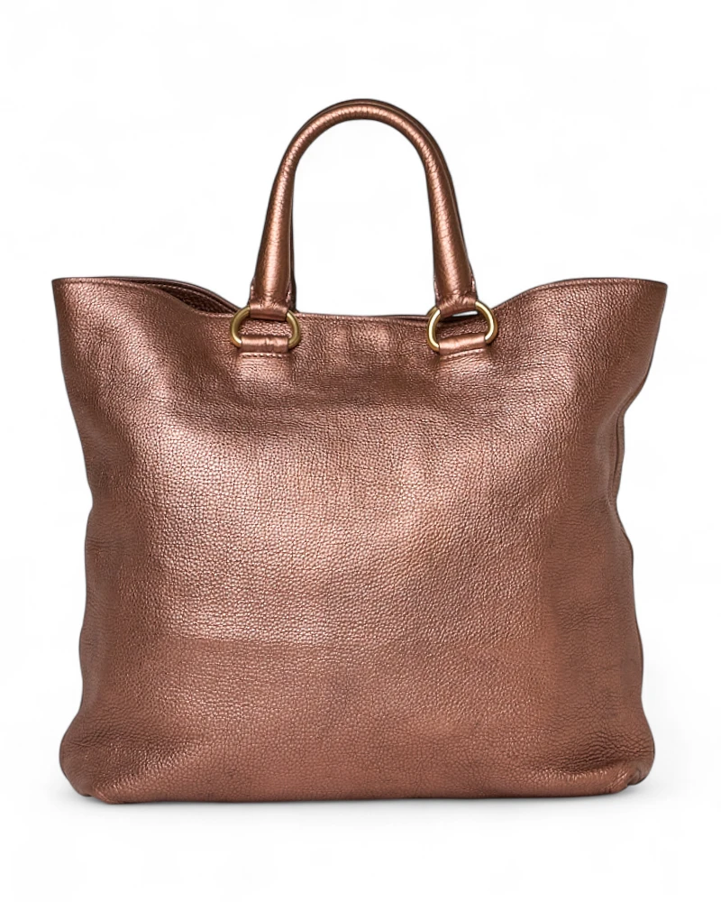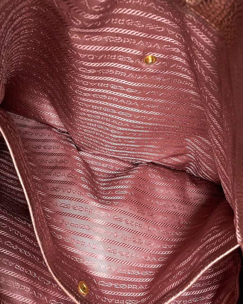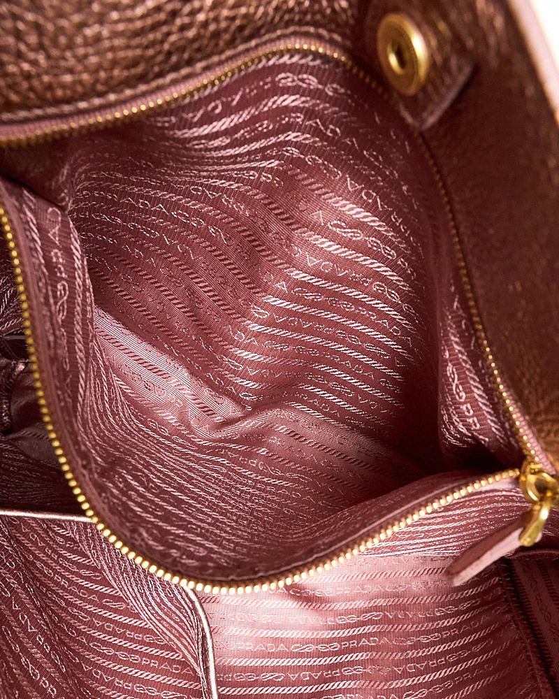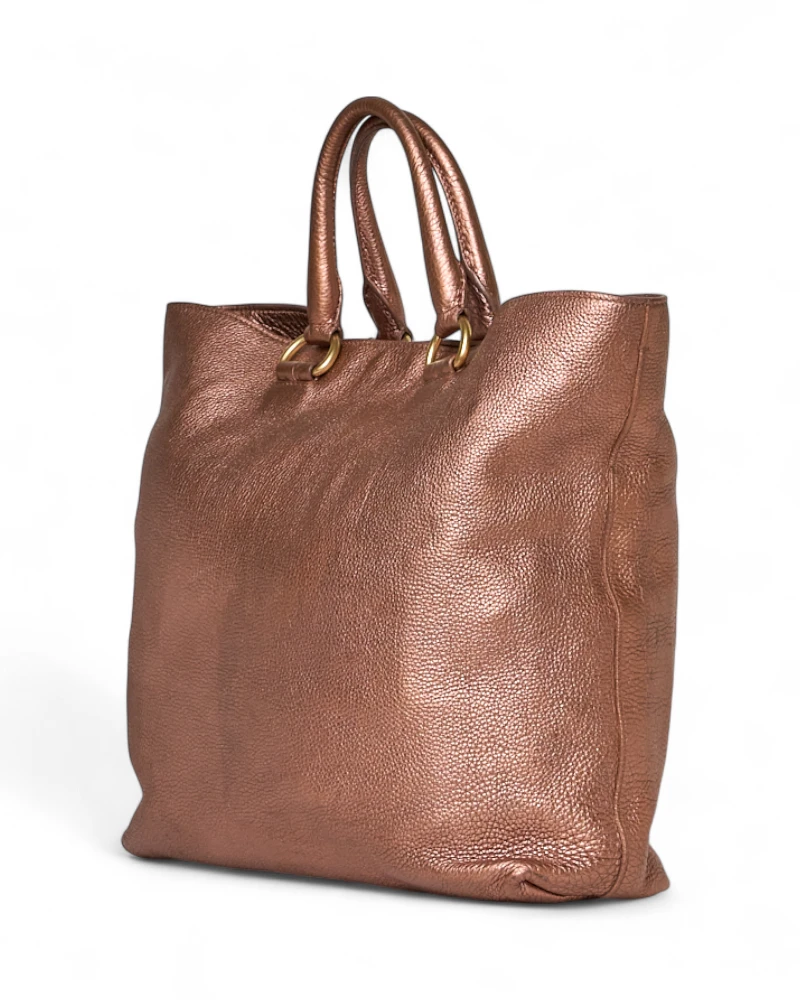 Borsa firmata Prada, modello Shopper Vertical nella misura large, realizzata in pelle rosa con effetto metal e hardware dorato. Dotata di una chiusura a clip, internamente rivestita in tessuto logato tono su tono con comode tasche, la borsa è abbastanza capiente. Munita di doppio manico e di una tracolla rimovibile e regolabile, per una comoda portata a mano o a spalla. L’articolo si presenta in buone condizioni, con macchie visibili in foto.