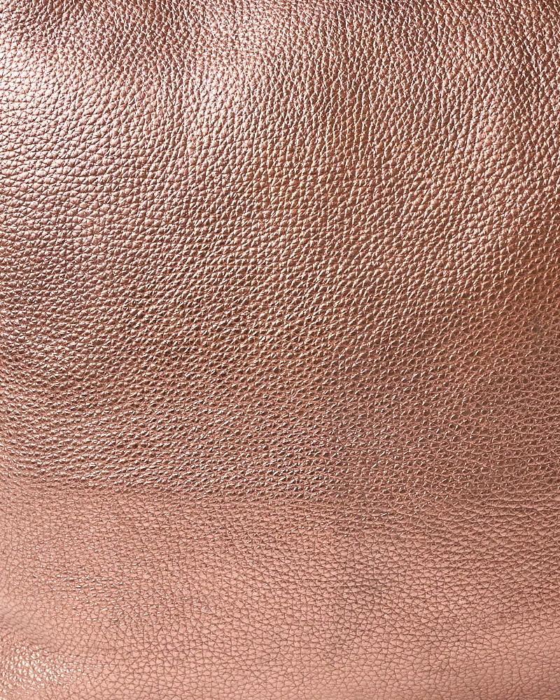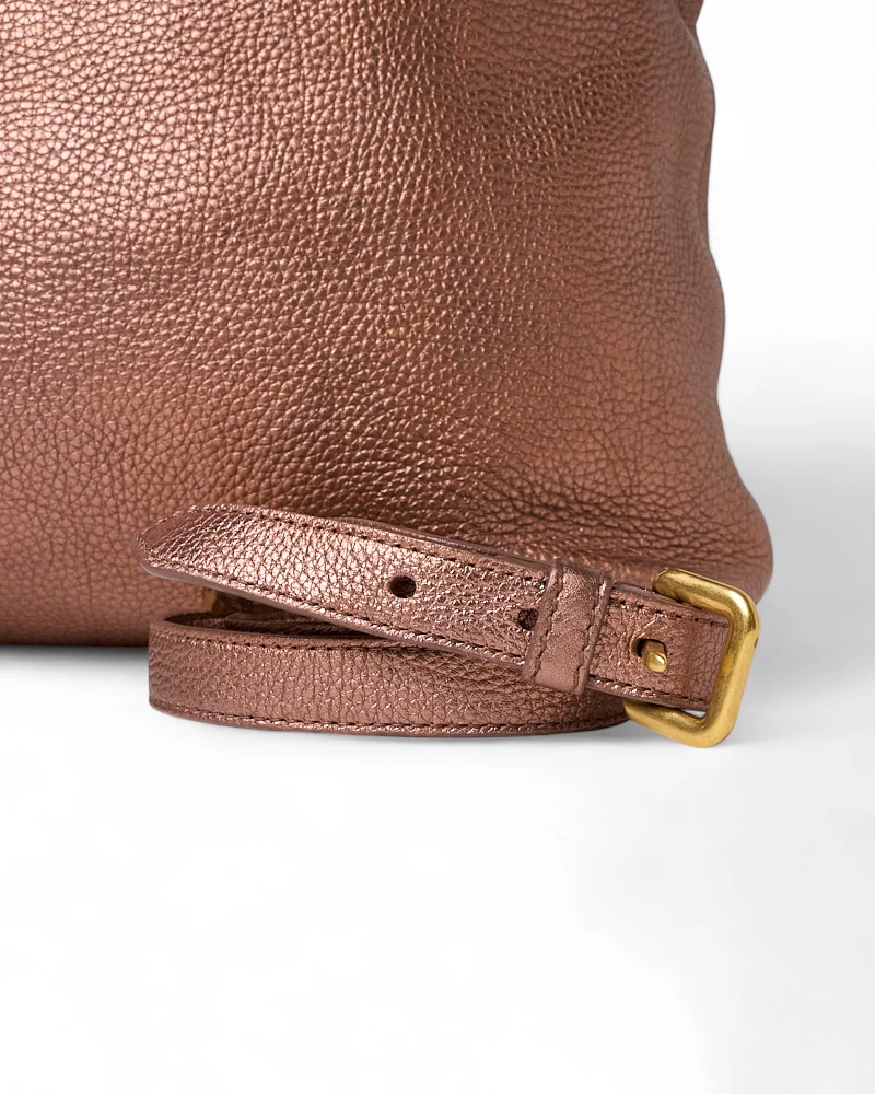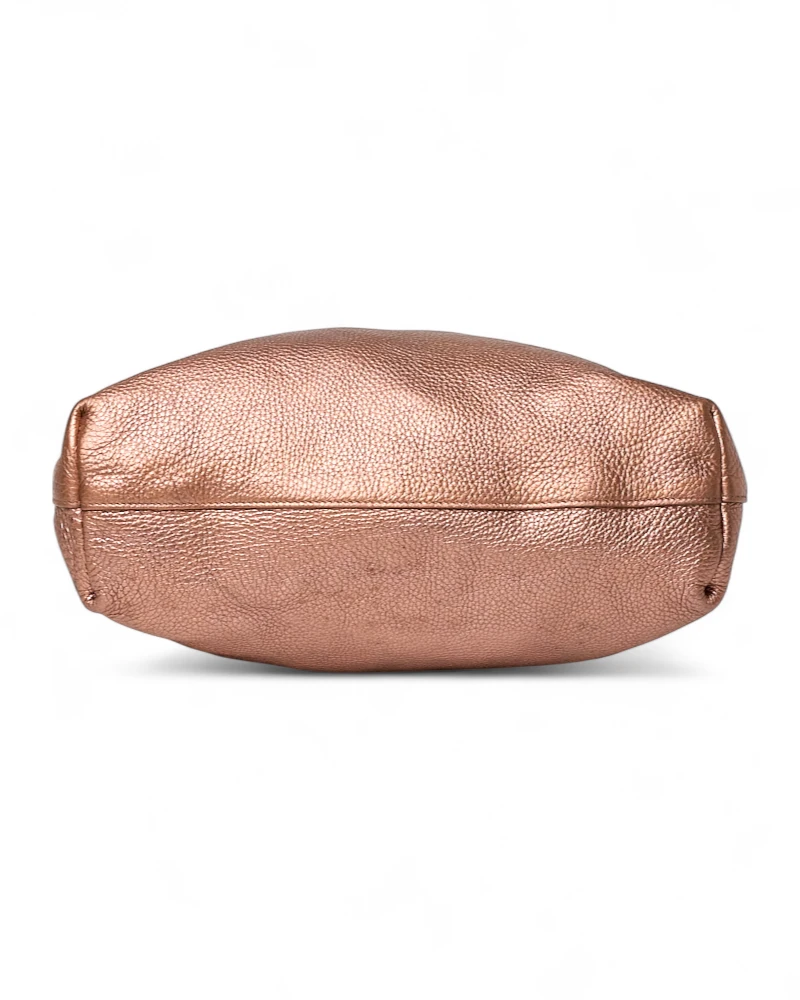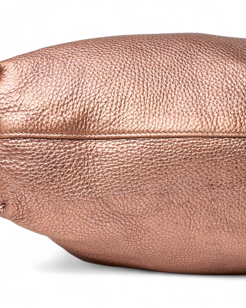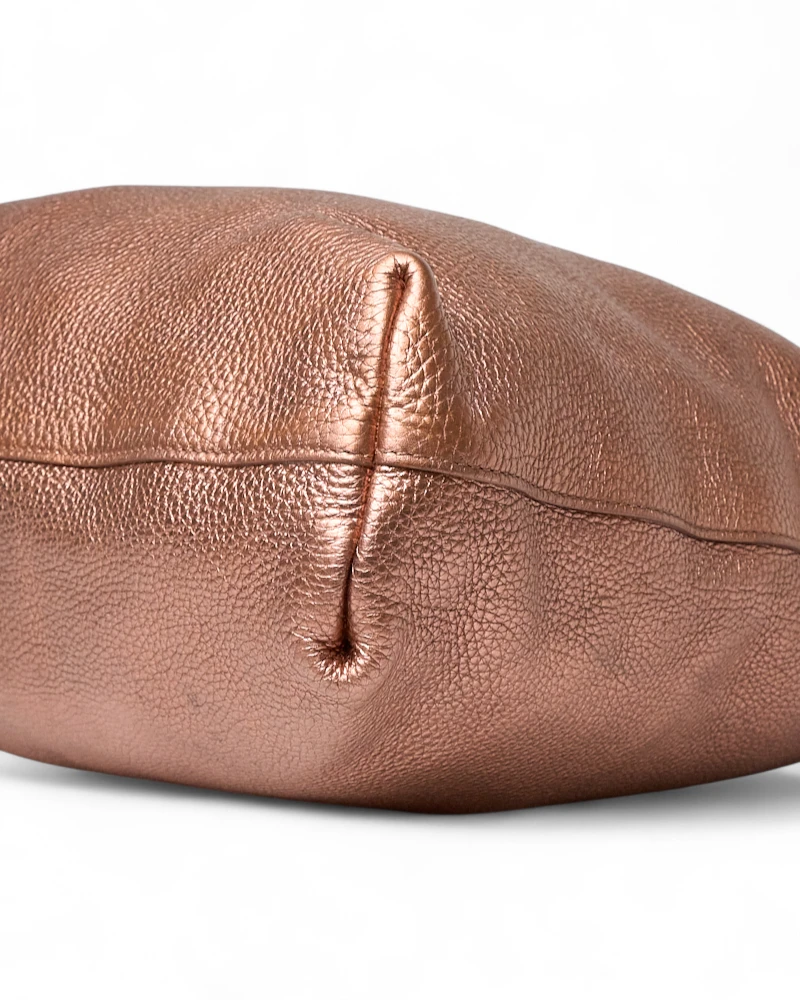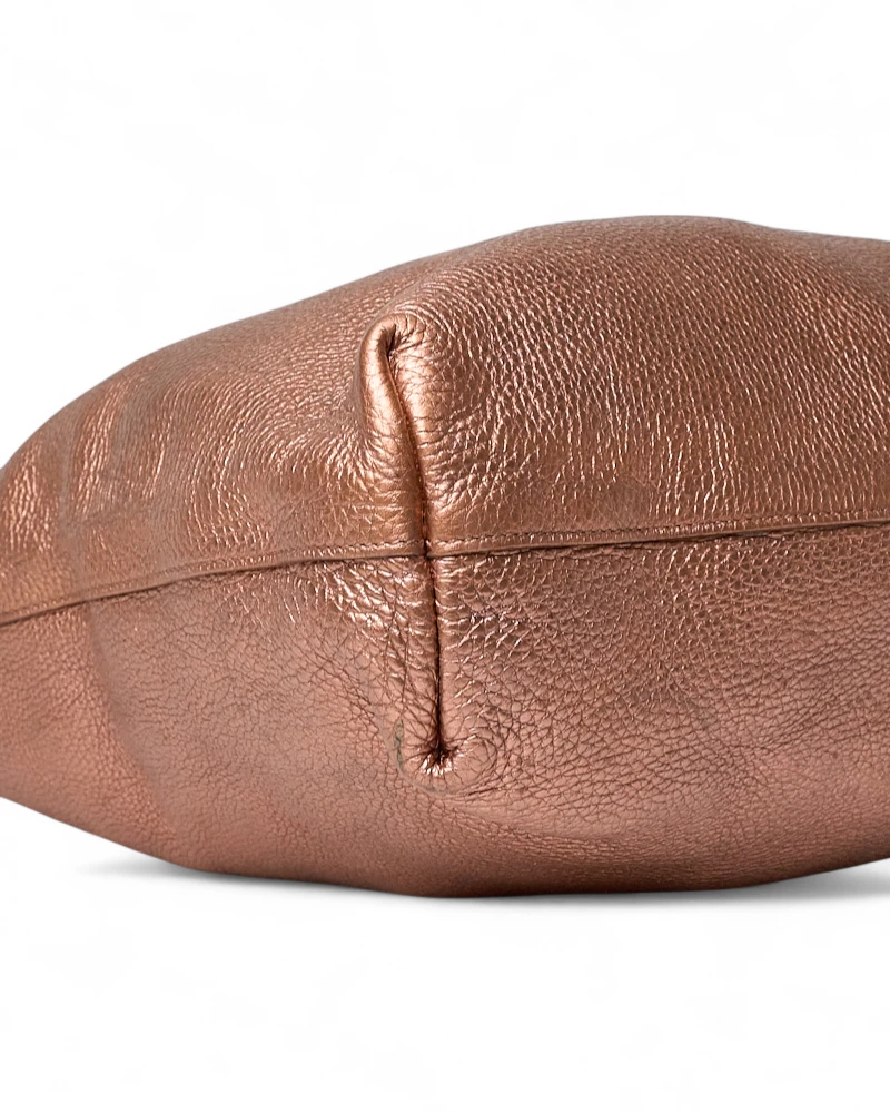 Borsa firmata Prada, modello Shopper Vertical nella misura large, realizzata in pelle rosa con effetto metal e hardware dorato. Dotata di una chiusura a clip, internamente rivestita in tessuto logato tono su tono con comode tasche, la borsa è abbastanza capiente. Munita di doppio manico e di una tracolla rimovibile e regolabile, per una comoda portata a mano o a spalla. L’articolo si presenta in buone condizioni, con macchie visibili in foto.