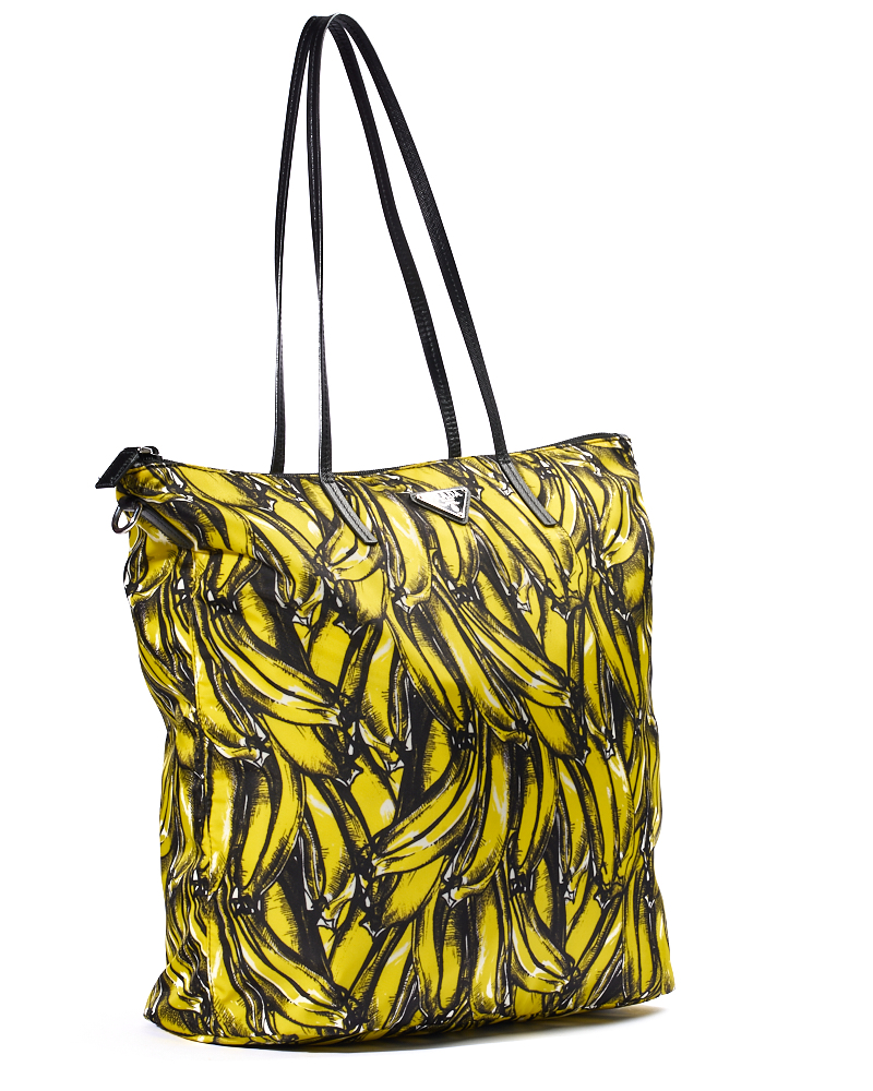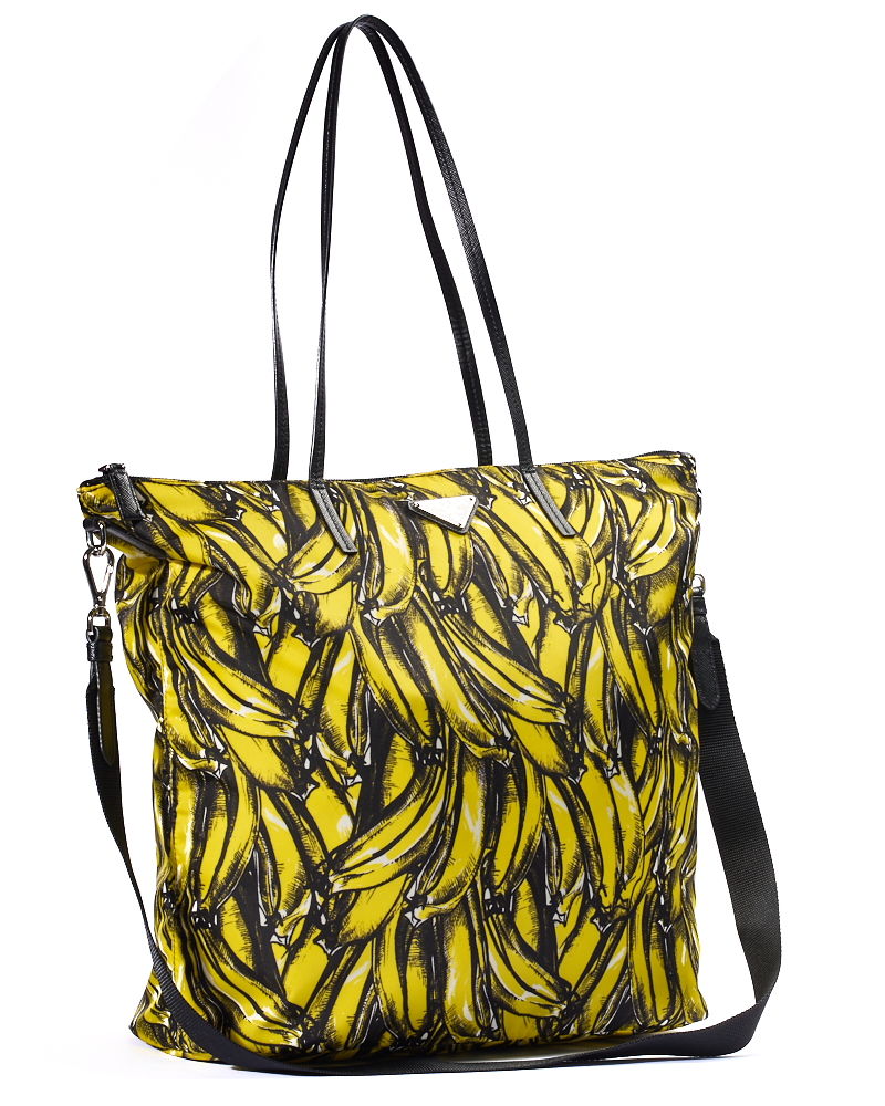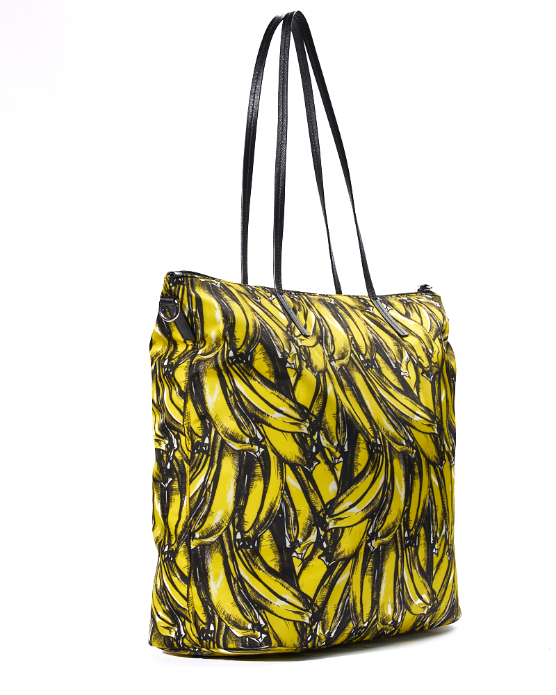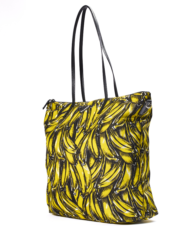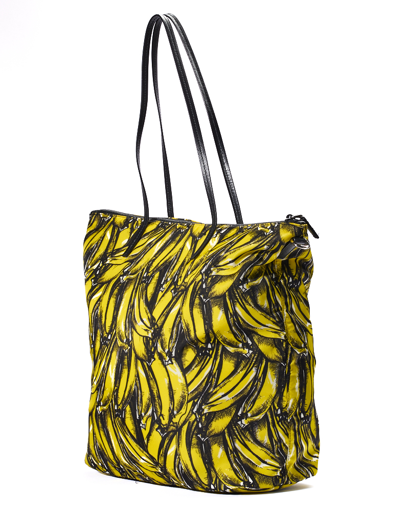 Borsa firmata Prada, modello Shopper Vertical nella misura large, realizzata in nylon nella fantasia banane con rifiniture in pelle nera e hardware argento. Dotata di una chiusura superiore a zip, internamente rivestita in nylon nero con due comode tasche, la borsa è abbastanza capiente. Munita di doppio manico in pelle e di una tracolla rimovibile in tessuto, per una comoda portata a mano o a spalla. L’articolo si presenta in ottime condizioni.