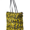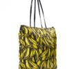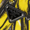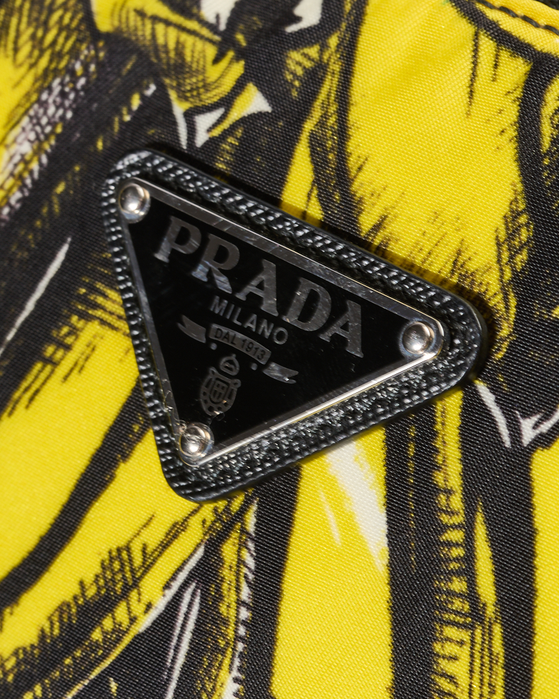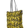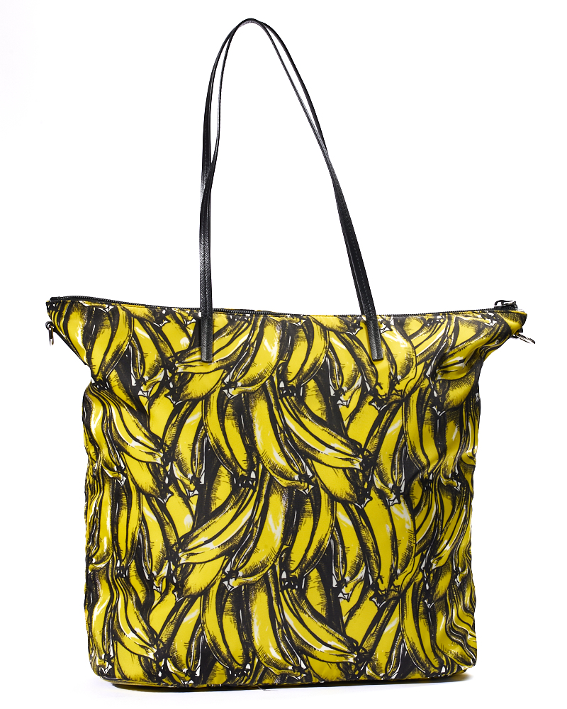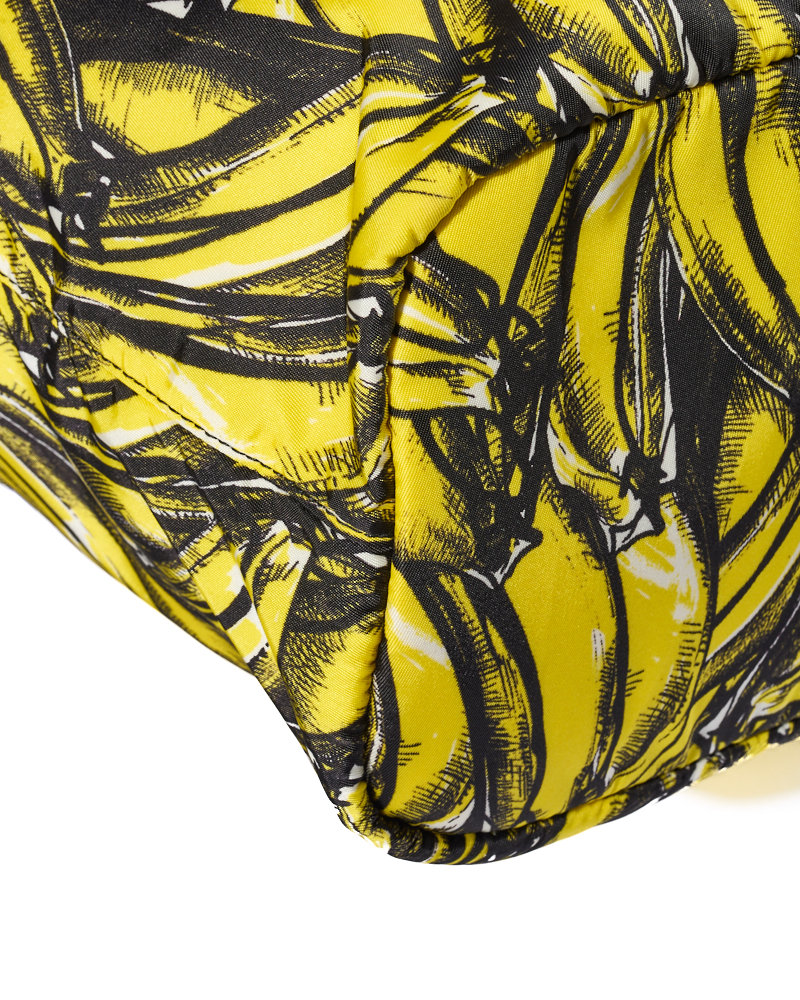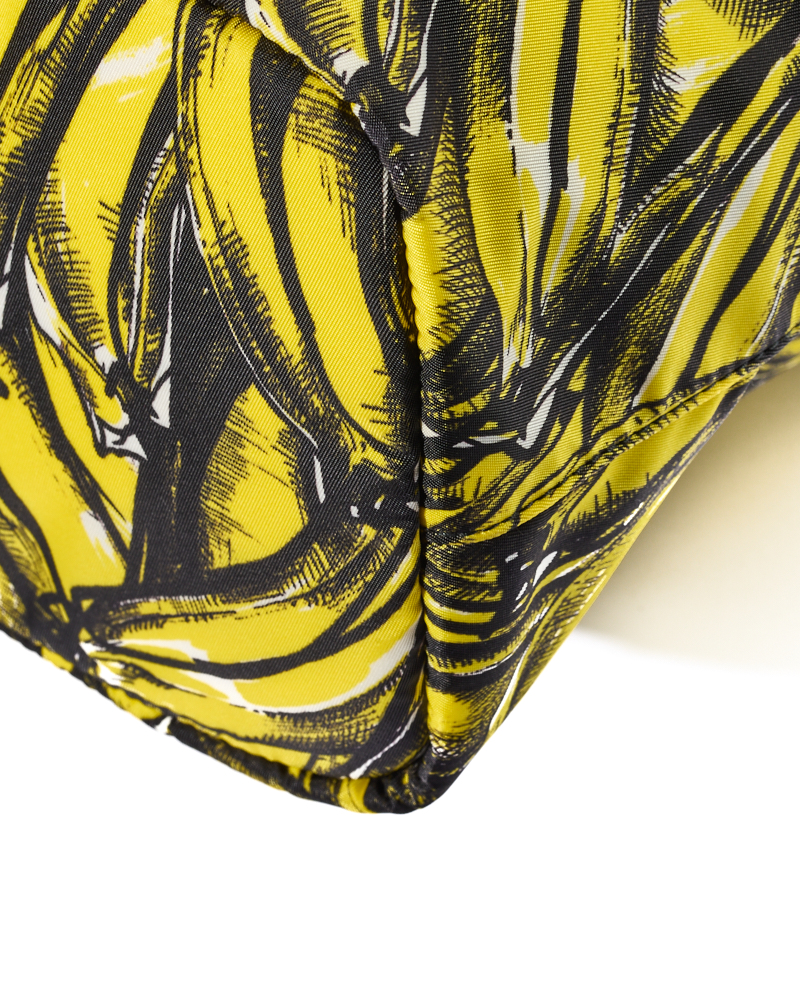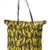 Borsa firmata Prada, modello Shopper Vertical nella misura large, realizzata in nylon nella fantasia banane con rifiniture in pelle nera e hardware argento. Dotata di una chiusura superiore a zip, internamente rivestita in nylon nero con due comode tasche, la borsa è abbastanza capiente. Munita di doppio manico in pelle e di una tracolla rimovibile in tessuto, per una comoda portata a mano o a spalla. L’articolo si presenta in ottime condizioni.