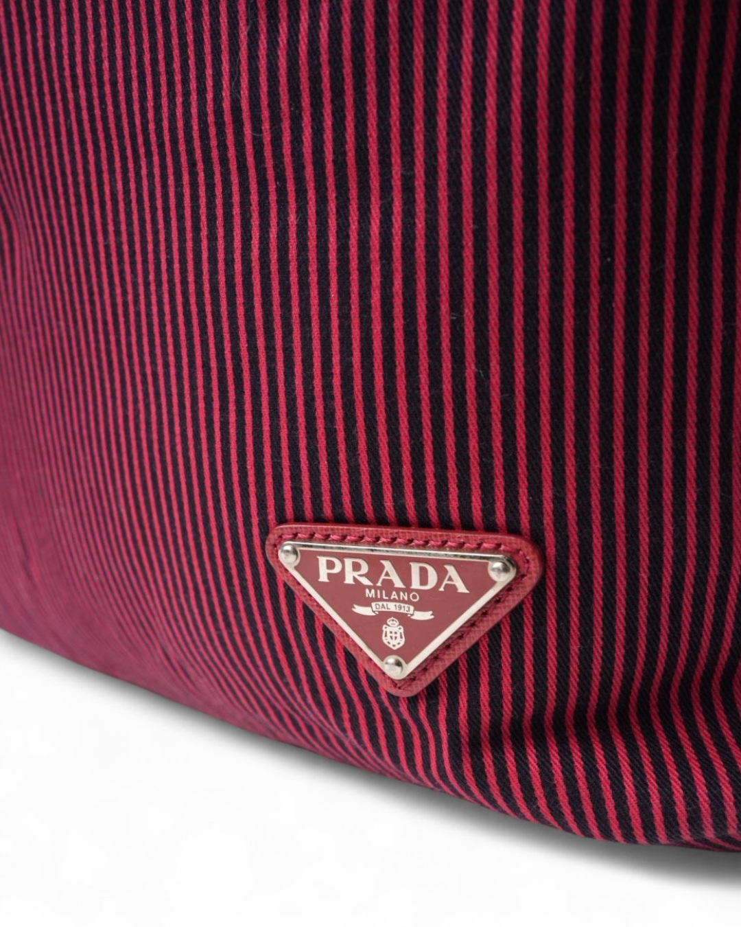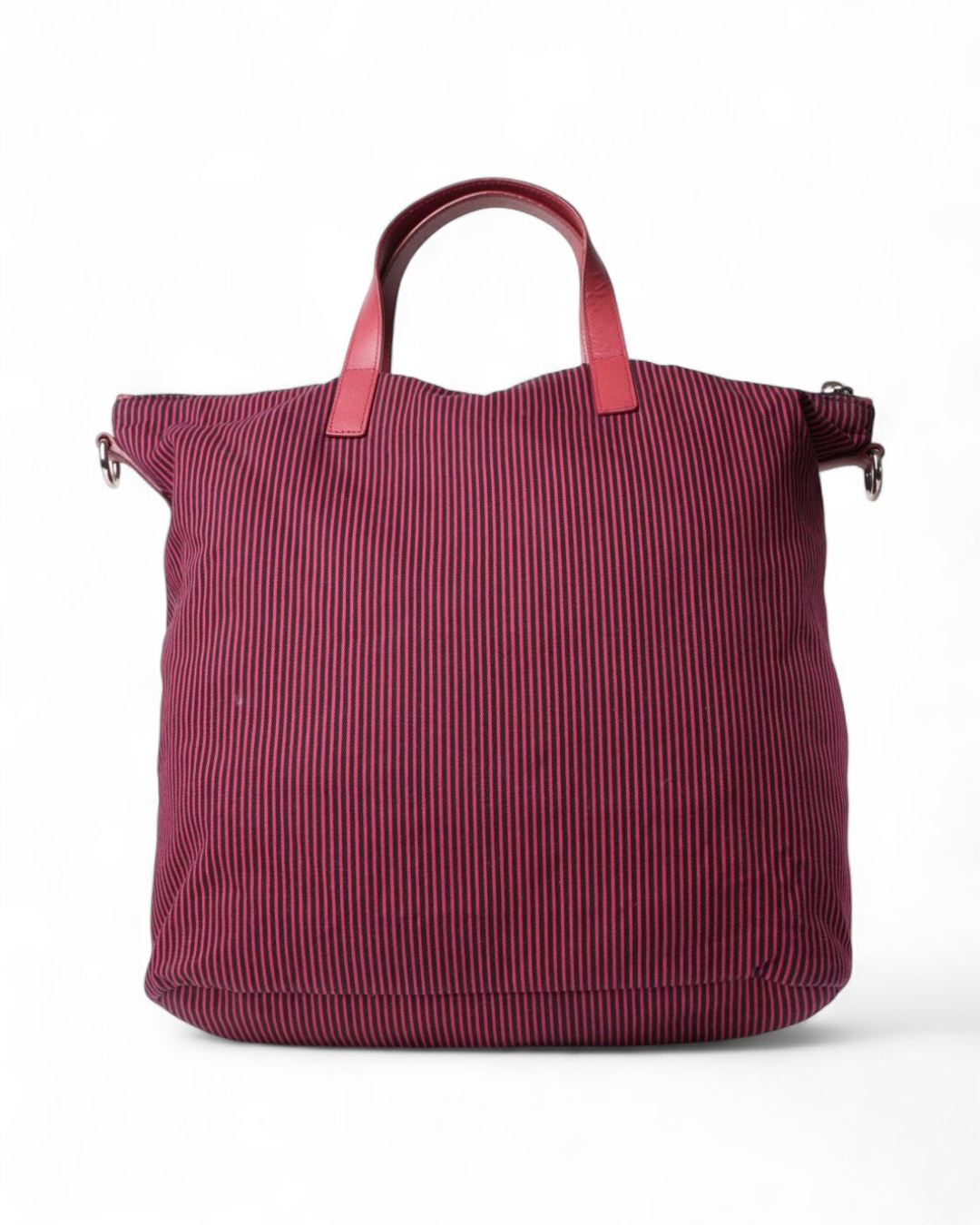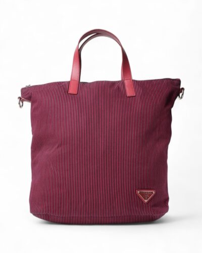 Borsa firmata Prada, modello Shopper Vertical nella misura medium, realizzata in tessuto con fantasia a righe e rifiniture in pelle rossa e hardware argento. Dotata di una chiusura superiore a zip, internamente rivestita in tessuto logato tono su tono con comoda tasca, la borsa è abbastanza capiente. Munita di doppio manico in pelle e di una tracolla rimovibile e regolabile, per una comoda portata a spalla o a tracolla. L’articolo si presenta in buone condizioni.