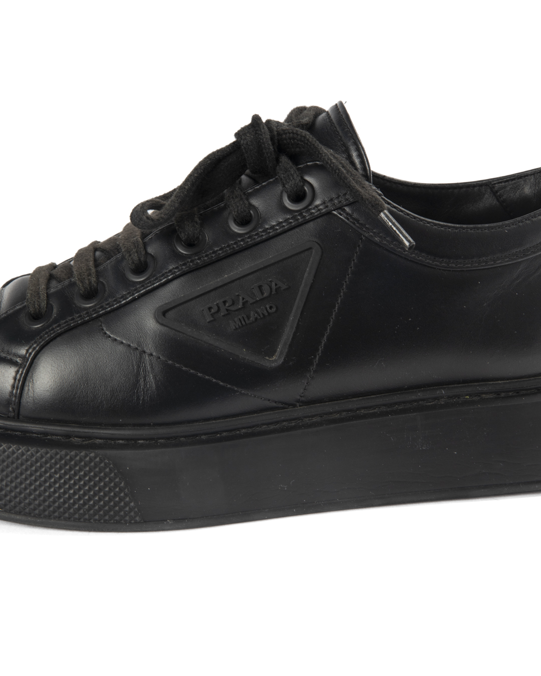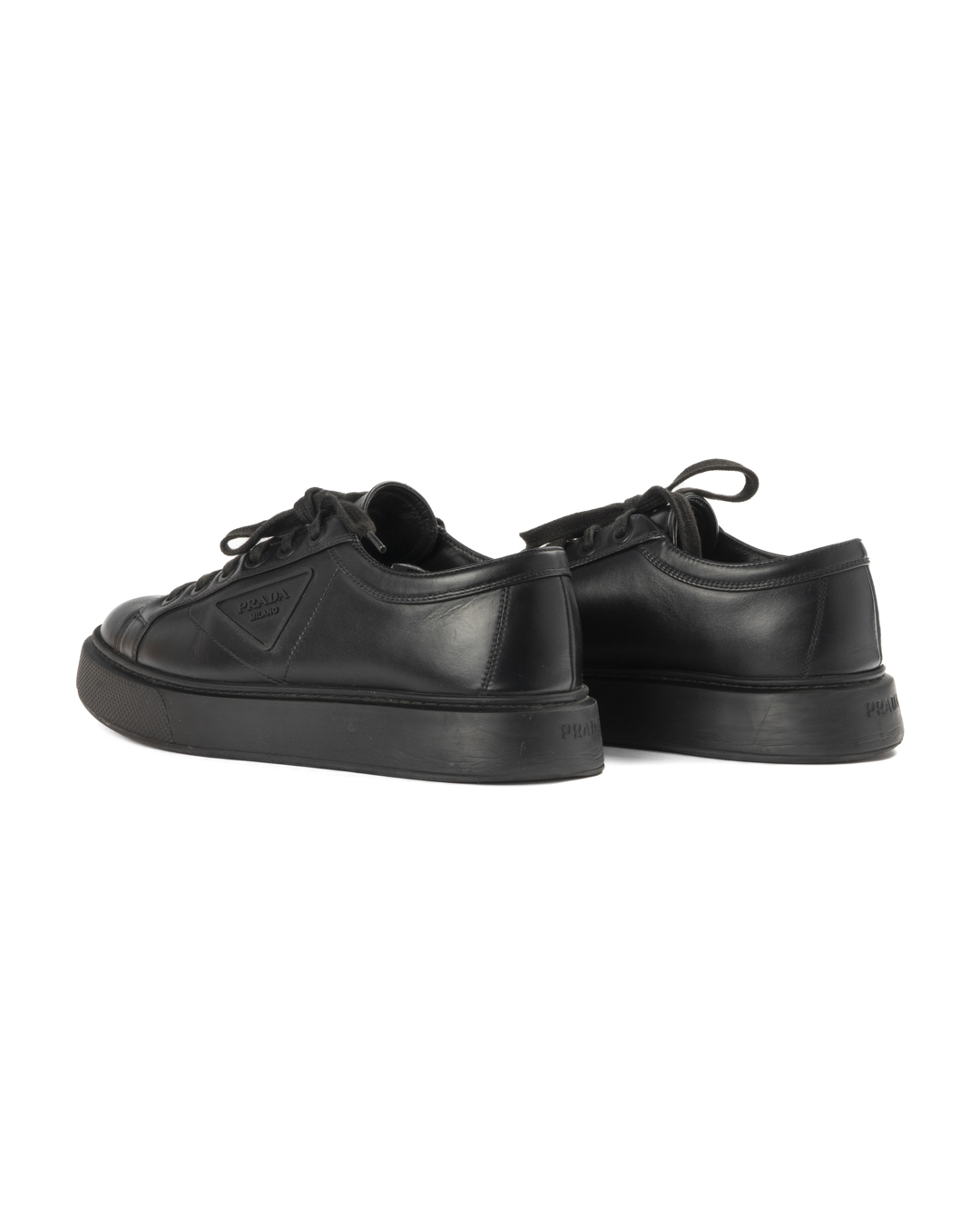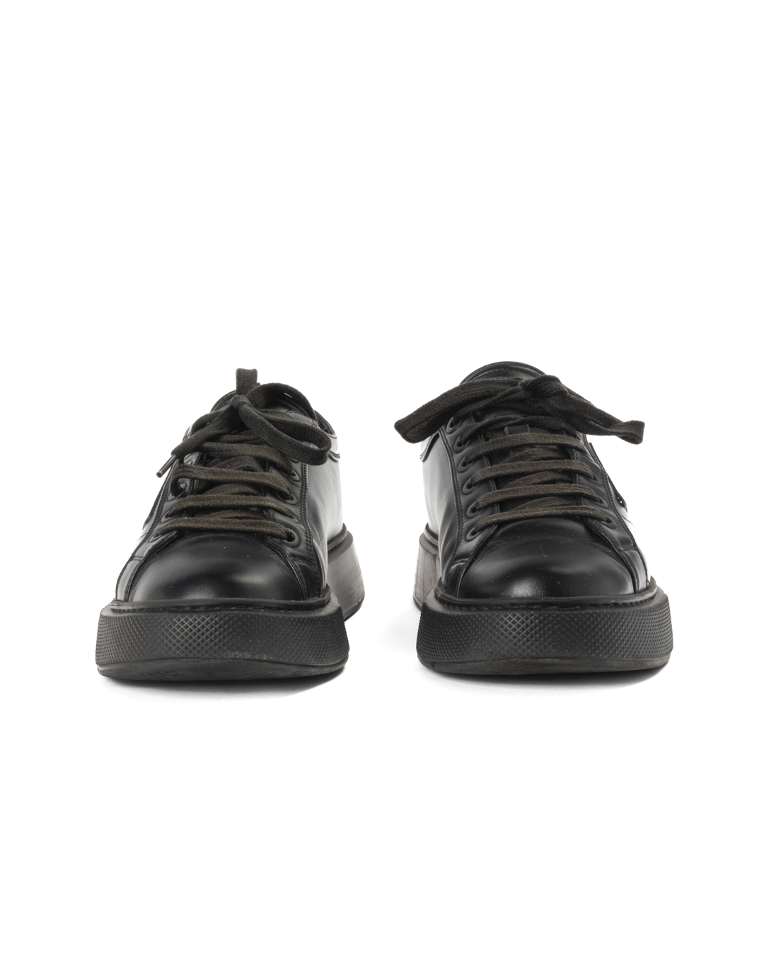 Sneakers firmate Prada, modello Macro, realizzate in pelle nera e arricchite dal classico logo del brand sul lato. Presentano una suola doppia in gomma tono su tono, numero 41 IT. L'articolo si presenta in buone condizioni, con segni di usura visibili in foto.