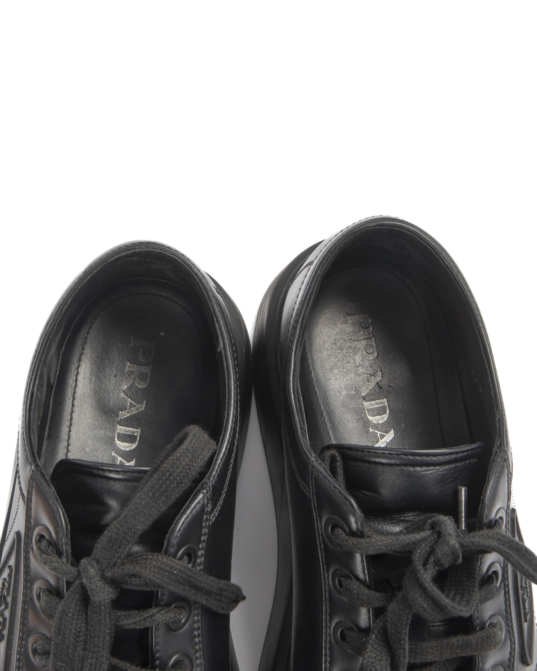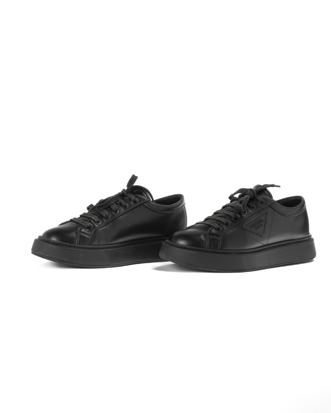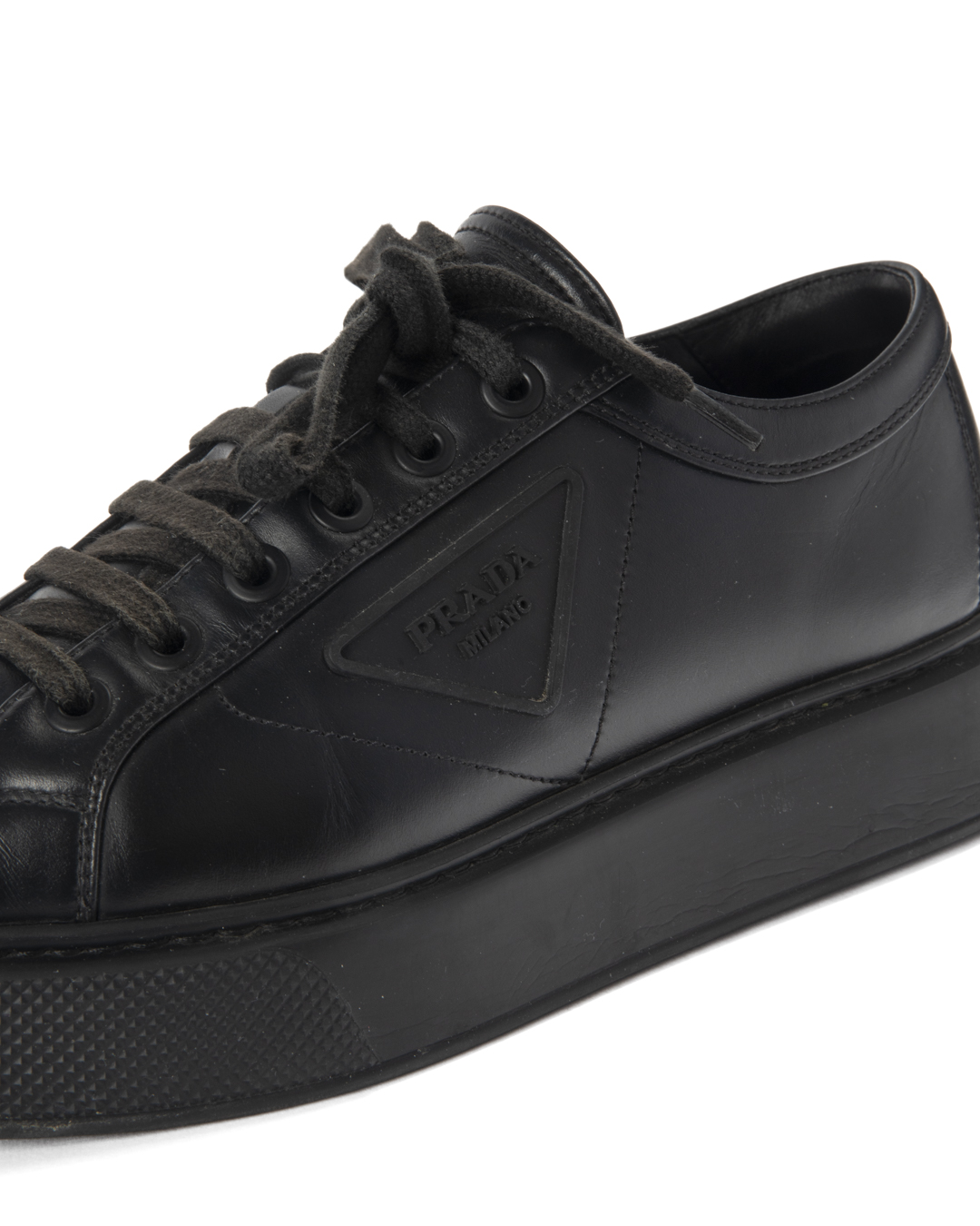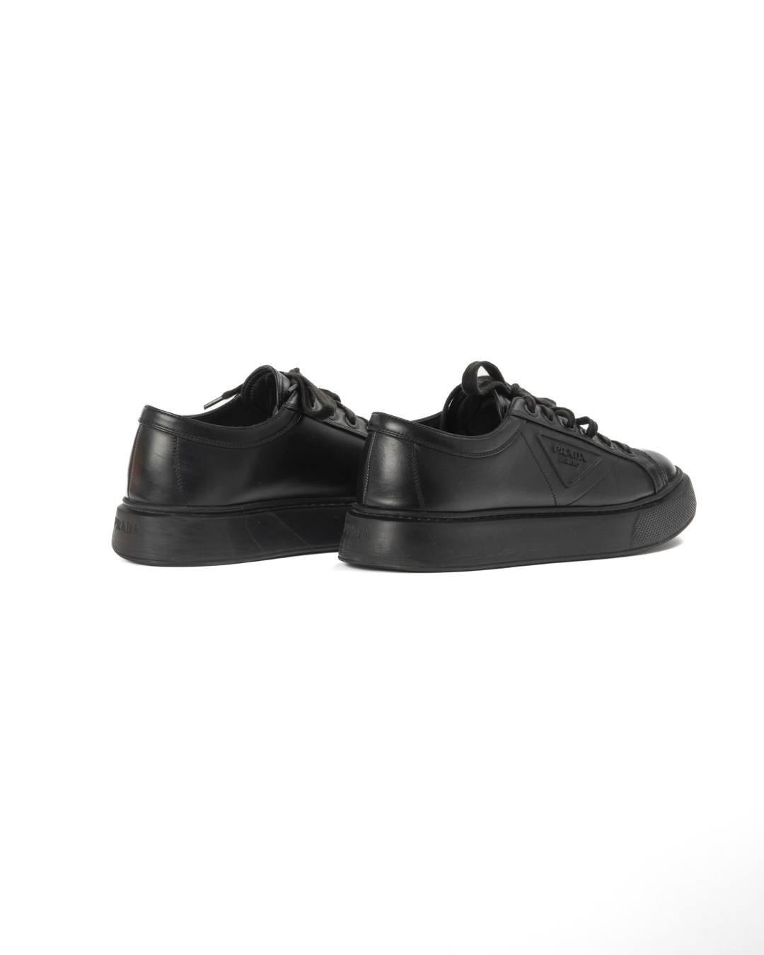 Sneakers firmate Prada, modello Macro, realizzate in pelle nera e arricchite dal classico logo del brand sul lato. Presentano una suola doppia in gomma tono su tono, numero 41 IT. L'articolo si presenta in buone condizioni, con segni di usura visibili in foto.