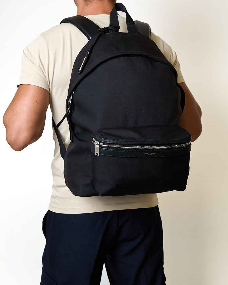 Zaino firmato Saint Laurent, modello City nella misura medium, realizzata in tela nera con inserti in pelle e hardware argento. Dotata di una chiusura superiore a zip con doppio cursore, internamente rivestito in tela con comode tasche, la borsa è molto capiente. Munito di doppi spallacci regolabili in pelle, per una comoda portata a spalla. Presenta una comoda tasca con chiusura a zip sulla parte frontale. L’articolo si presenta in buone condizioni.