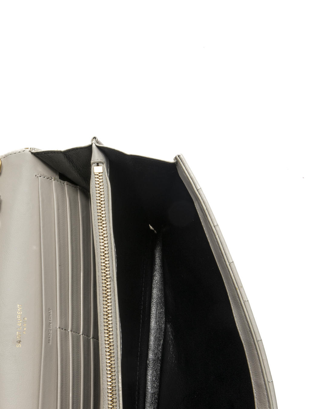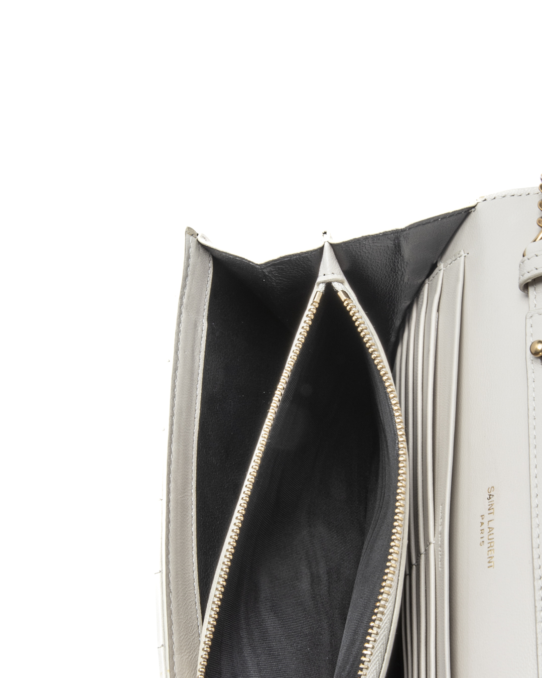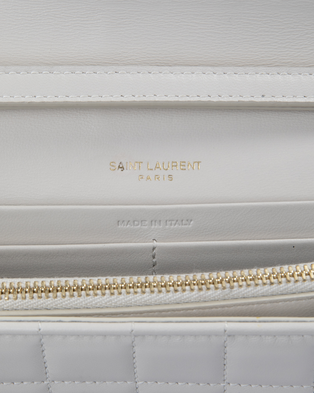 Borsa firmata Saint Laurent, modello Cassandre nella misura medium, realizzata in pelle trapuntata bianca e hardware dorato. Dotata di una patta con classico logo del brand "YSL" in metallo e chiusura a clip, internamente rivestita in pelle con molteplici tasche, la borsa è capiente per l'essenziale. Munita di una tracolla rimovibile in pelle e catena, per una comoda portata a spalla o a mano. L'articolo si presenta in ottime condizioni.