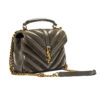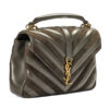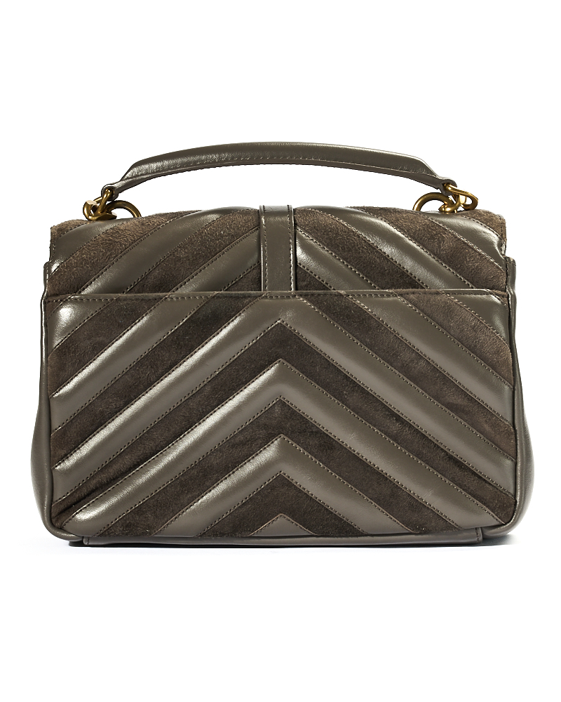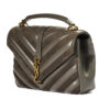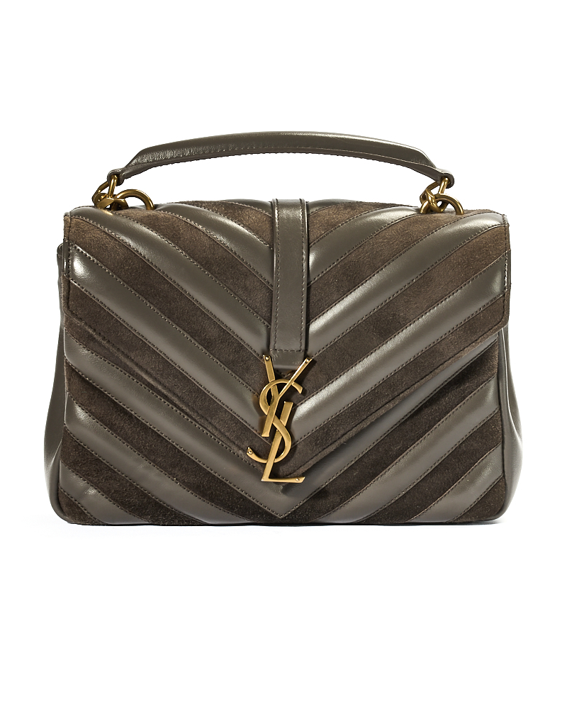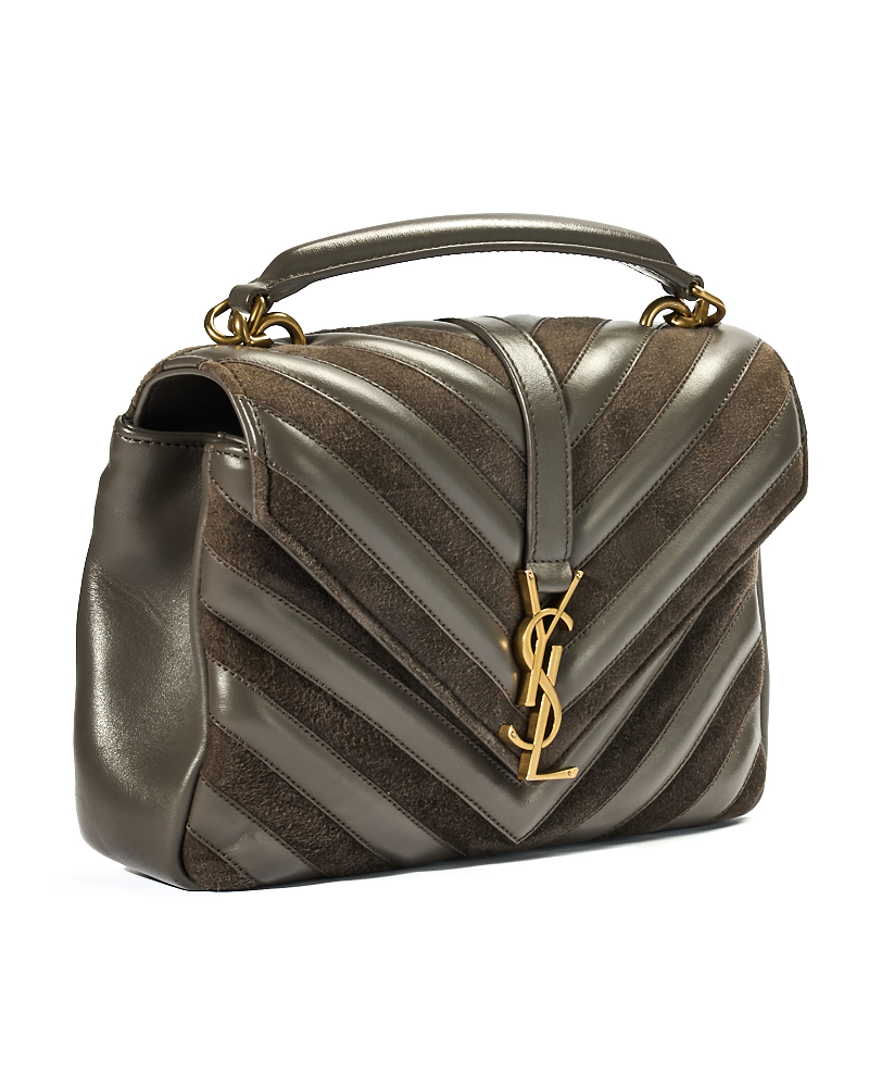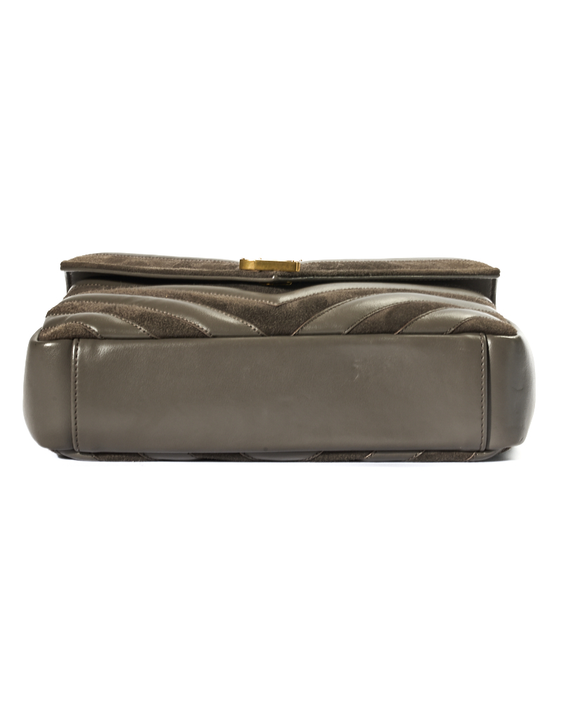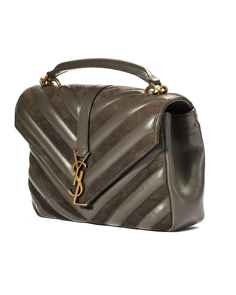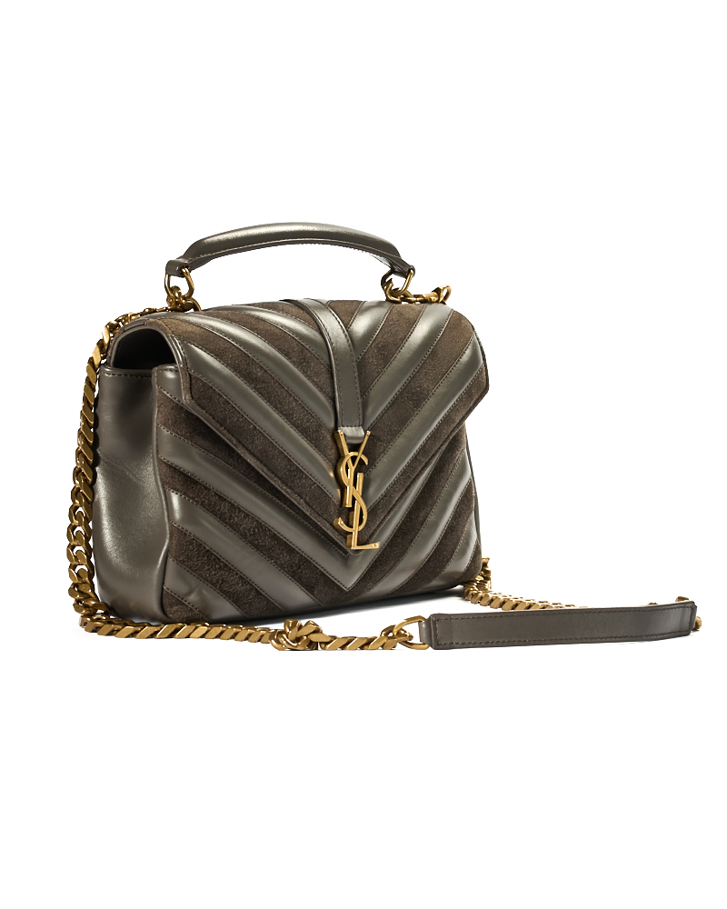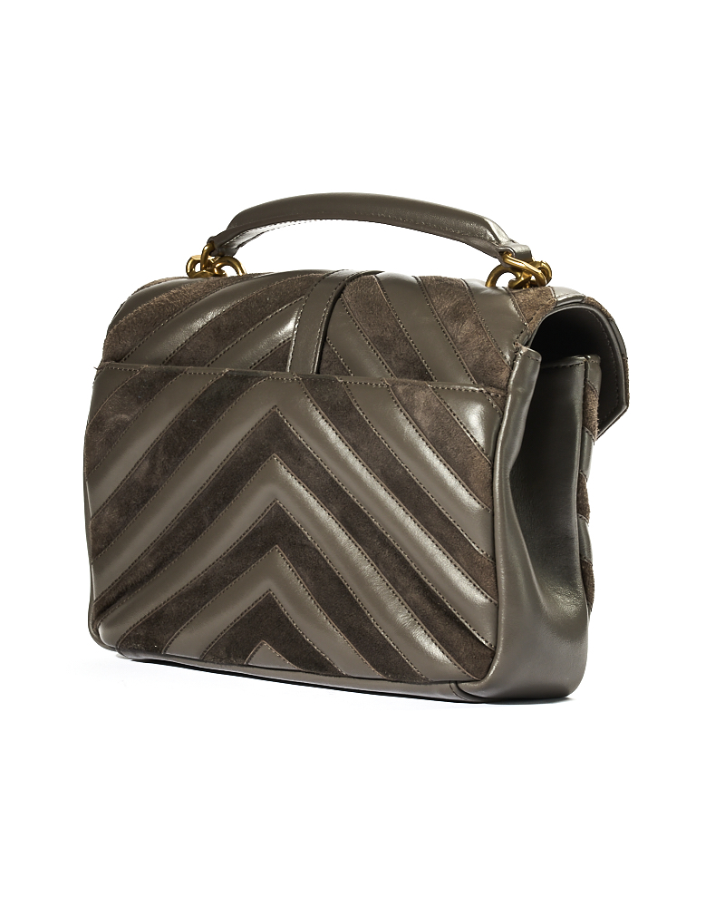 Borsa firmata Saint Laurent, modello College nella misura medium, realizzata in pelle grigia con rifiniture in velluto e hardware dorata. Dotata di una patta con classico logo del brand “YSL” e chiusura calamitata, internamente rivestita in tela nera con comodi scompartimenti e tasche, la borsa è abbastanza capiente. Munita di un manico e di una tracolla rimovibile e regolabile, per una comoda portata a mano a spalla. L’articolo si presenta in ottime condizioni.