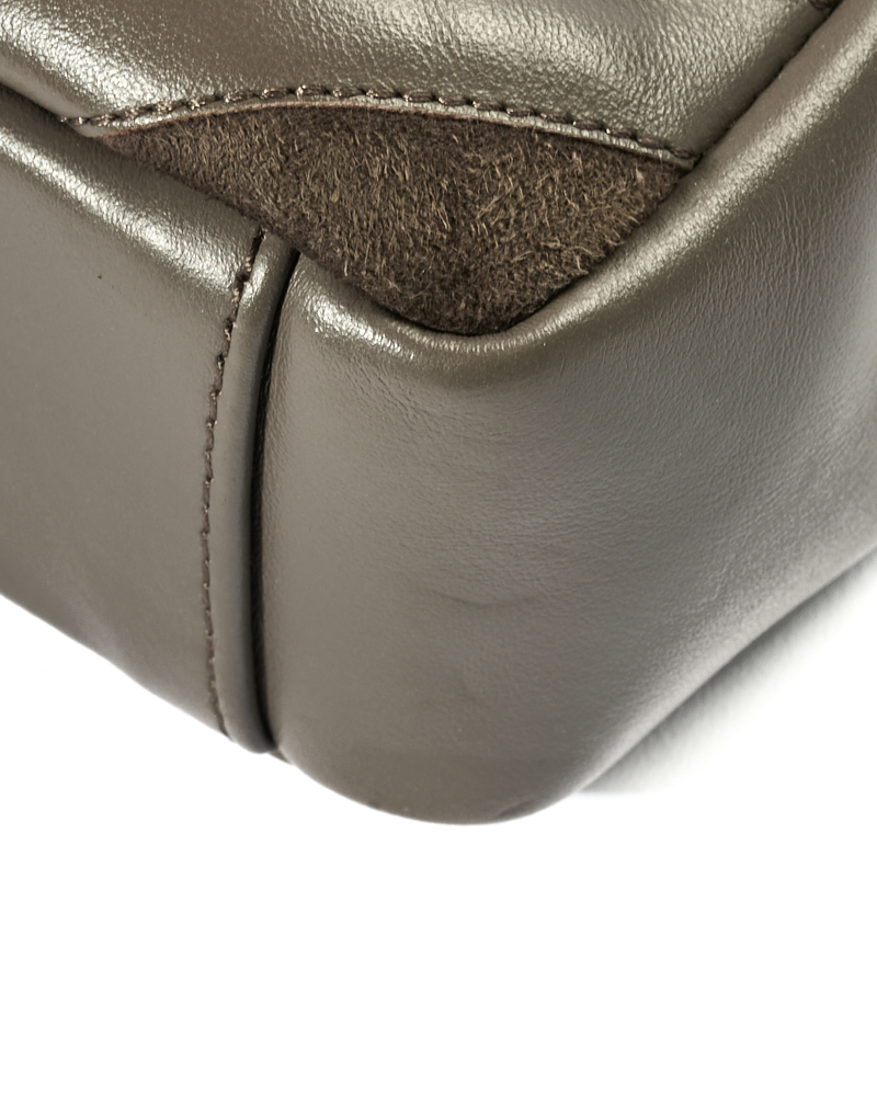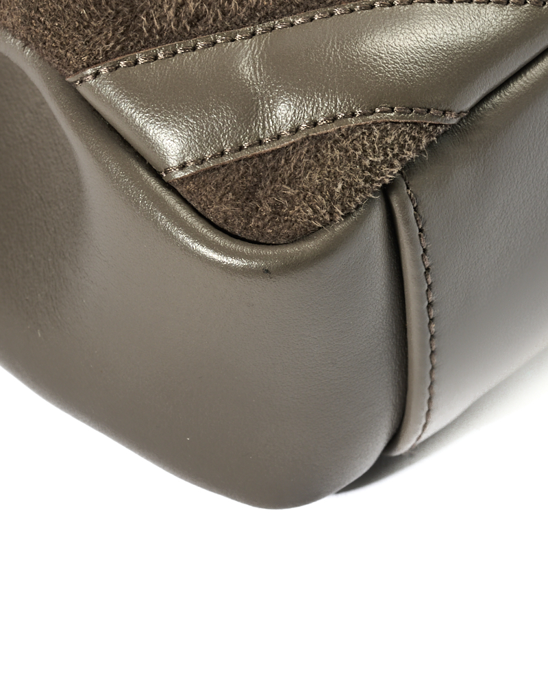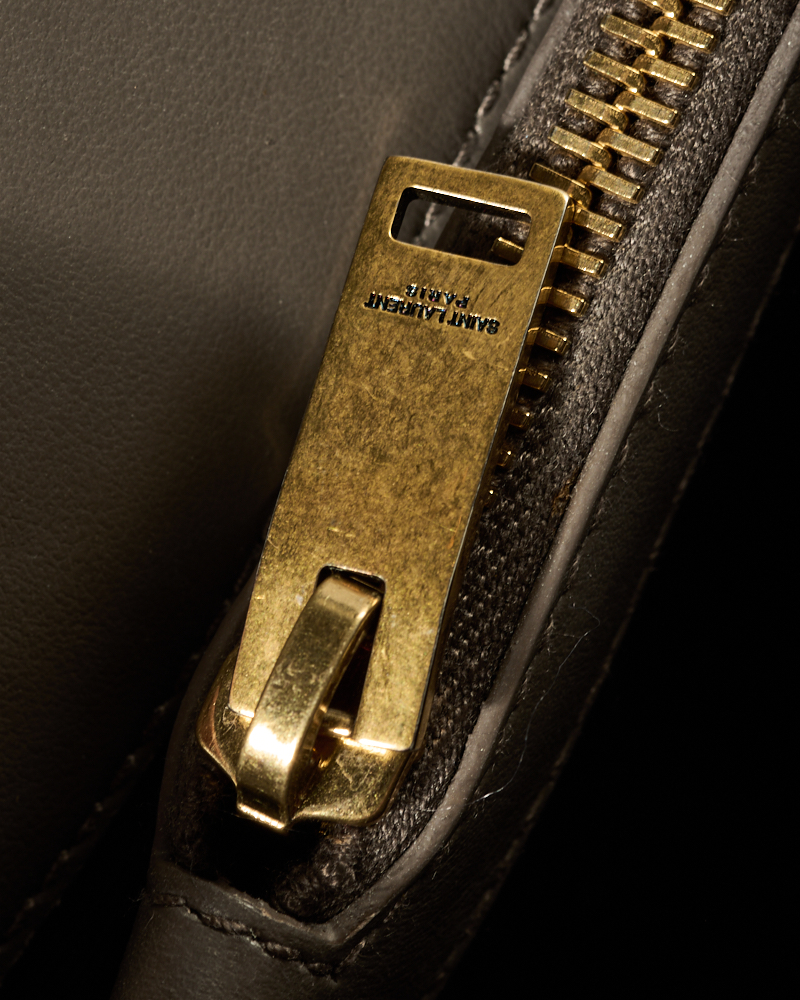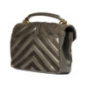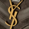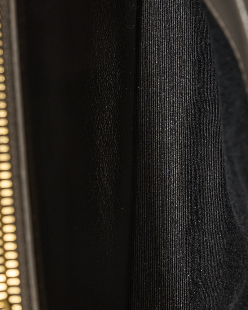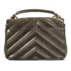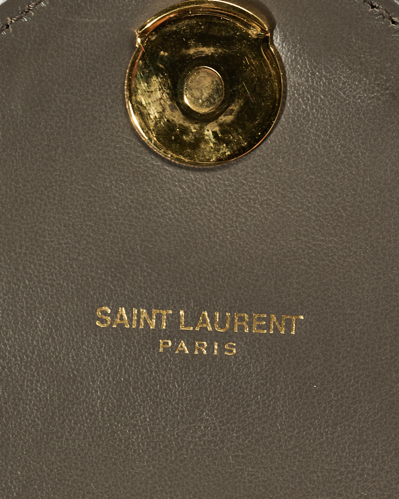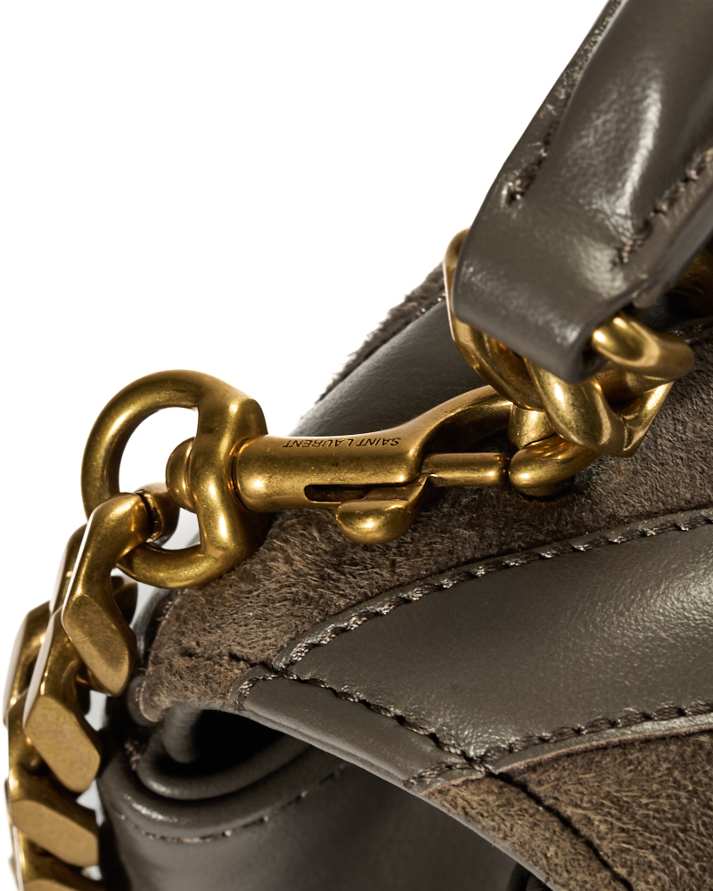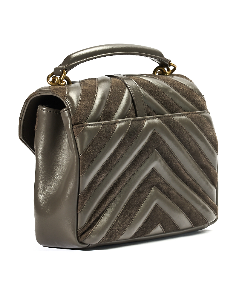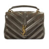 Borsa firmata Saint Laurent, modello College nella misura medium, realizzata in pelle grigia con rifiniture in velluto e hardware dorata. Dotata di una patta con classico logo del brand “YSL” e chiusura calamitata, internamente rivestita in tela nera con comodi scompartimenti e tasche, la borsa è abbastanza capiente. Munita di un manico e di una tracolla rimovibile e regolabile, per una comoda portata a mano a spalla. L’articolo si presenta in ottime condizioni.