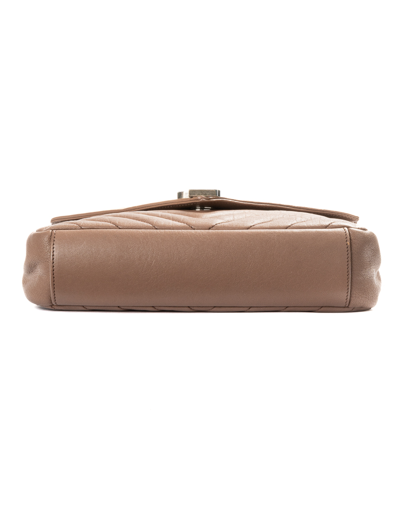 Borsa firmata Saint Laurent, modello college nella misura medium, realizzato in pelle trapuntata con motivo matellassè nella colorazione dark beige e hardware argento. Dotata di una patta con classico logo del brand e chiusura calamitata, internamente rivestita in tessuto nero con comodi scompartimenti e tasche, la borsa è abbastanza capiente. Munita di un manico e di una tracolla rimovibile e regolabile, per una comoda portata a spalla o a mano. L’articolo si presenta in ottime condizioni.