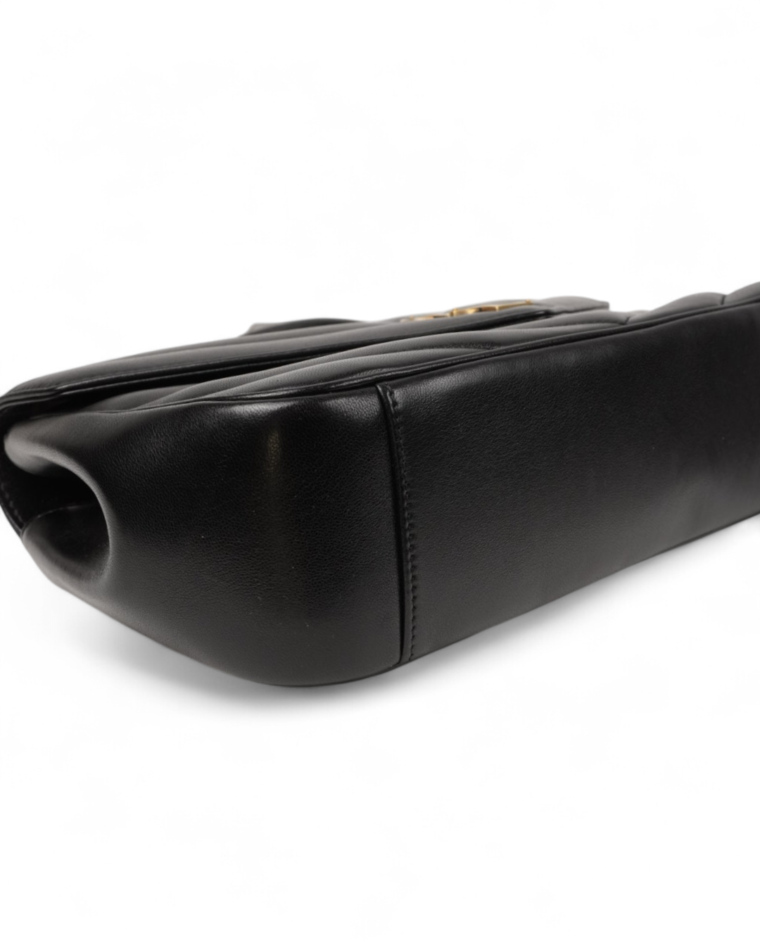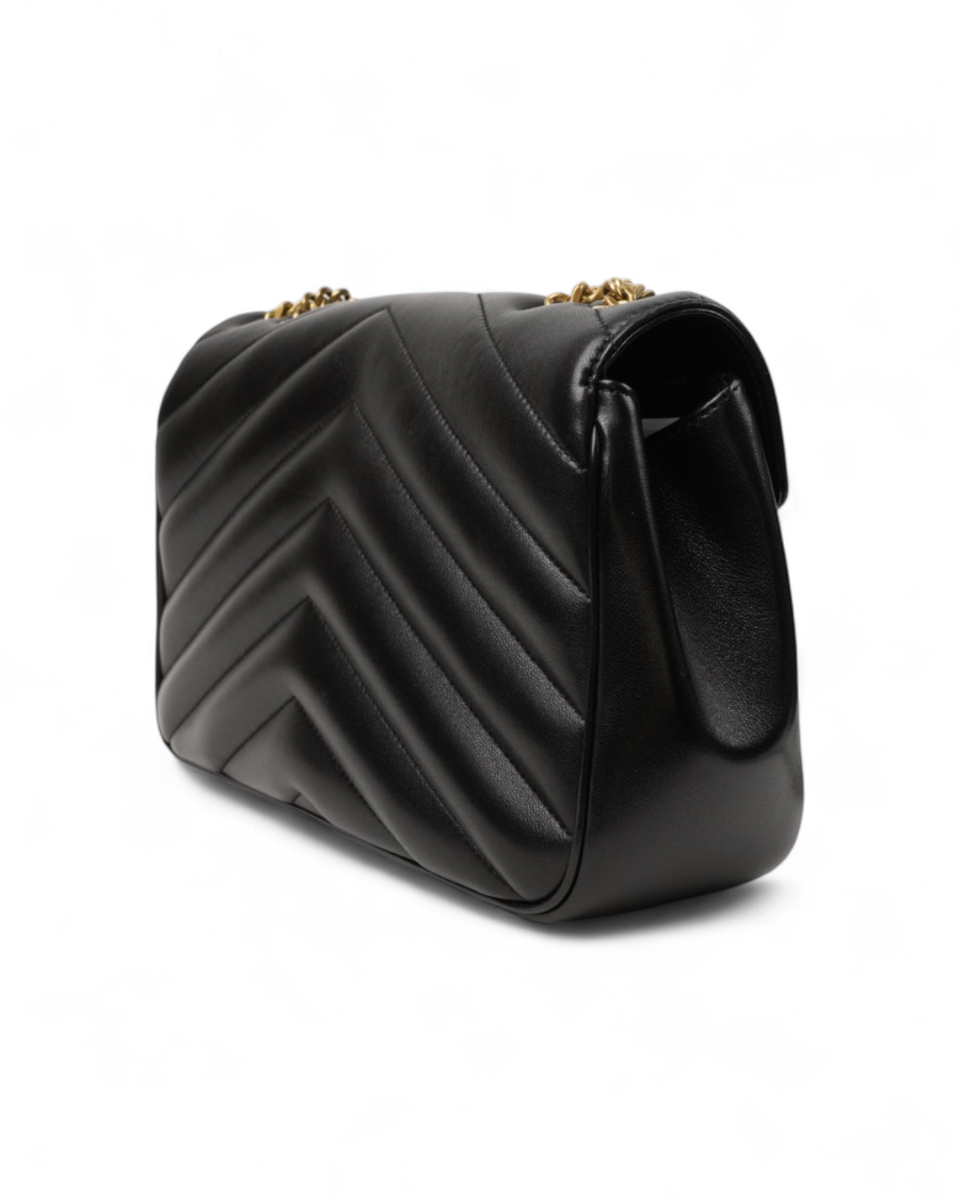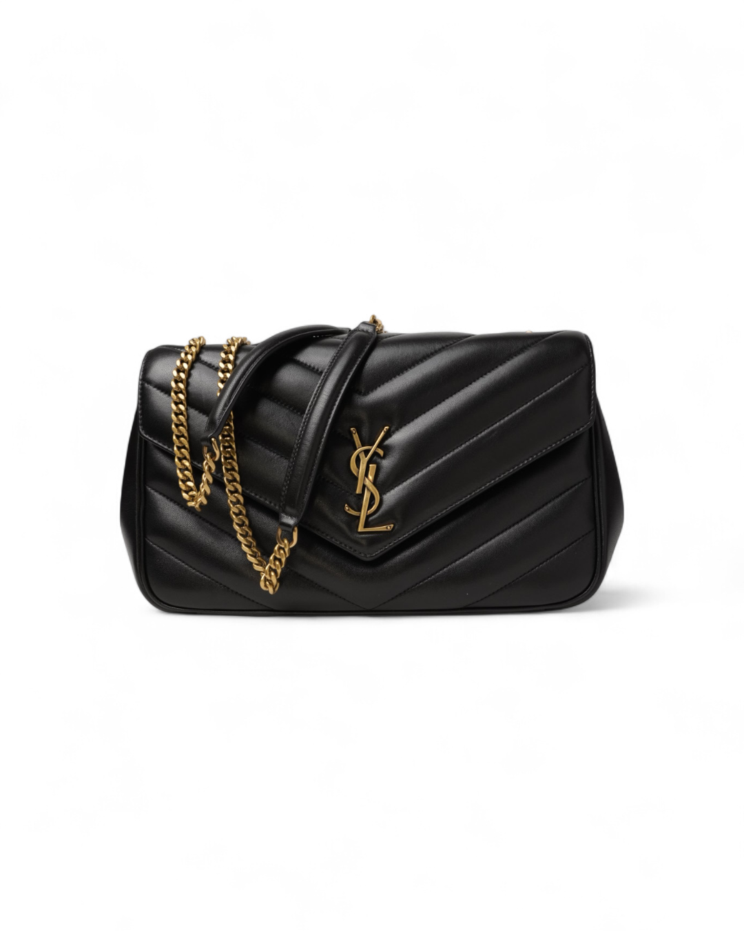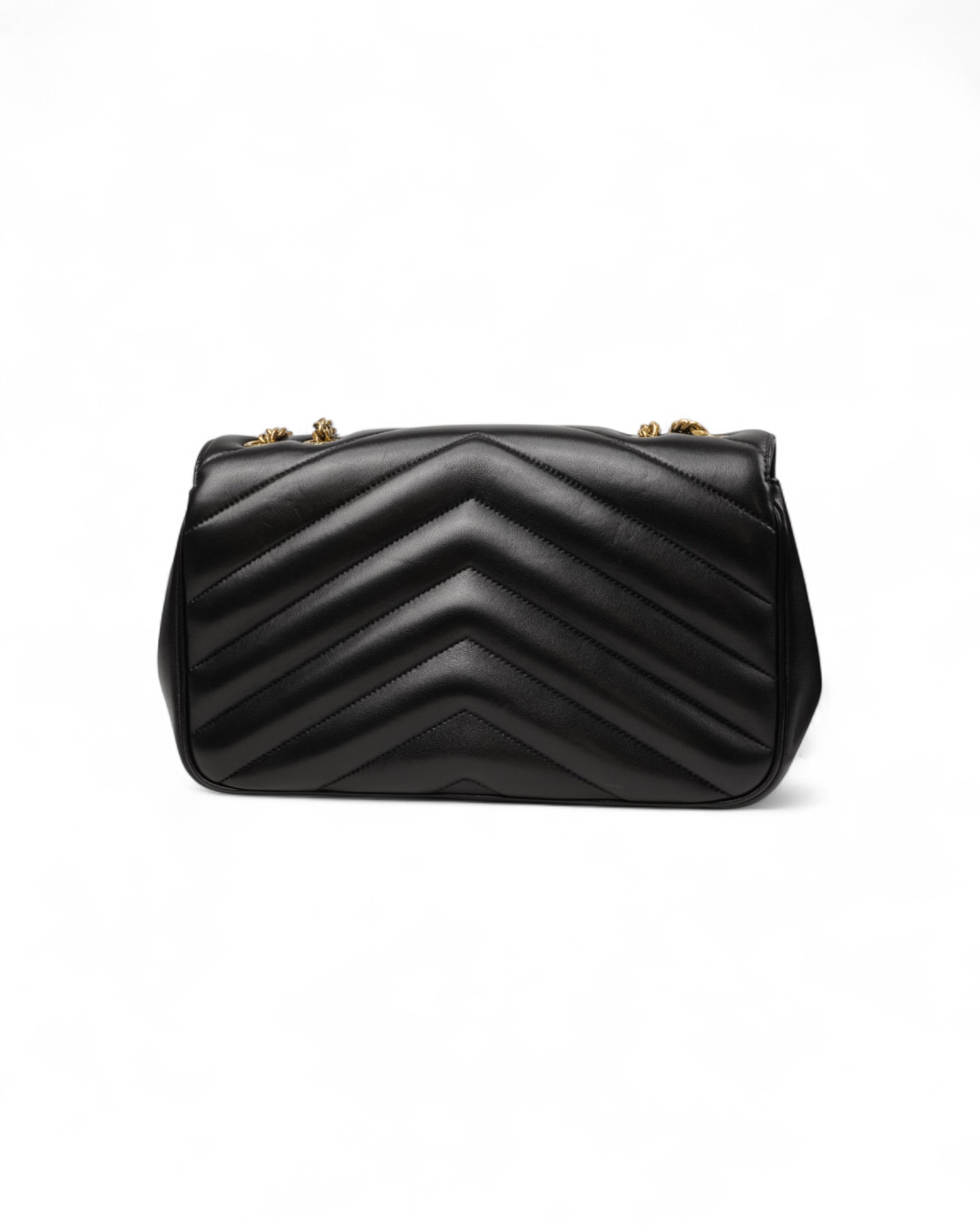 Borsa firmata Saint Laurent, modello Lou Lou nella misura medium, realizzata in pelle trapuntata nera con hardware dorato. Dotata di una patta frontale con classico logo del brand “YSL” in metallo e chiusura calamitata. Internamente rivestita in tela nera con comode tasche, la borsa è abbastanza capiente. Munita di doppio manico in pelle e catena, per una comoda portata a spalla o a tracolla. Completa di specchietto rimovibile interno. L’articolo si presenta in condizioni pari al