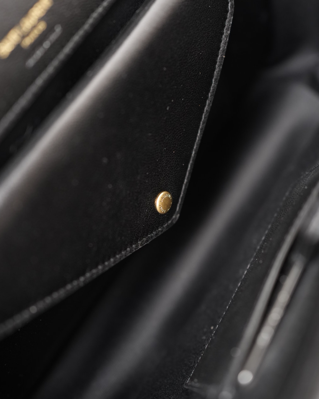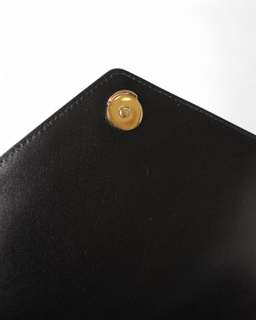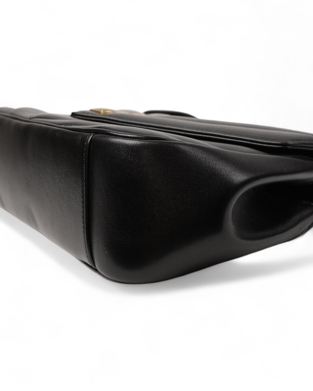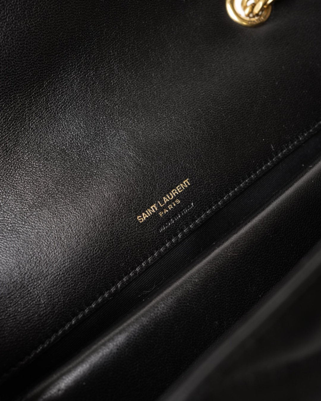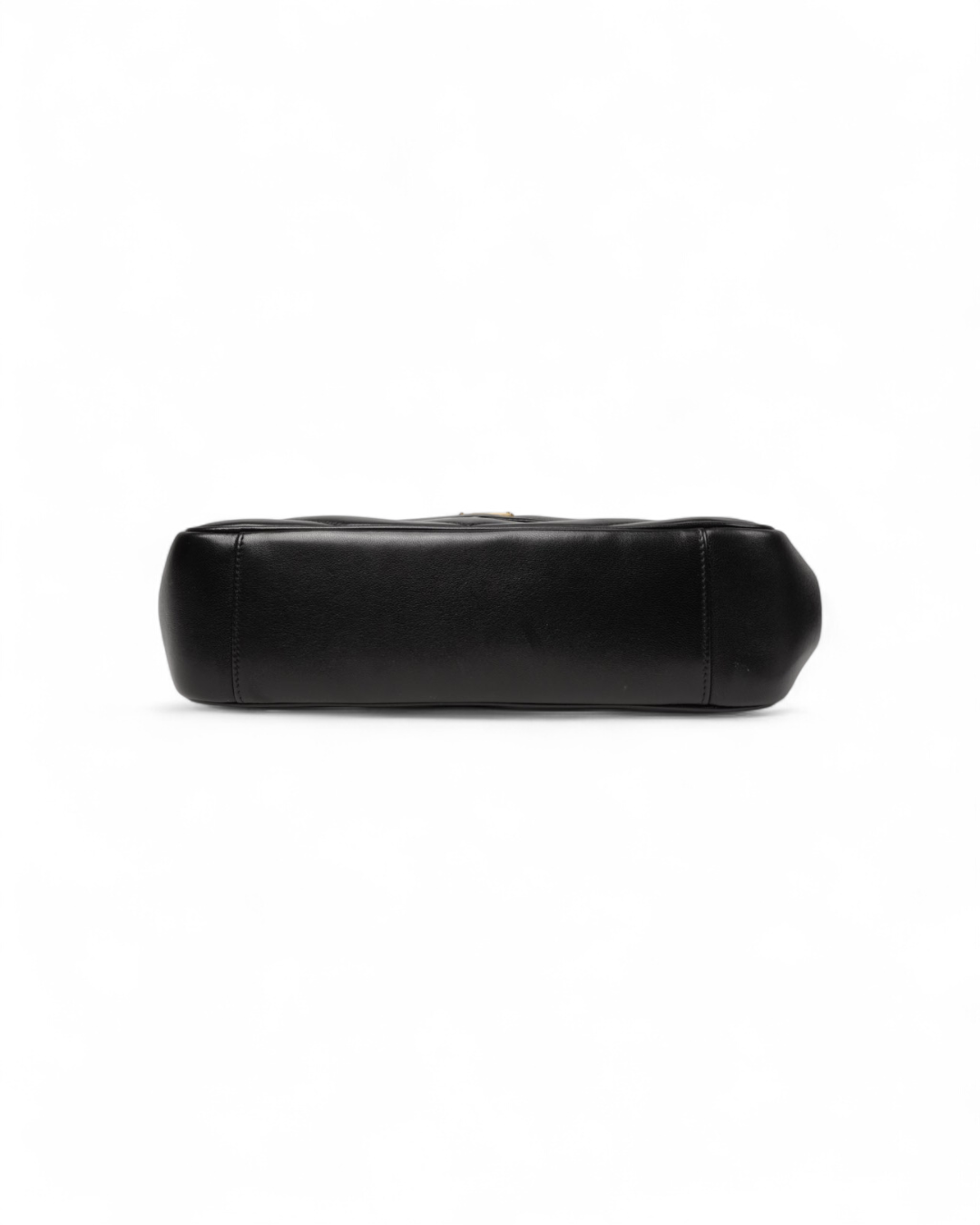 Borsa firmata Saint Laurent, modello Lou Lou nella misura medium, realizzata in pelle trapuntata nera con hardware dorato. Dotata di una patta frontale con classico logo del brand “YSL” in metallo e chiusura calamitata. Internamente rivestita in tela nera con comode tasche, la borsa è abbastanza capiente. Munita di doppio manico in pelle e catena, per una comoda portata a spalla o a tracolla. Completa di specchietto rimovibile interno. L’articolo si presenta in condizioni pari al