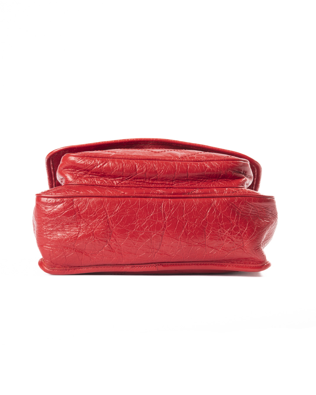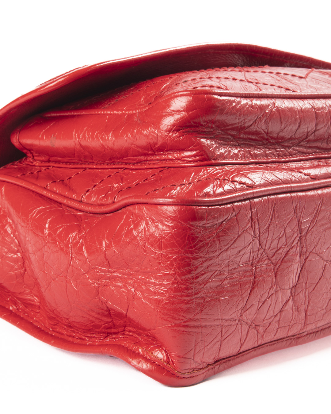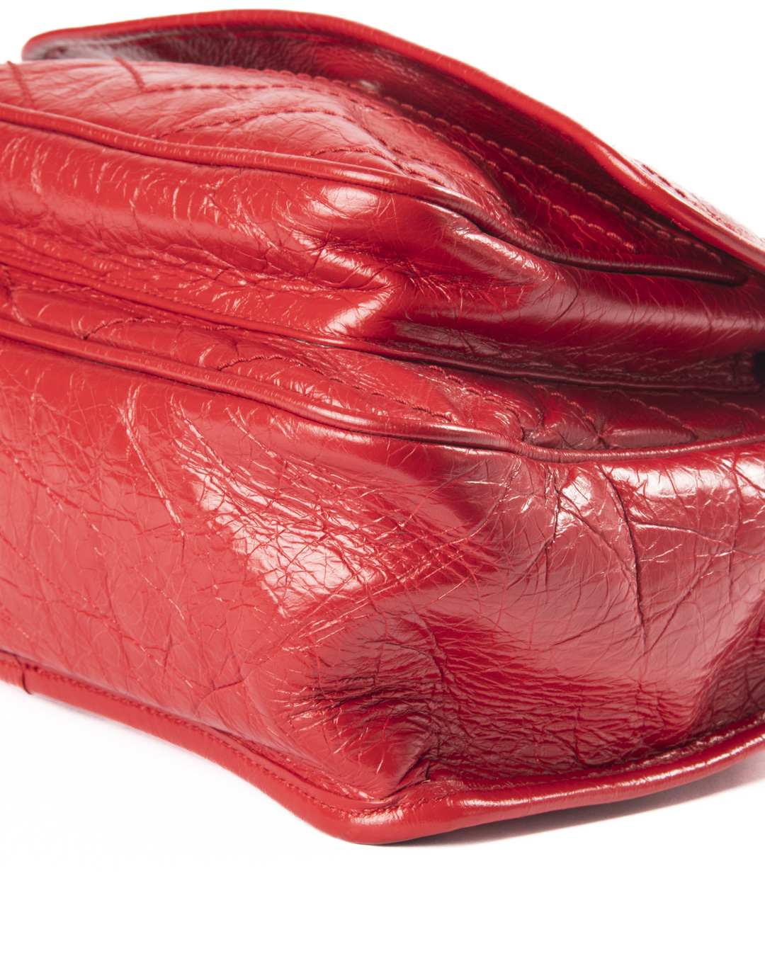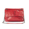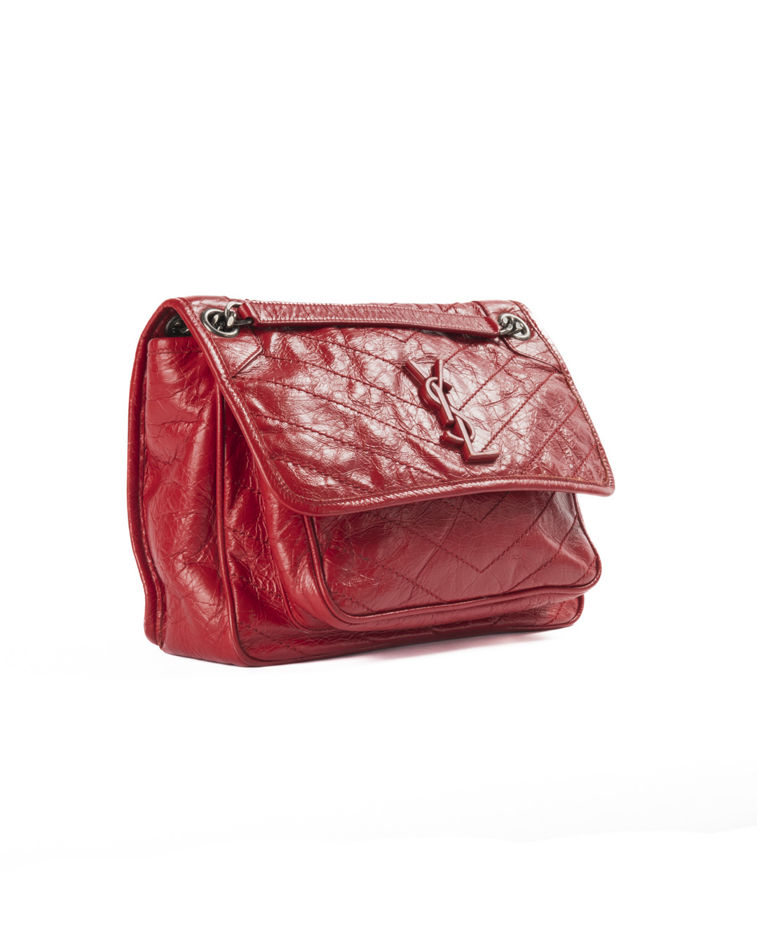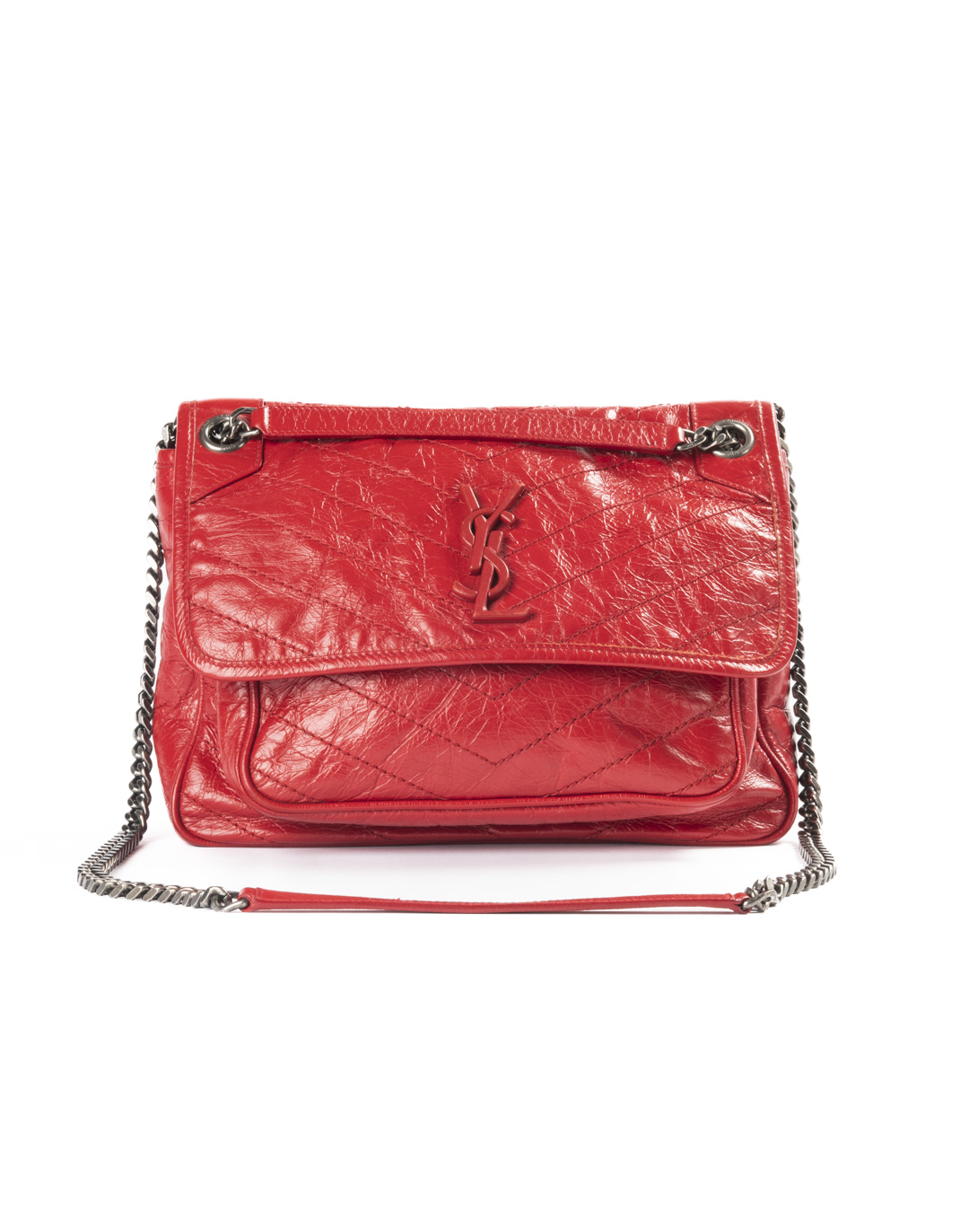 Borsa firmata Saint Laurent, modello Niki nella misura medium, realizzata in pelle vintage rossa con hardware argento. Dotata di una patta con classico logo del brand “YSL” in metallo e chiusura calamitata, internamente rivestita in tela nera con comode tasche, la borsa è abbastanza capiente. Munita di una tracolla a scorrimento in pelle e catena, per una comoda portata a spalla o a tracolla. L’articolo si presenta in ottime condizioni.