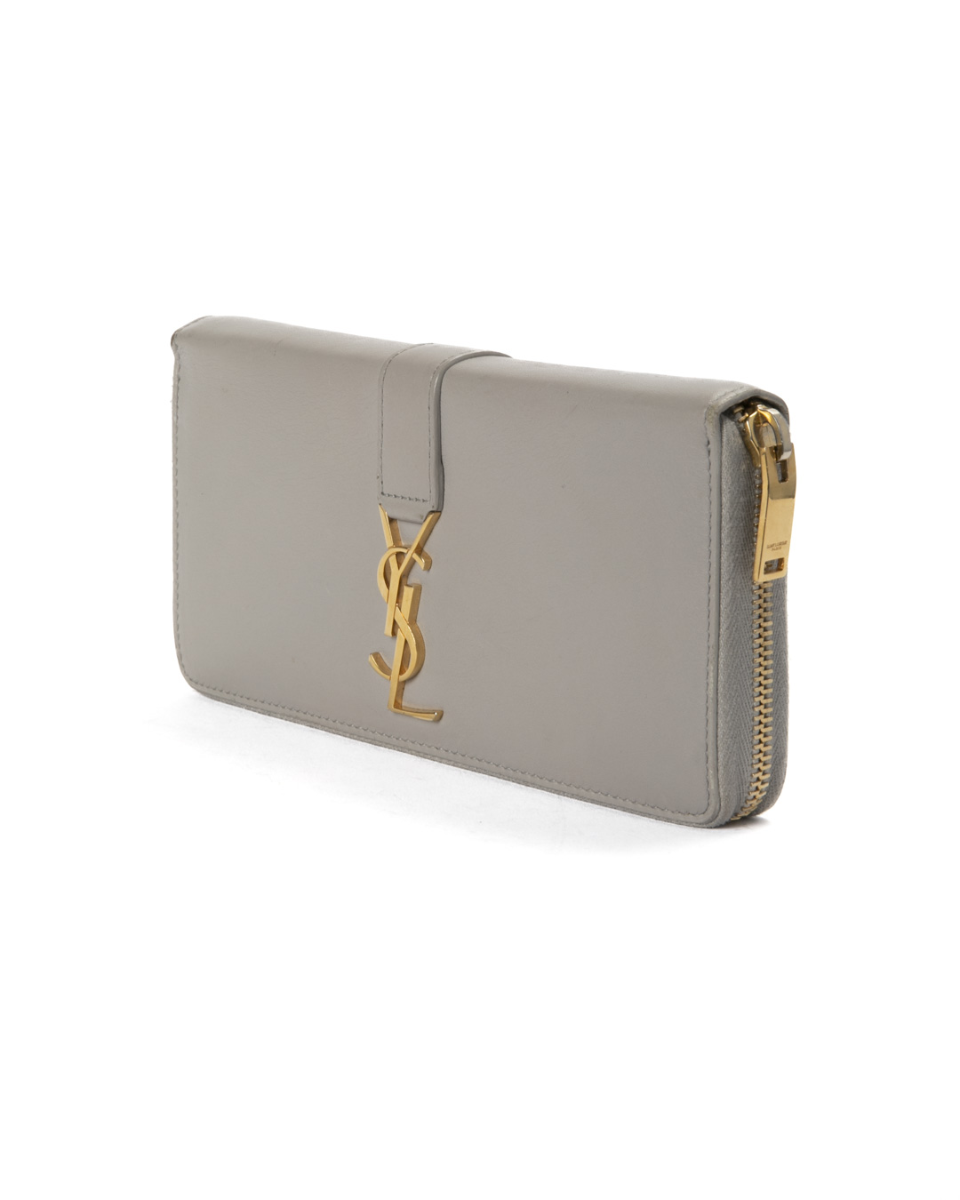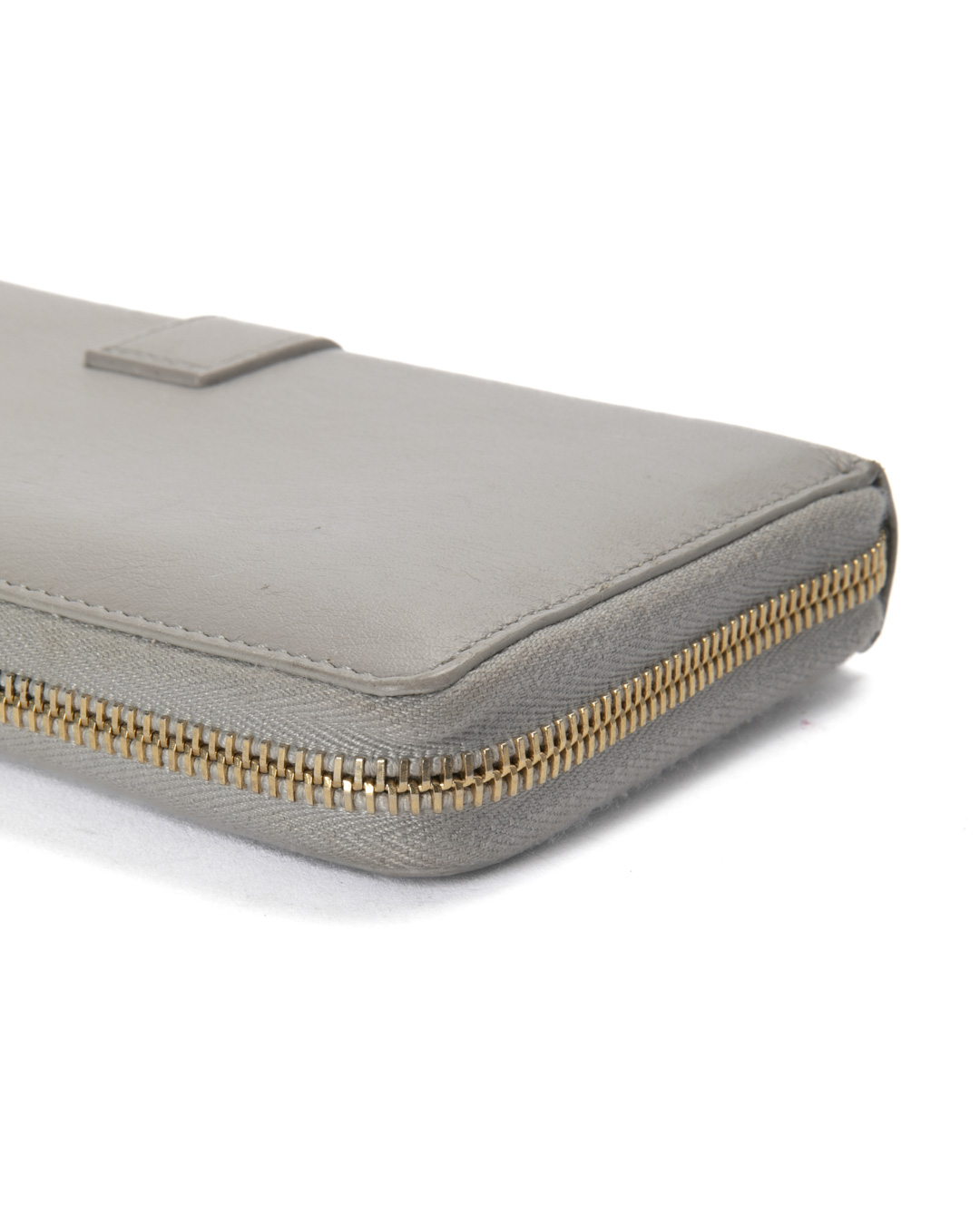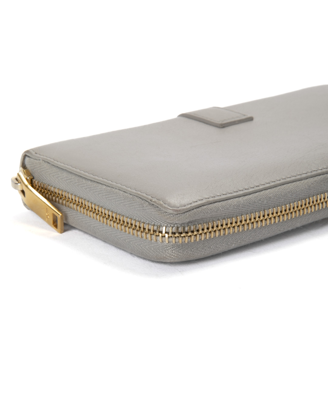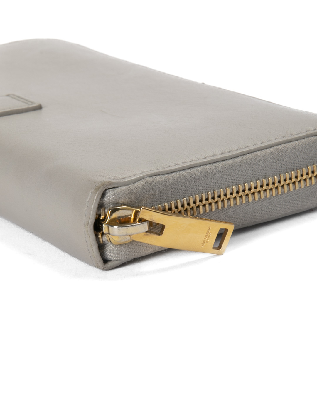 Portafoglio firmato Saint Laurent, modello College, realizzato in pelle liscia grigio con hardware dorato. Dotato di una chiusura semicircolare a zip, internamente rivestito in pelle con molteplici tasche tra cui una centrale, comodo per documenti e banconote. L'articolo si presenta in buone condizioni, con segni di usura visibili in foto.