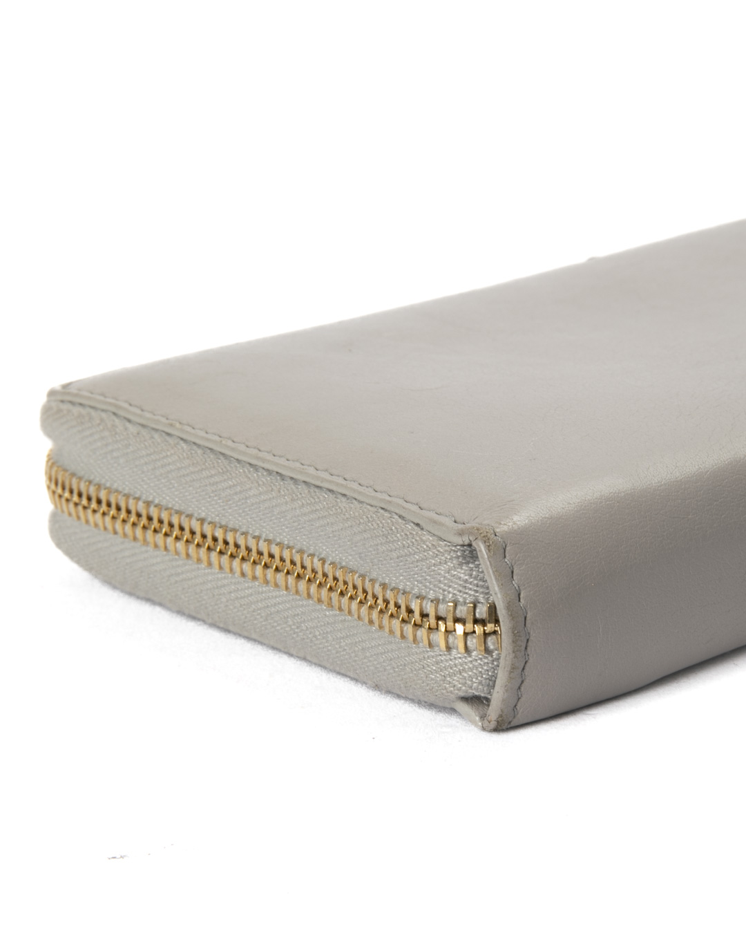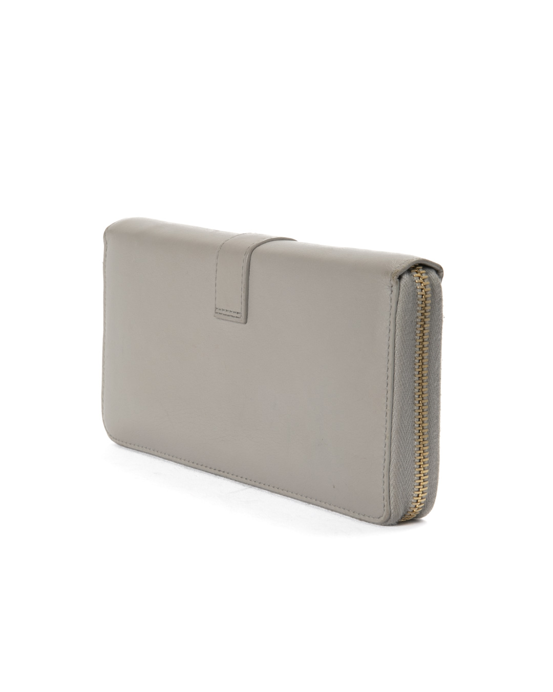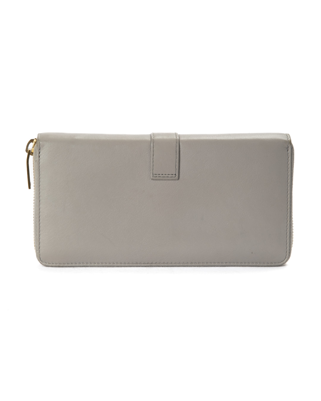 Portafoglio firmato Saint Laurent, modello College, realizzato in pelle liscia grigio con hardware dorato. Dotato di una chiusura semicircolare a zip, internamente rivestito in pelle con molteplici tasche tra cui una centrale, comodo per documenti e banconote. L'articolo si presenta in buone condizioni, con segni di usura visibili in foto.