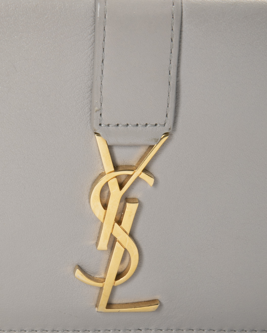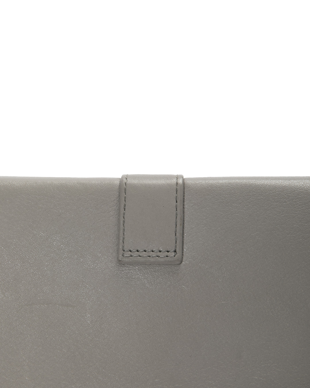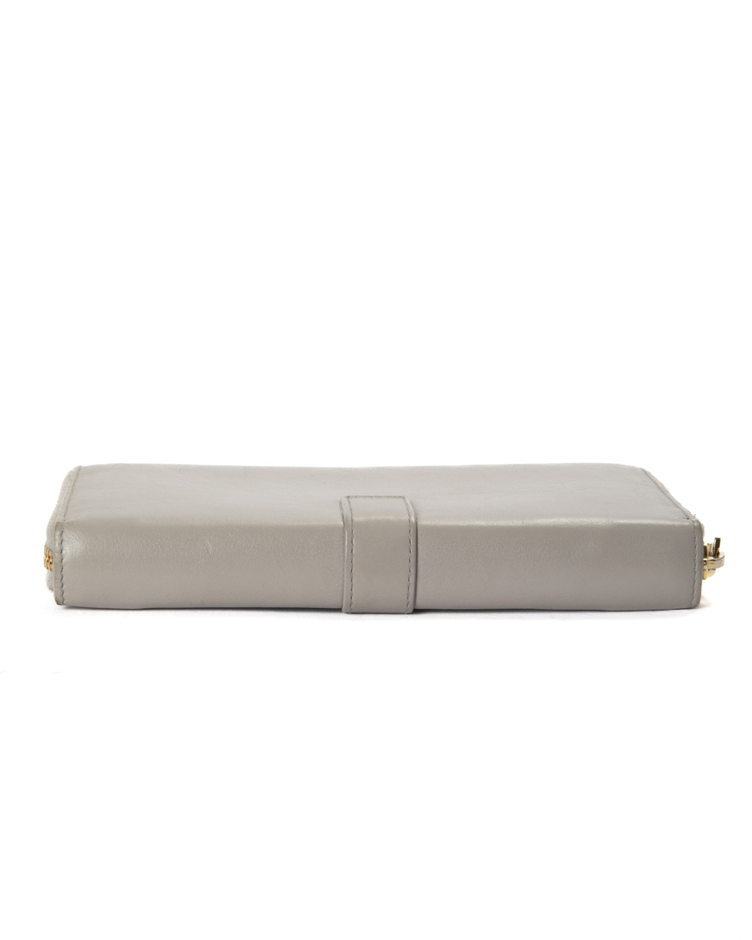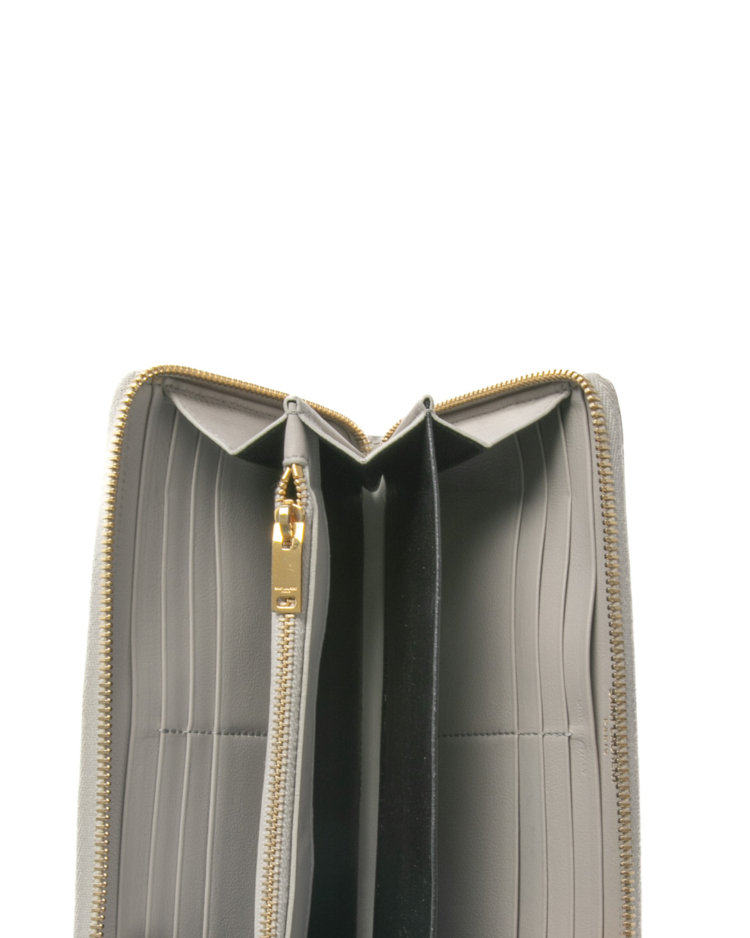 Portafoglio firmato Saint Laurent, modello College, realizzato in pelle liscia grigio con hardware dorato. Dotato di una chiusura semicircolare a zip, internamente rivestito in pelle con molteplici tasche tra cui una centrale, comodo per documenti e banconote. L'articolo si presenta in buone condizioni, con segni di usura visibili in foto.