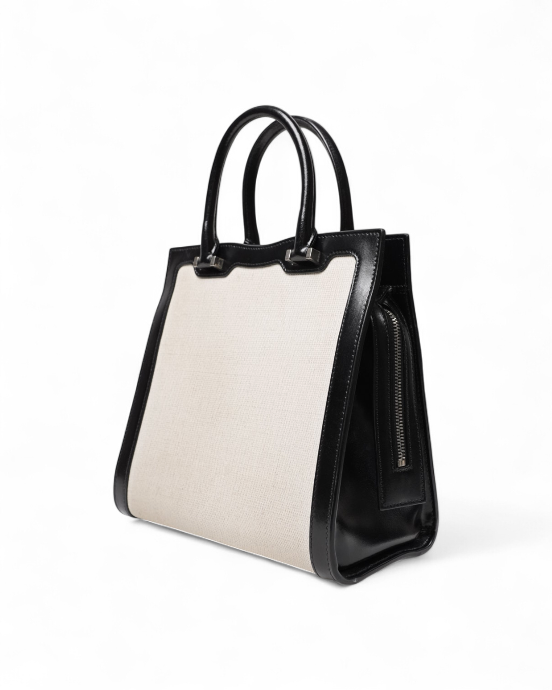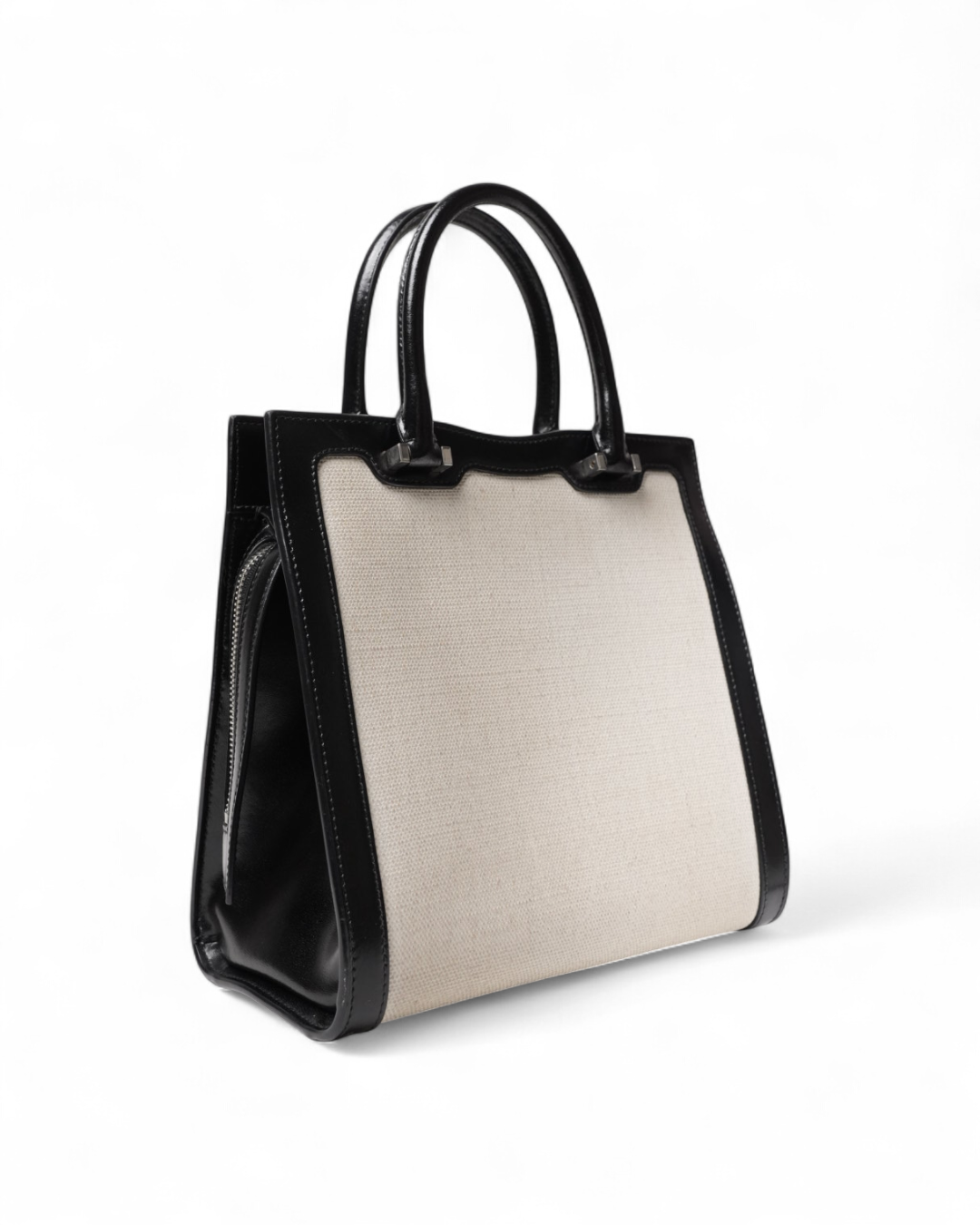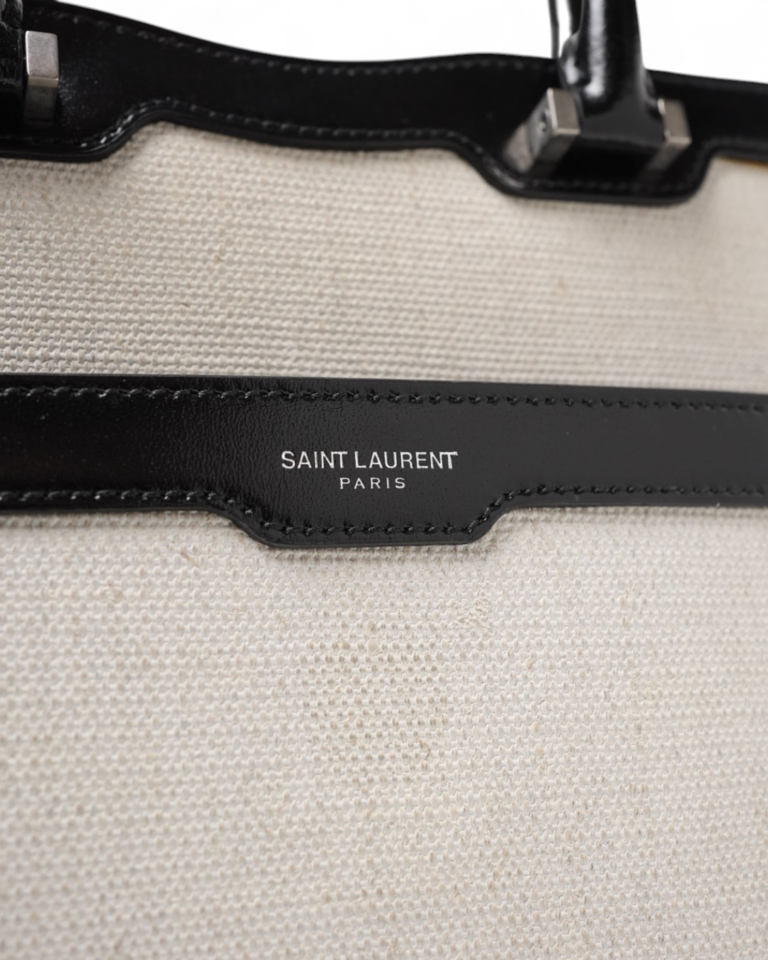 Borsa firmata Saint Laurent, modello Tote nella misura small, realizzata in tela beige con rifiniture in pelle lucida nera e hardware dorato. Dotata di una chiusura superiore a zip con doppio cursore, internamente rivestita in pelle liscia tono su tono con piccola tasca. Munita di doppio manico in pelle, per una comoda portata a mano. Arricchita da una tasca frontale aperta con all’interno una comoda pochette estraibile con il classico logo del brand “YSL” in metallo e chiusura magnetica. L’articolo si presenta in ottime condizioni.