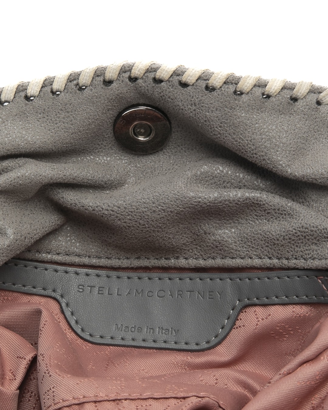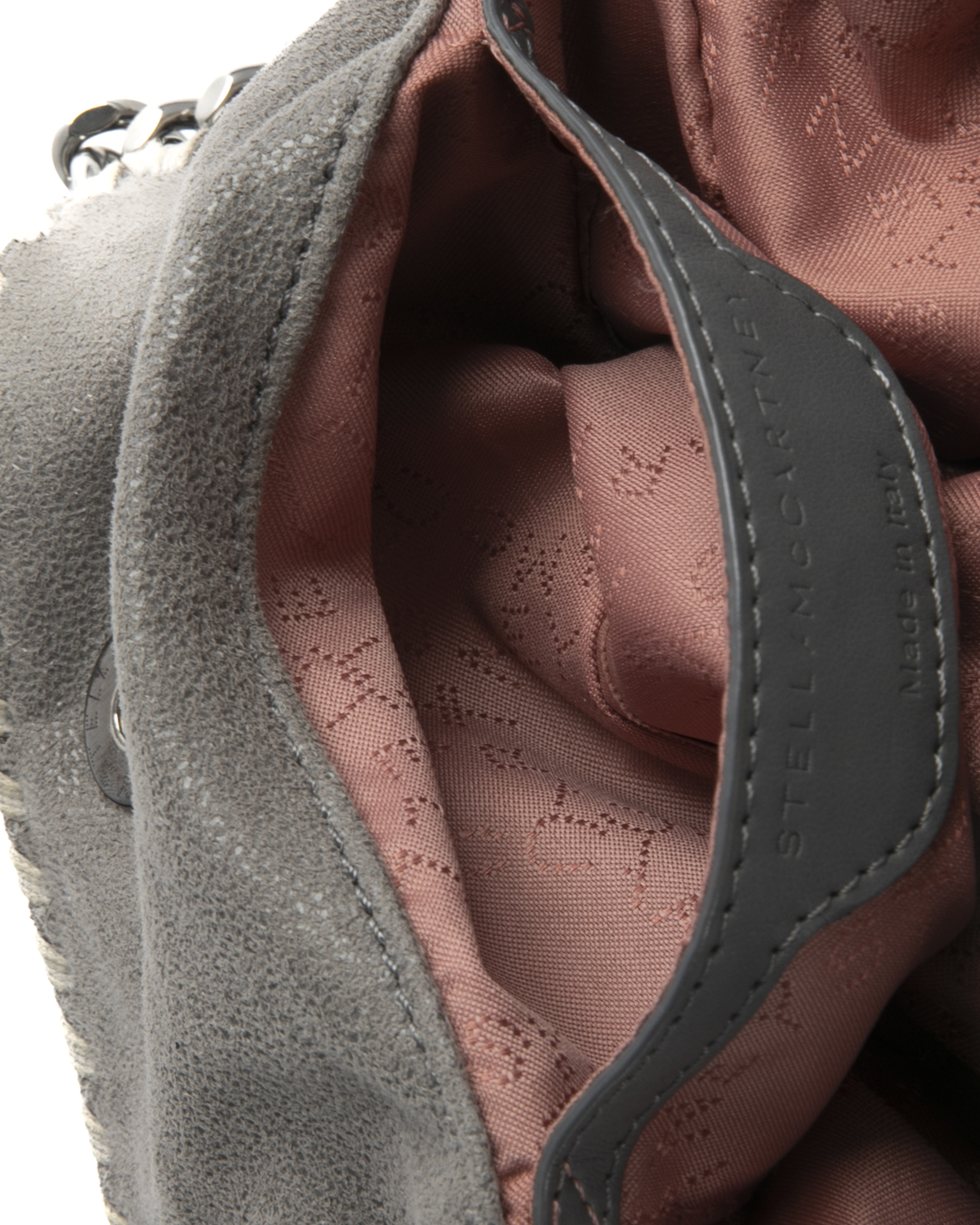 Borsa firmata Stella McCartney, modello 3 Chain nella misura medium, realizzata in tessuto scamosciato grigio con hardware argento. Dotata di una chiusura calamitata, internamente rivestita in tessuto logato rosa con comoda tasca, la borsa è abbastanza capiente. Munita di doppio manico e di una tracolla in catena, per una comoda portata a spalla o a mano. L’articolo si presenta in ottime condizioni.