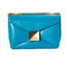 Borsa firmata Valentino, modello One Stud nella misura small, realizzata in pelle turchese con hardware dorato. Dotata di una patta frontale con chiusura calamitata, internamente rivestita in pelle tono su tono con comodi scompartimenti e tasche, la borsa è abbastanza capiente. Munita di una tracolla rimovibile in catena, per una comoda portata a spalla o a tracolla. L’articolo si presenta in buone condizioni.