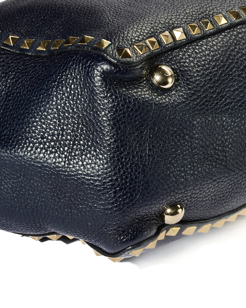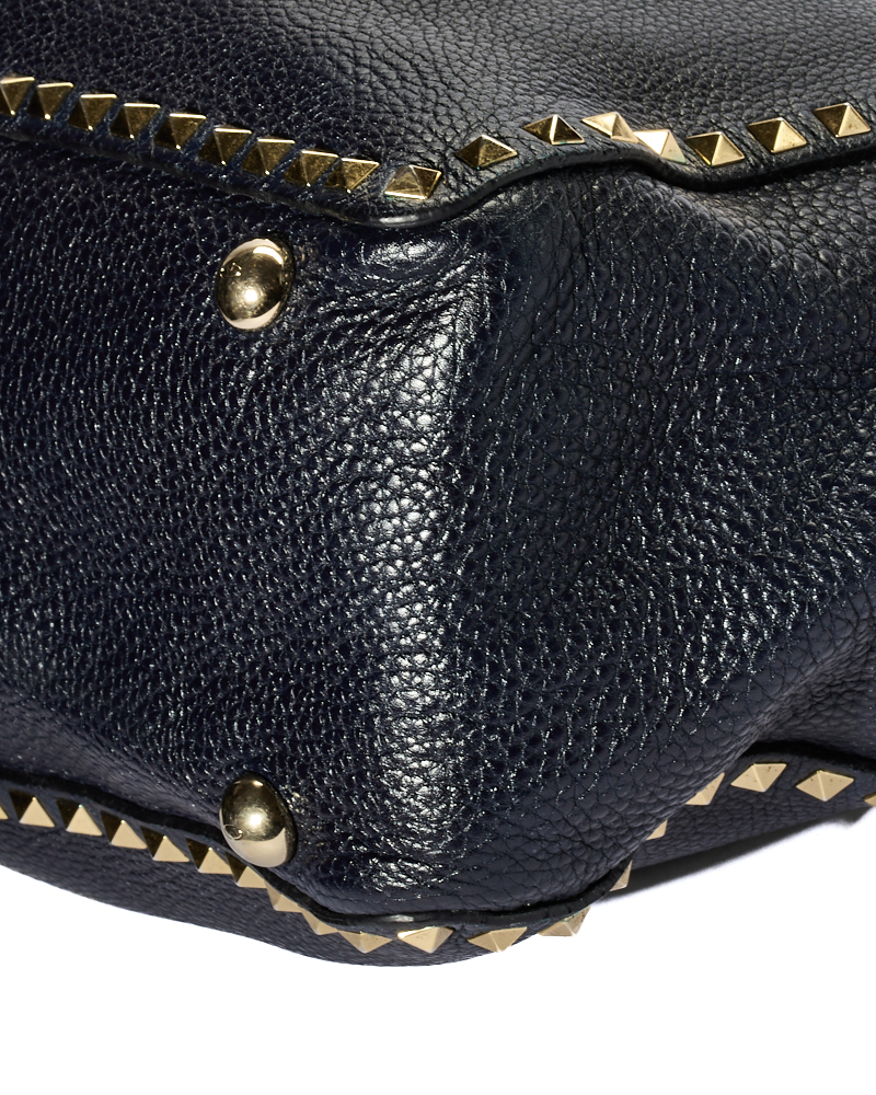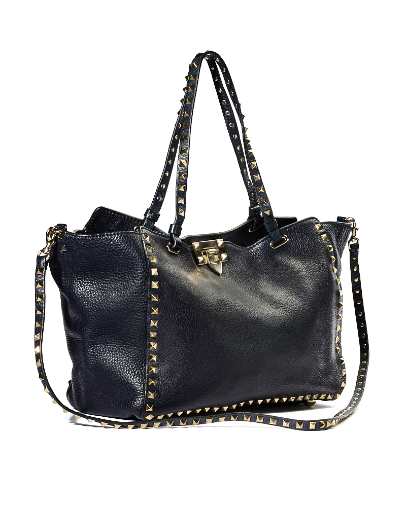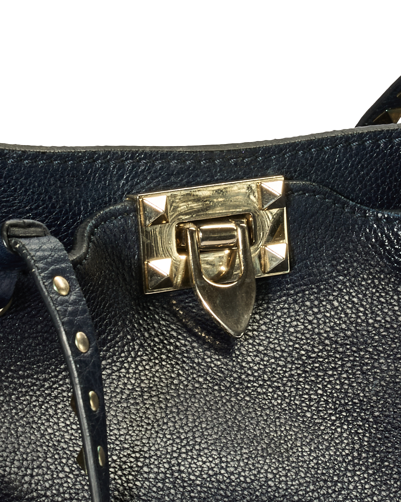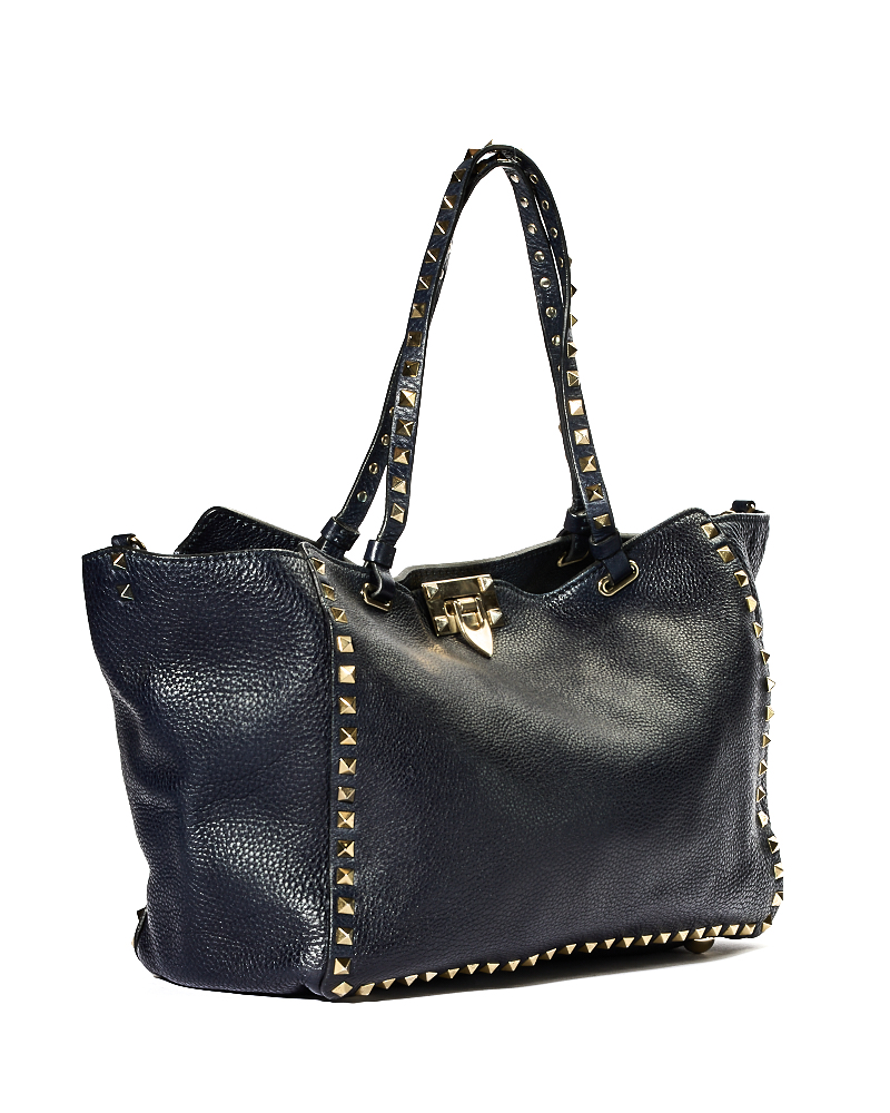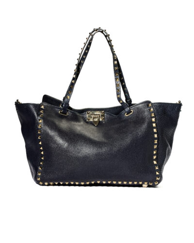 Borsa firmata Valentino, modello Rockstud Shopper nella misura large, realizzata in pelle granulata blu arricchita da borchie con hardware dorato. Dotata di una chiusura ad incastro, internamente rivestita in tessuto scamosciato tono su tono con comoda tasca, la borsa è abbastanza capiente. Munita di doppio manico e di una tracolla rimovibile, per una comoda portata a spalla o a tracolla. L’articolo si presenta in ottime condizioni.