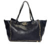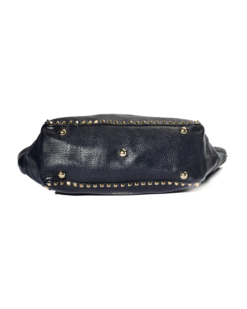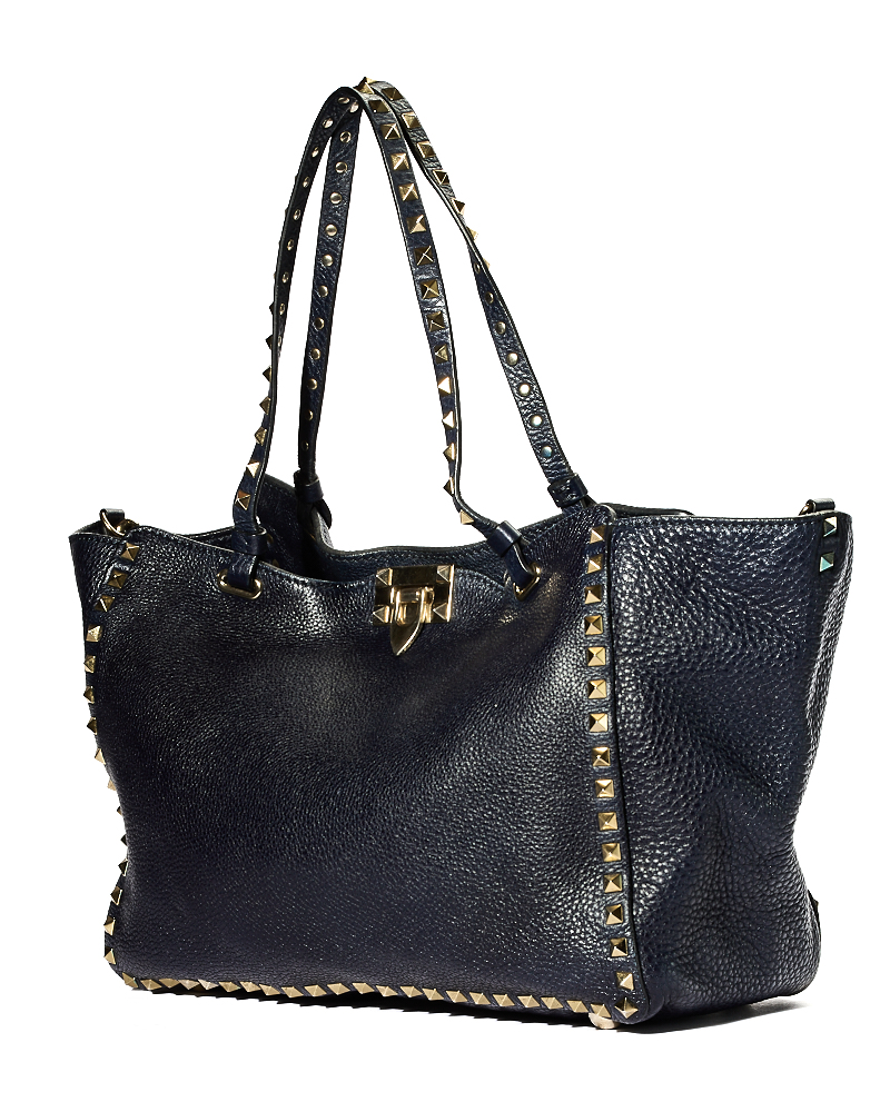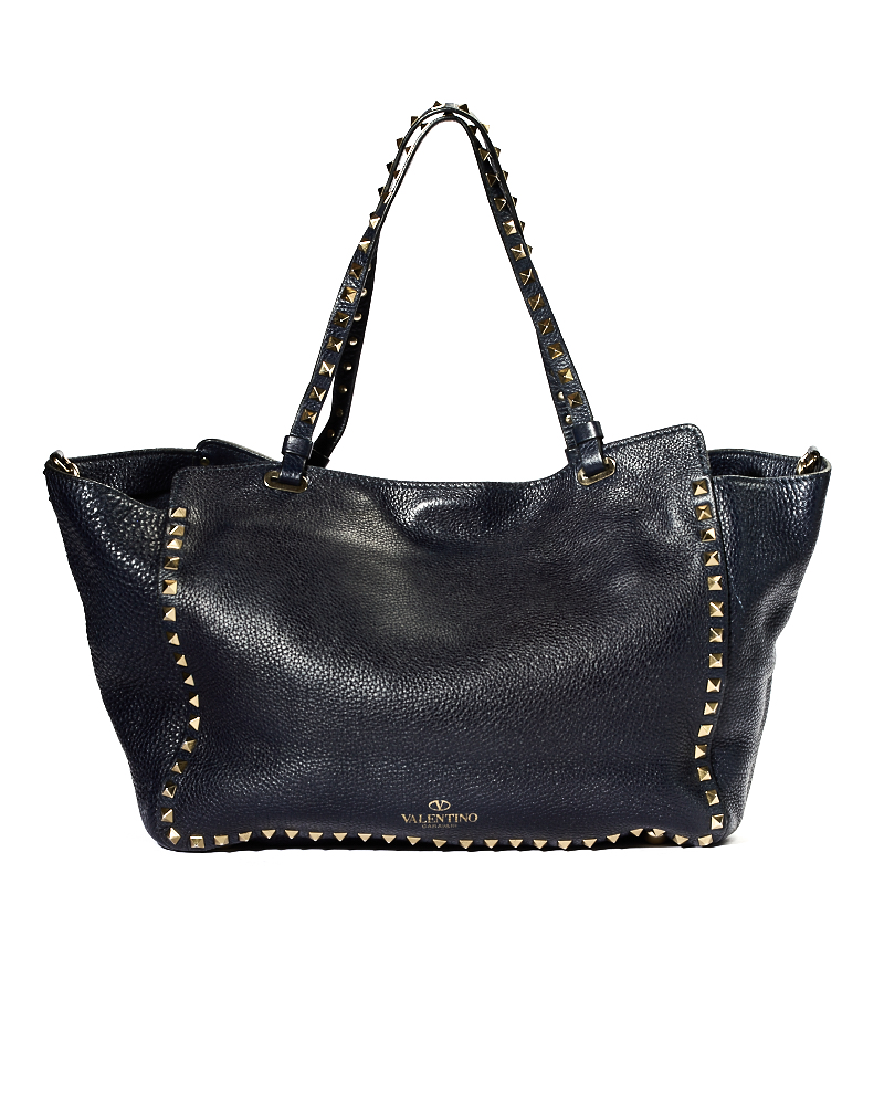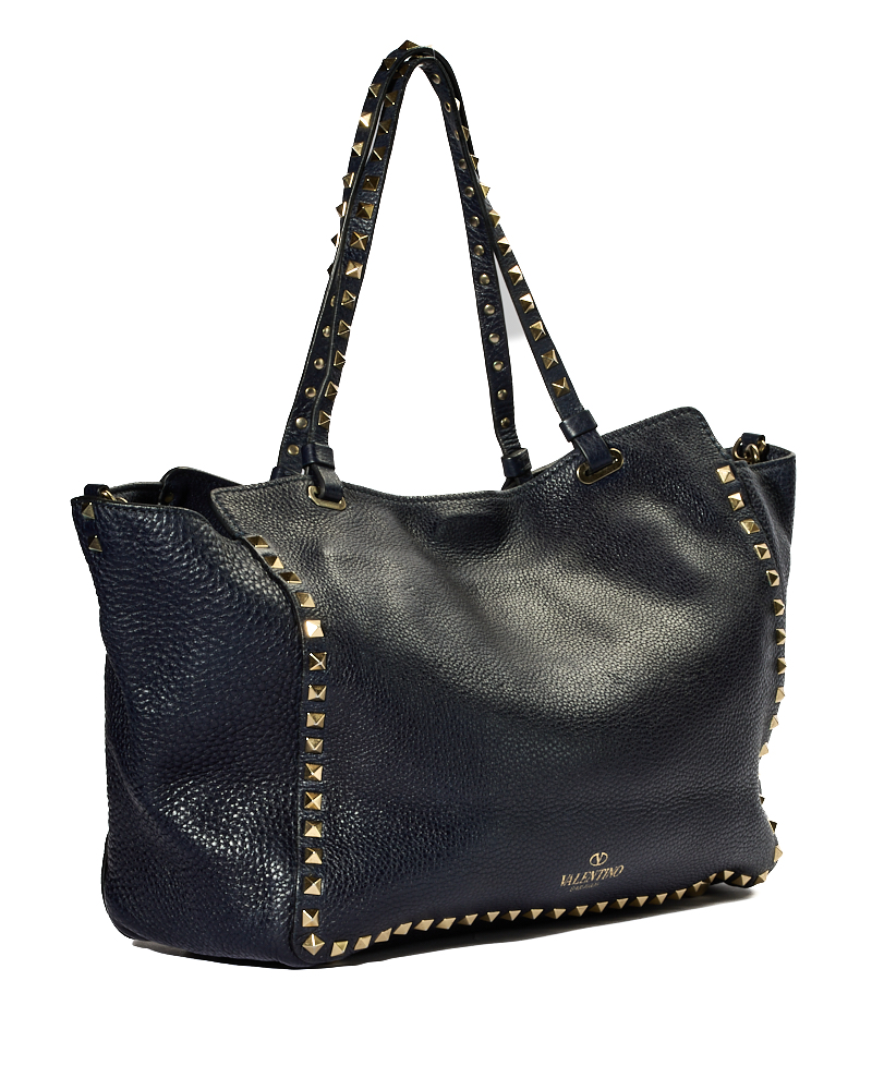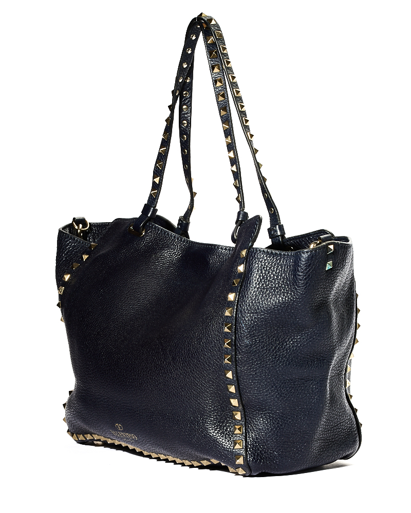 Borsa firmata Valentino, modello Rockstud Shopper nella misura large, realizzata in pelle granulata blu arricchita da borchie con hardware dorato. Dotata di una chiusura ad incastro, internamente rivestita in tessuto scamosciato tono su tono con comoda tasca, la borsa è abbastanza capiente. Munita di doppio manico e di una tracolla rimovibile, per una comoda portata a spalla o a tracolla. L’articolo si presenta in ottime condizioni.