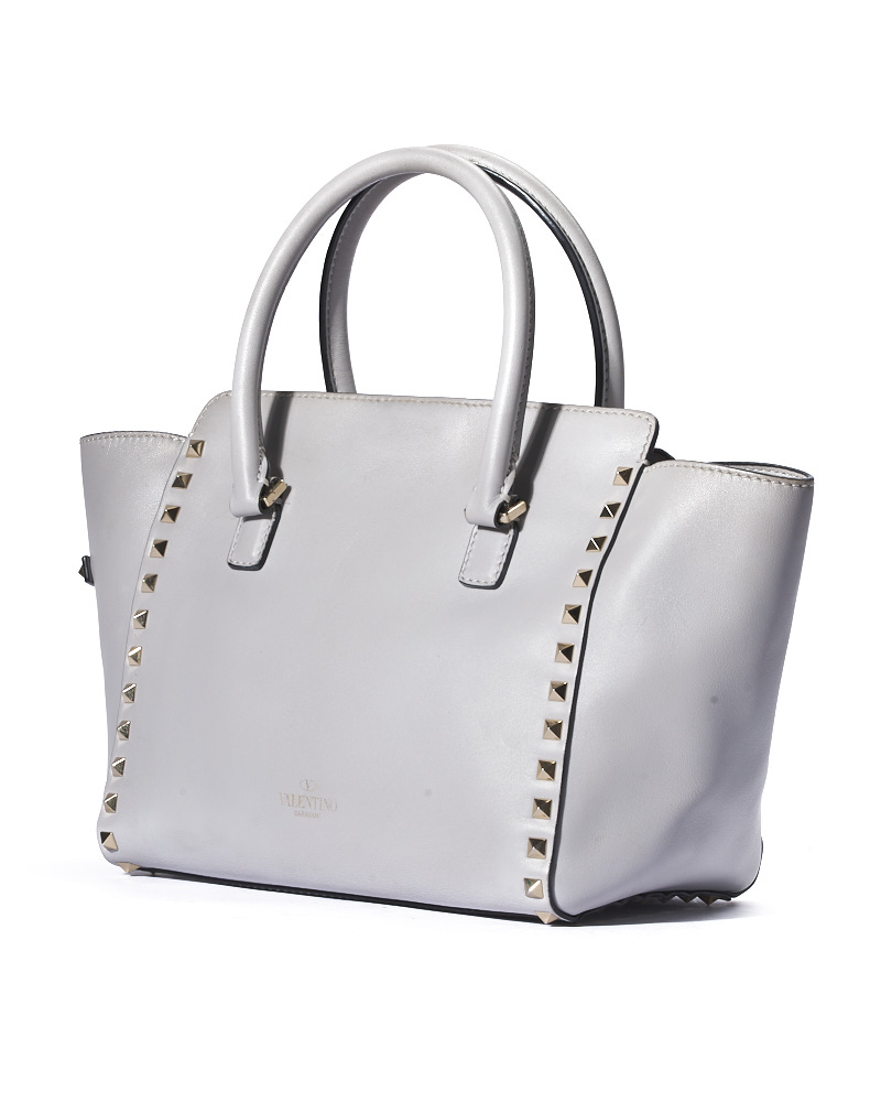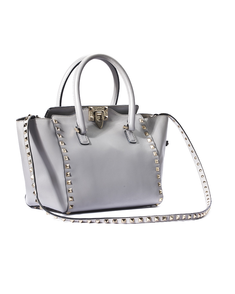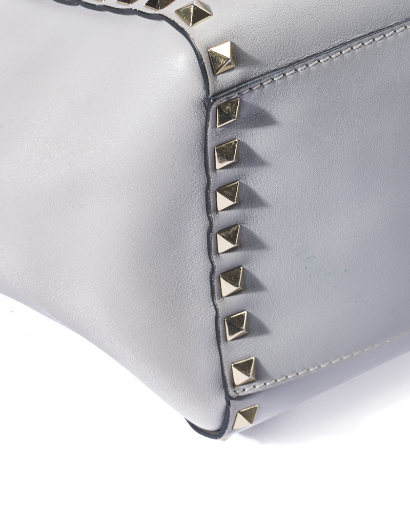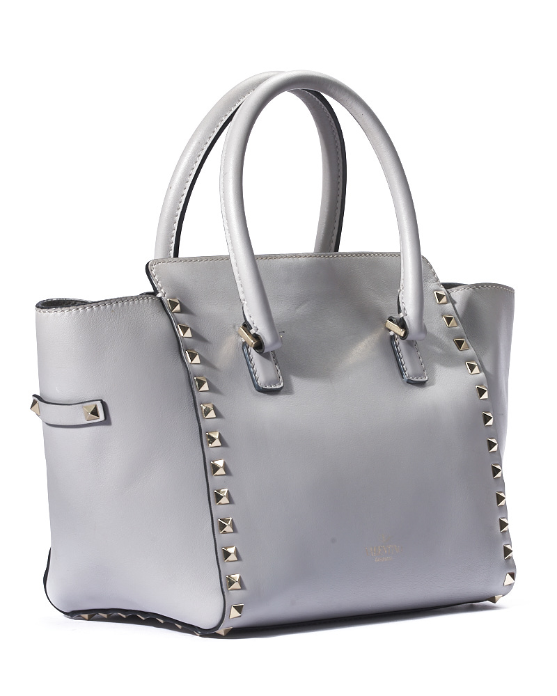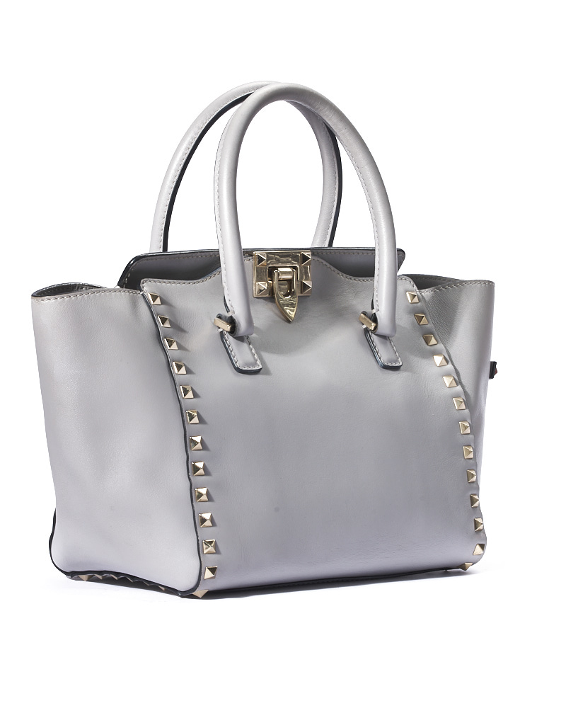 Borsa firmata Valentino, modello Rockstud nella misura small, realizzata in pelle liscia grigia arricchita da borchie e hardware dorato. Dotata di una chiusura ad incastro, internamente rivestita in tela gialla con comode tasche, la borsa è abbastanza capiente. Munita di doppio manico e di una tracolla rimovibile, per una comoda portata a mano o a spalla. L’articolo si presenta in buone condizioni, con segni di usura visibili in foto.