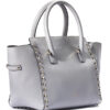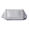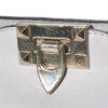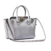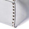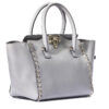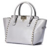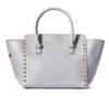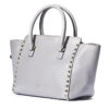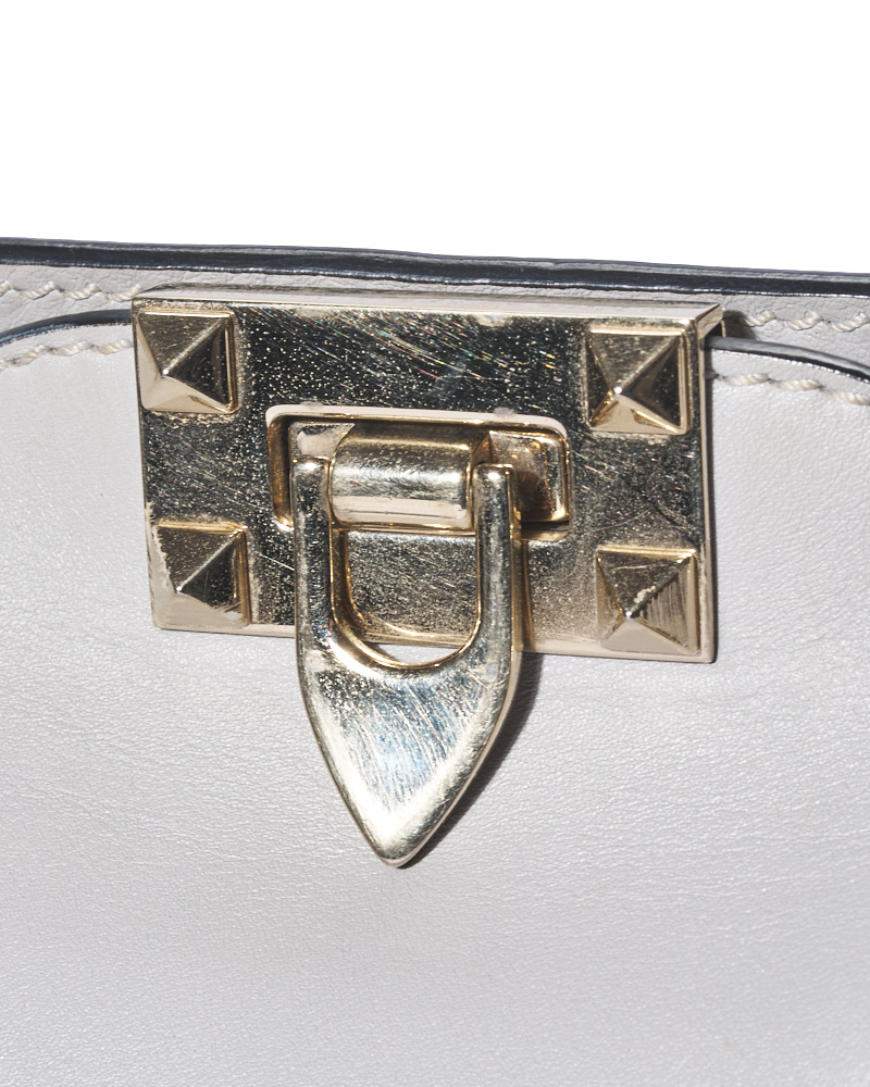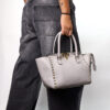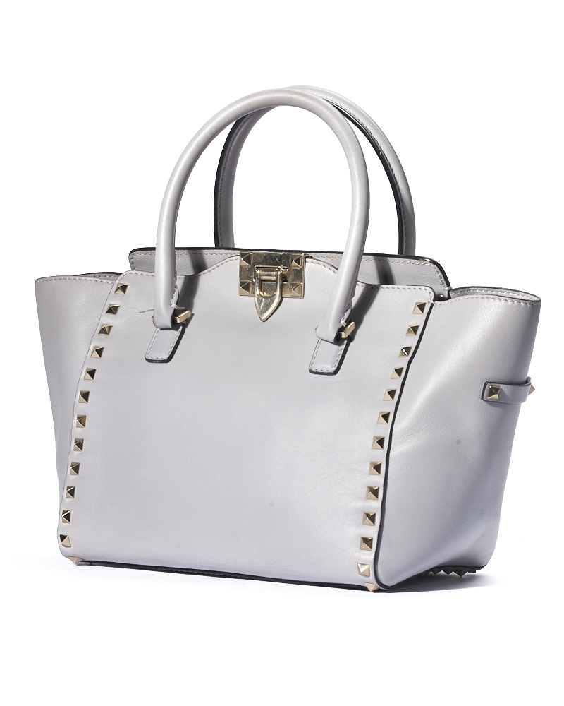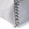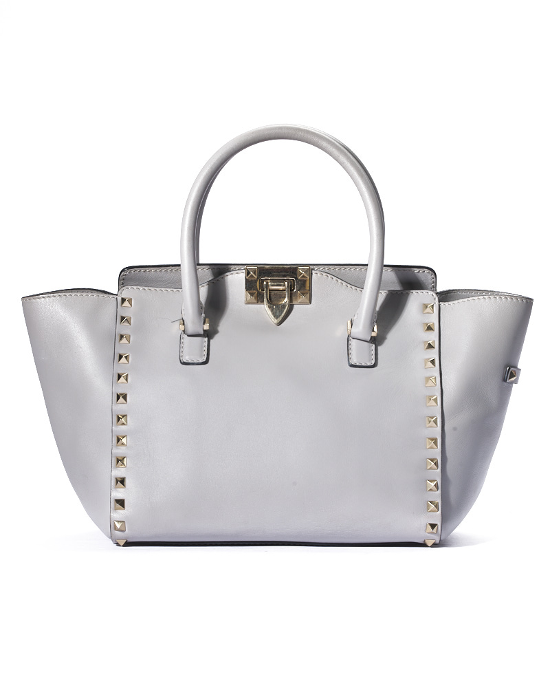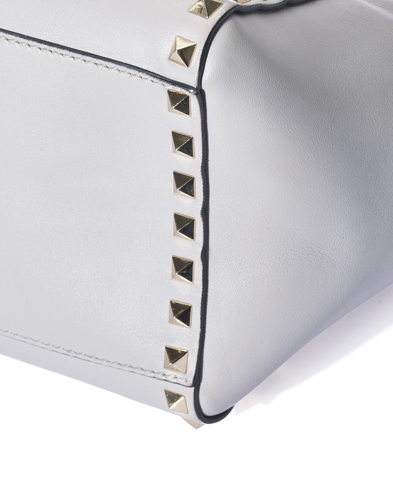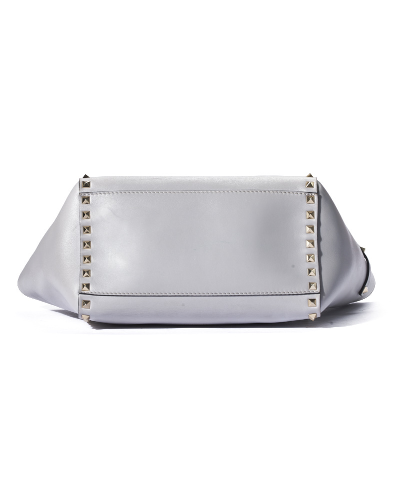 Borsa firmata Valentino, modello Rockstud nella misura small, realizzata in pelle liscia grigia arricchita da borchie e hardware dorato. Dotata di una chiusura ad incastro, internamente rivestita in tela gialla con comode tasche, la borsa è abbastanza capiente. Munita di doppio manico e di una tracolla rimovibile, per una comoda portata a mano o a spalla. L’articolo si presenta in buone condizioni, con segni di usura visibili in foto.