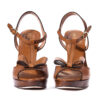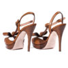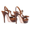 Sandali firmati Valentino, modello alto, realizzati in cuoio marrone con hardware dorato. Caratterizzati da una fascia arricchita da un fiocco sulla parte frontale e chiusura regolabile alla caviglia. Numero 40IT. Presentano un tacco alto 13.5 centimetri. L’articolo si presenta in buone condizioni, con segni di usura visibili in foto.
