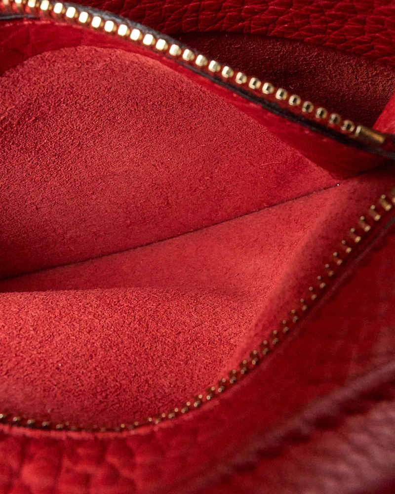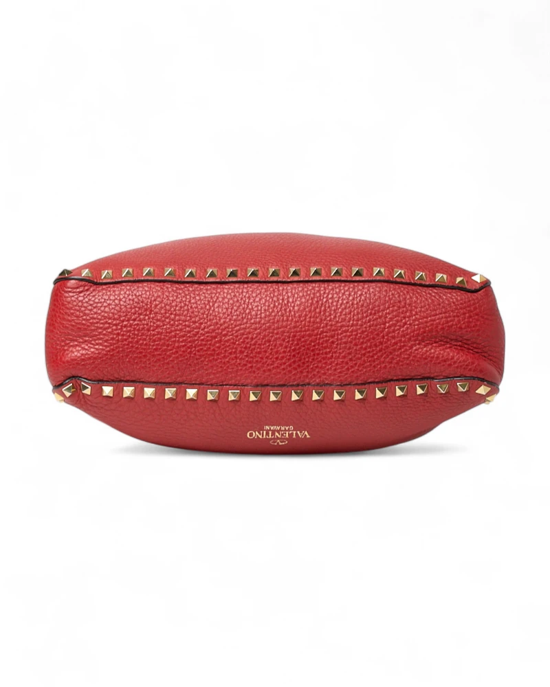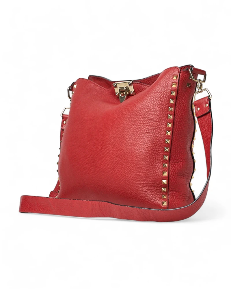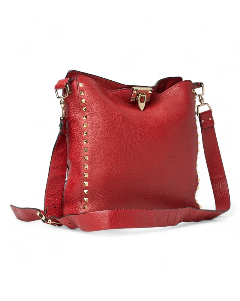 Borsa firmata Valentino, modello Rockstud nella misura medium, realizzata in pelle granulata rossa arricchita da borchie dorate. Dotata di una chiusura ad incastro, internamente rivestita in tessuto scamosciato tono su tono con comoda tasca, la borsa è abbastanza capiente. Munita di una tracolla regolabile, per una comoda portata a spalla o a tracolla. L’articolo si presenta in buone condizioni.